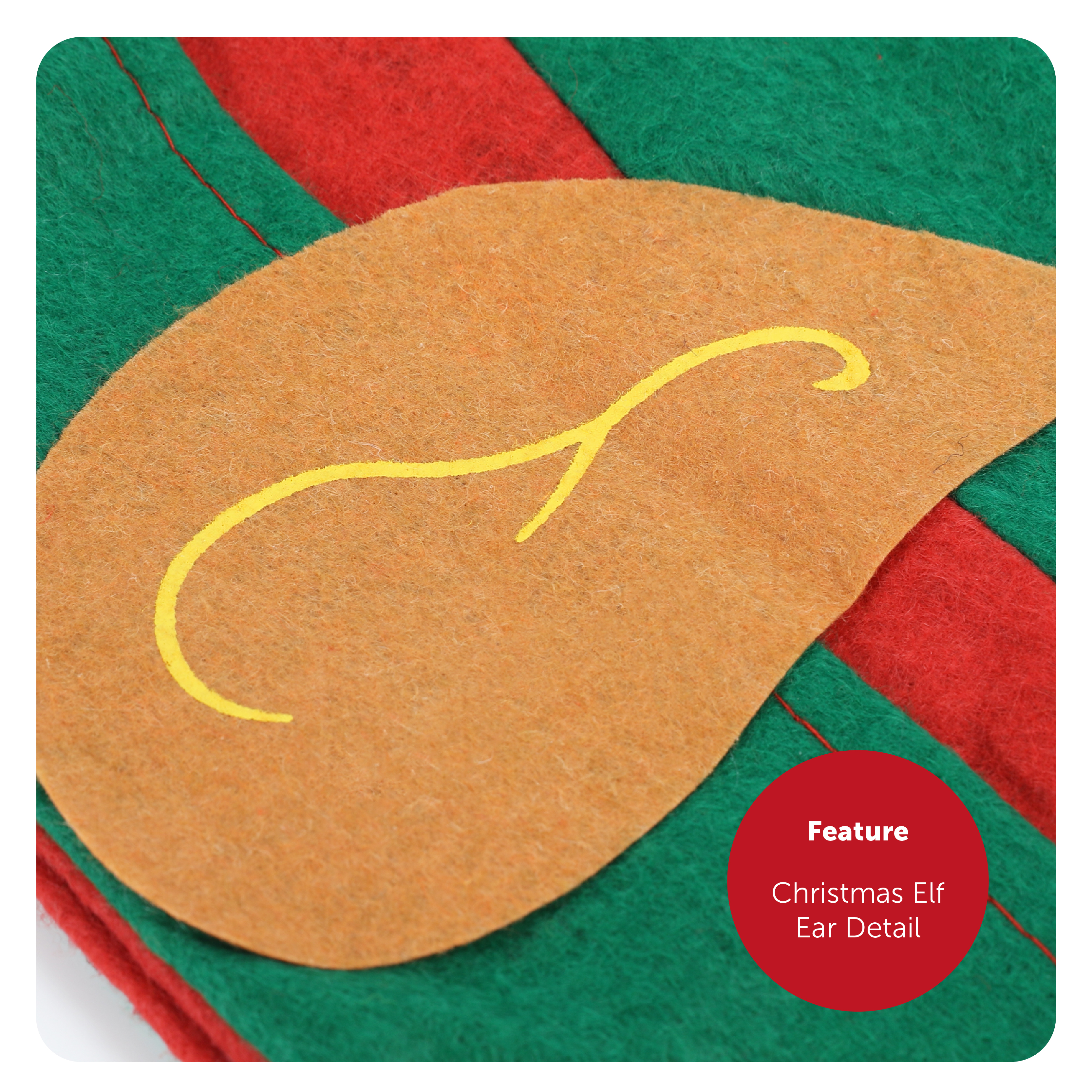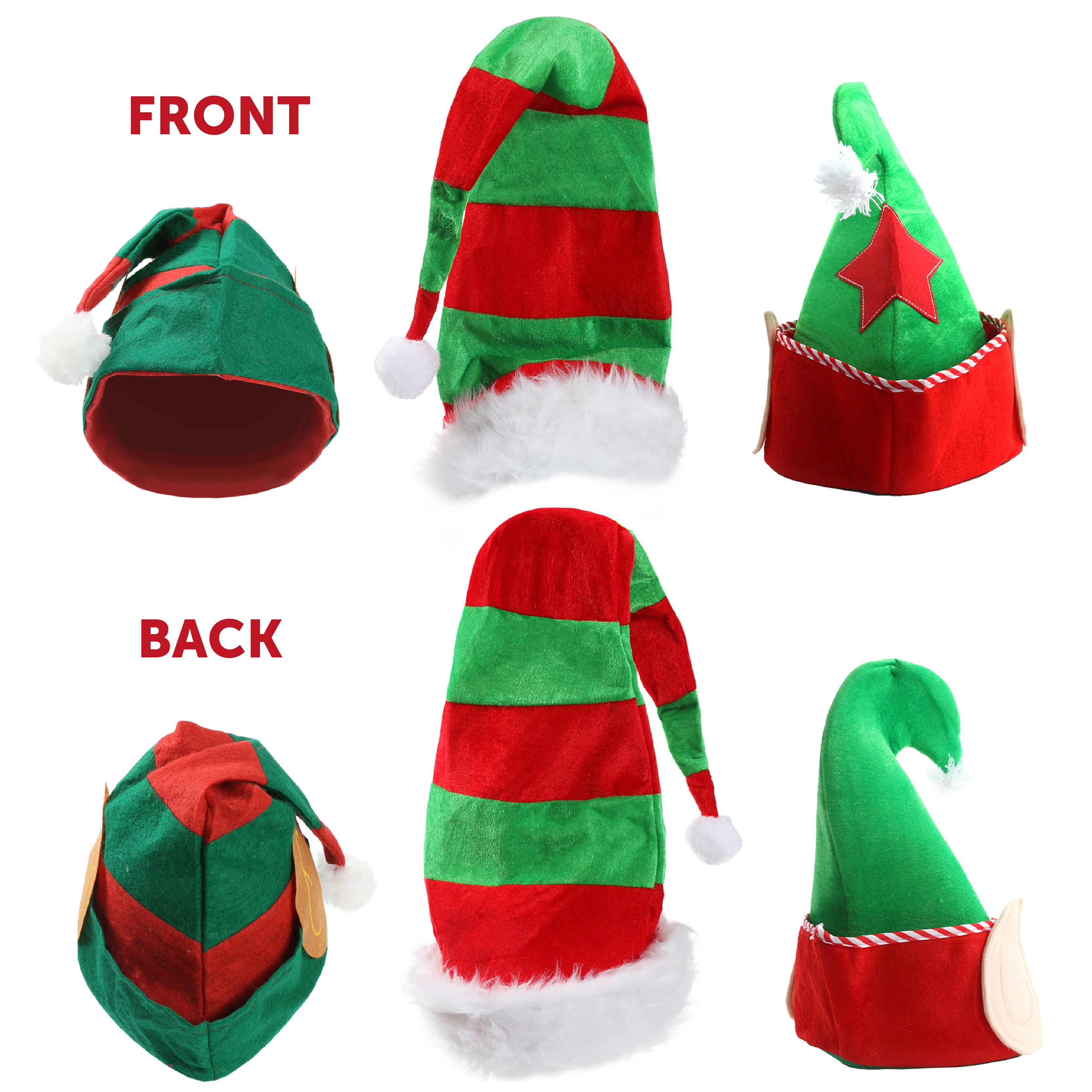 SET INCLUDES: This Elf Hat Set includes 3 different styled Elf Hats, 1x Long Red and Green Striped Hat with a soft White Pom-Pom, and a wired frame inside to shape the Hat any way you want, 1x Vibrant Green Hat with a Red Star detailed on the front, a White Pom-Pom, and Elf Ears on either side, and 1x Red and Green Striped Hat with a White Pom-Pom on the tip and Elf Ears on either side!