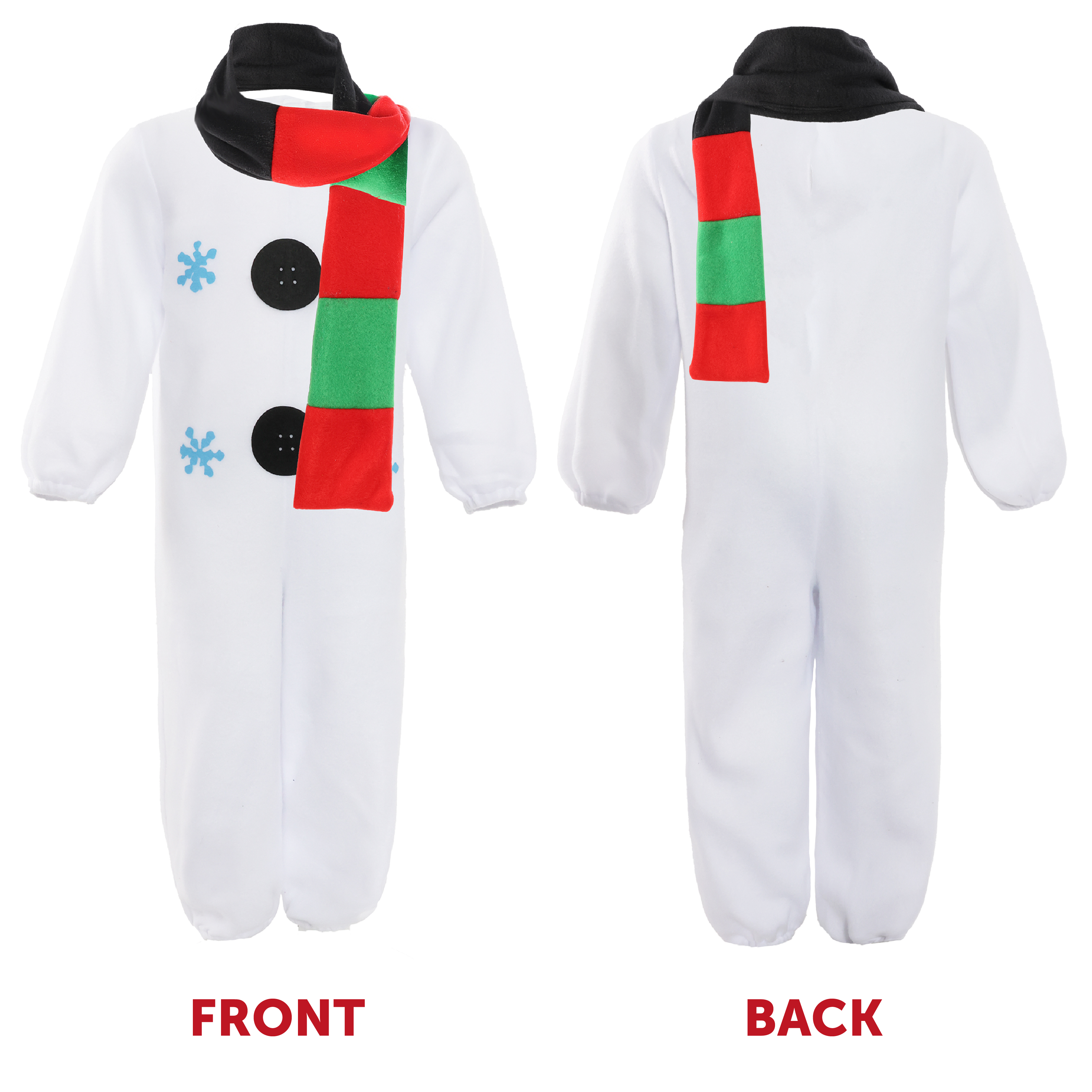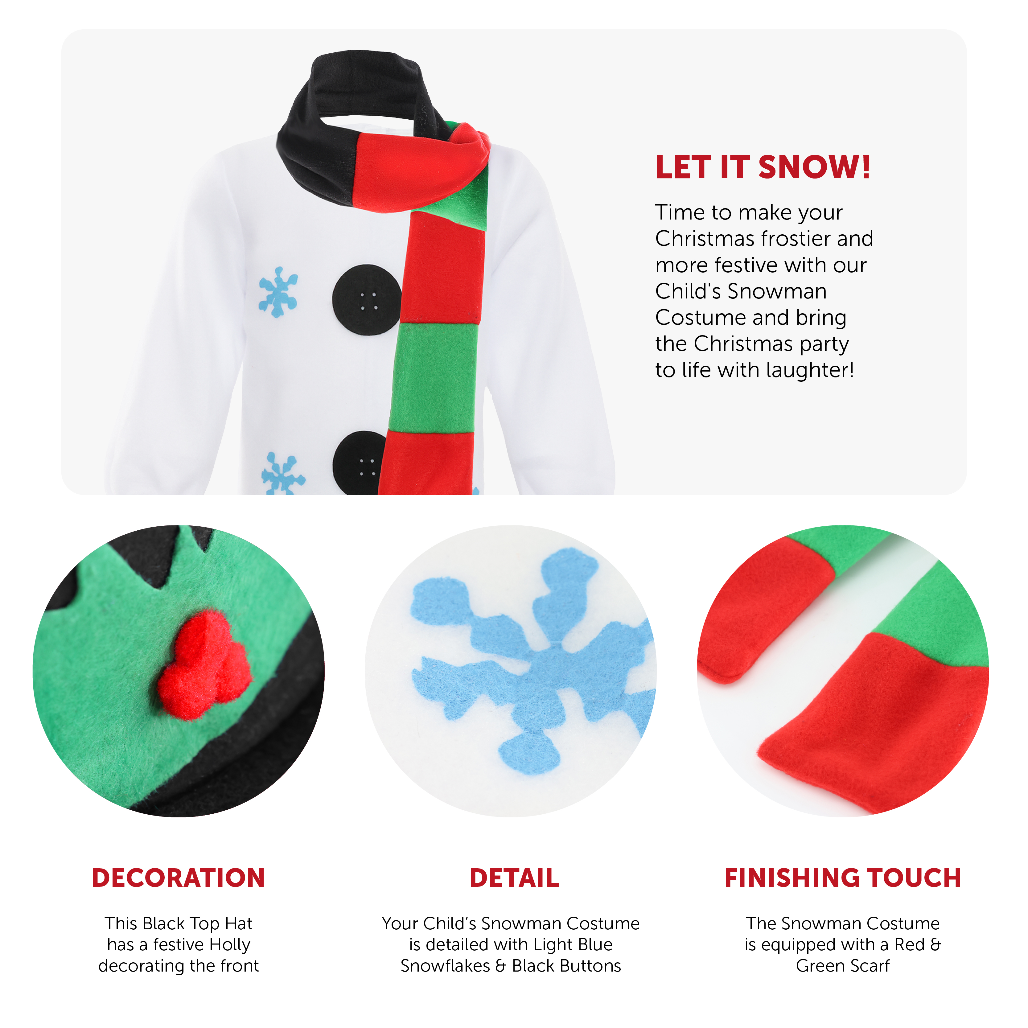 COSTUME DETAILS: Your Child's Snowman Costume includes a Black Top Hat decorated with Holly, a White Jumpsuit detailed with Black Buttons and Blue Snowflakes, and a Red and Green Striped Scarf, to complete the classic and iconic Snowman look!