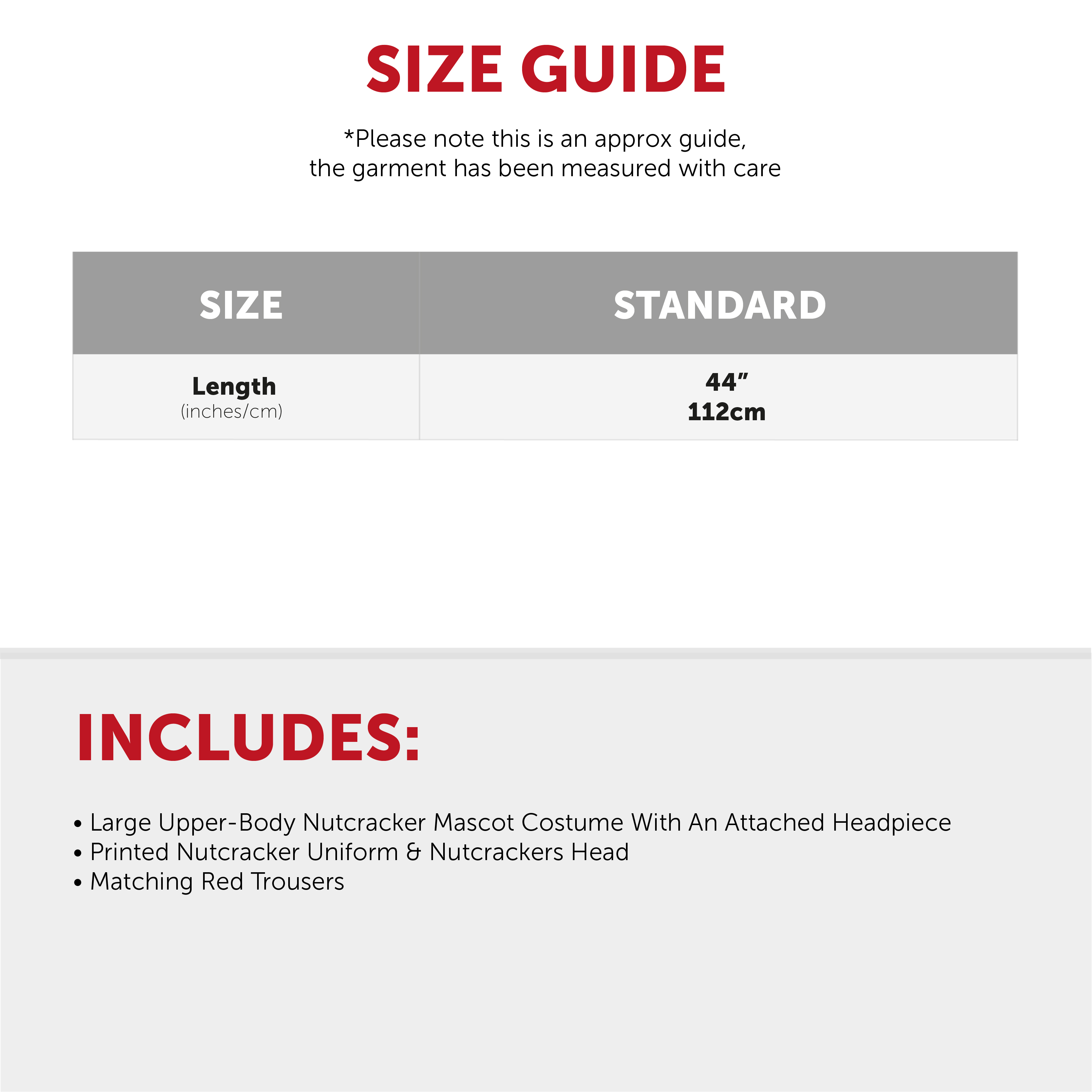 CHRISTMAS NUTCRACKER MASCOT DETAILS: Your Christmas Nutcracker Mascot Costume is a large upper-body Nutcracker Mascot Costume with an attached headpiece detailing Nutcracker uniform, Nutcrackers head, and matching red trousers!