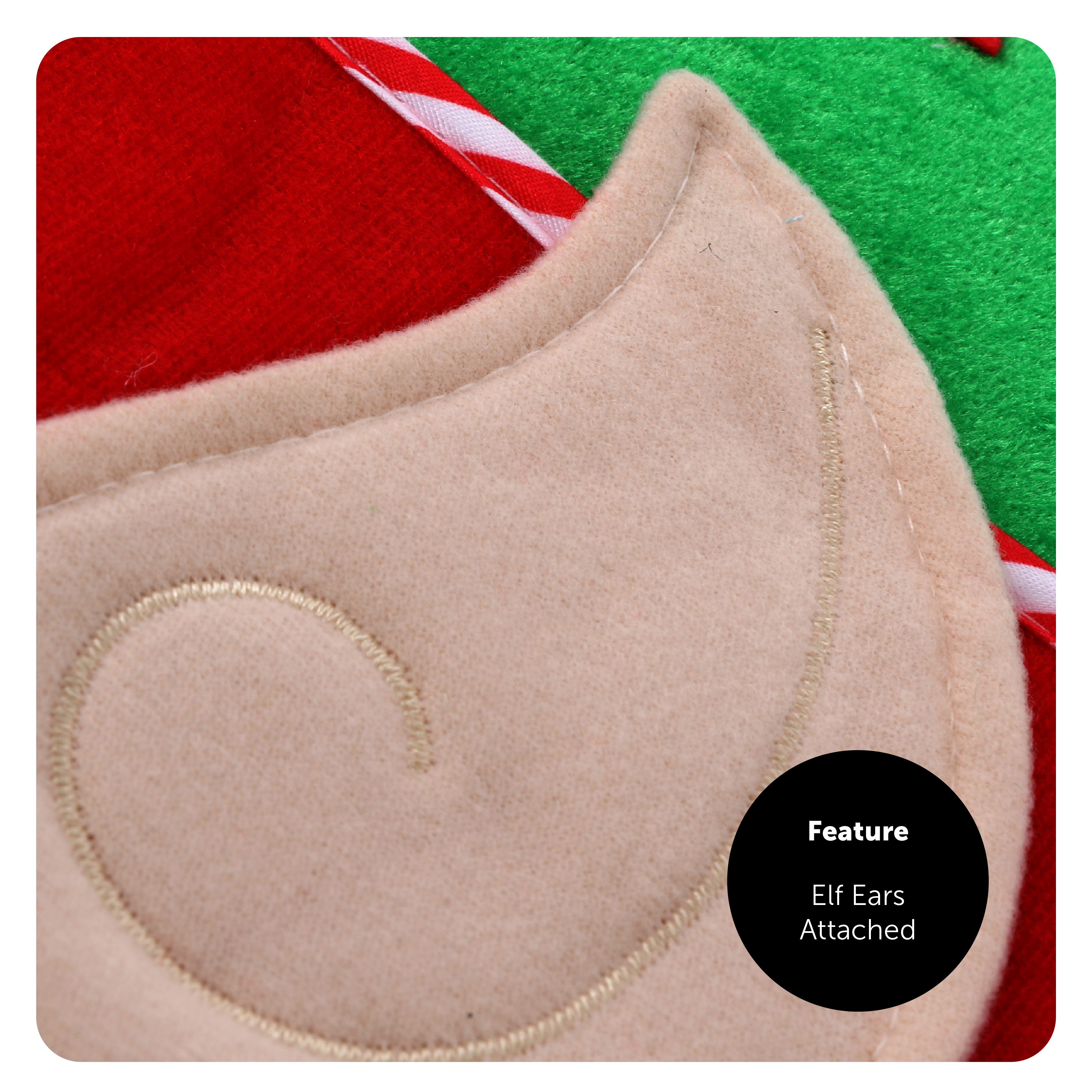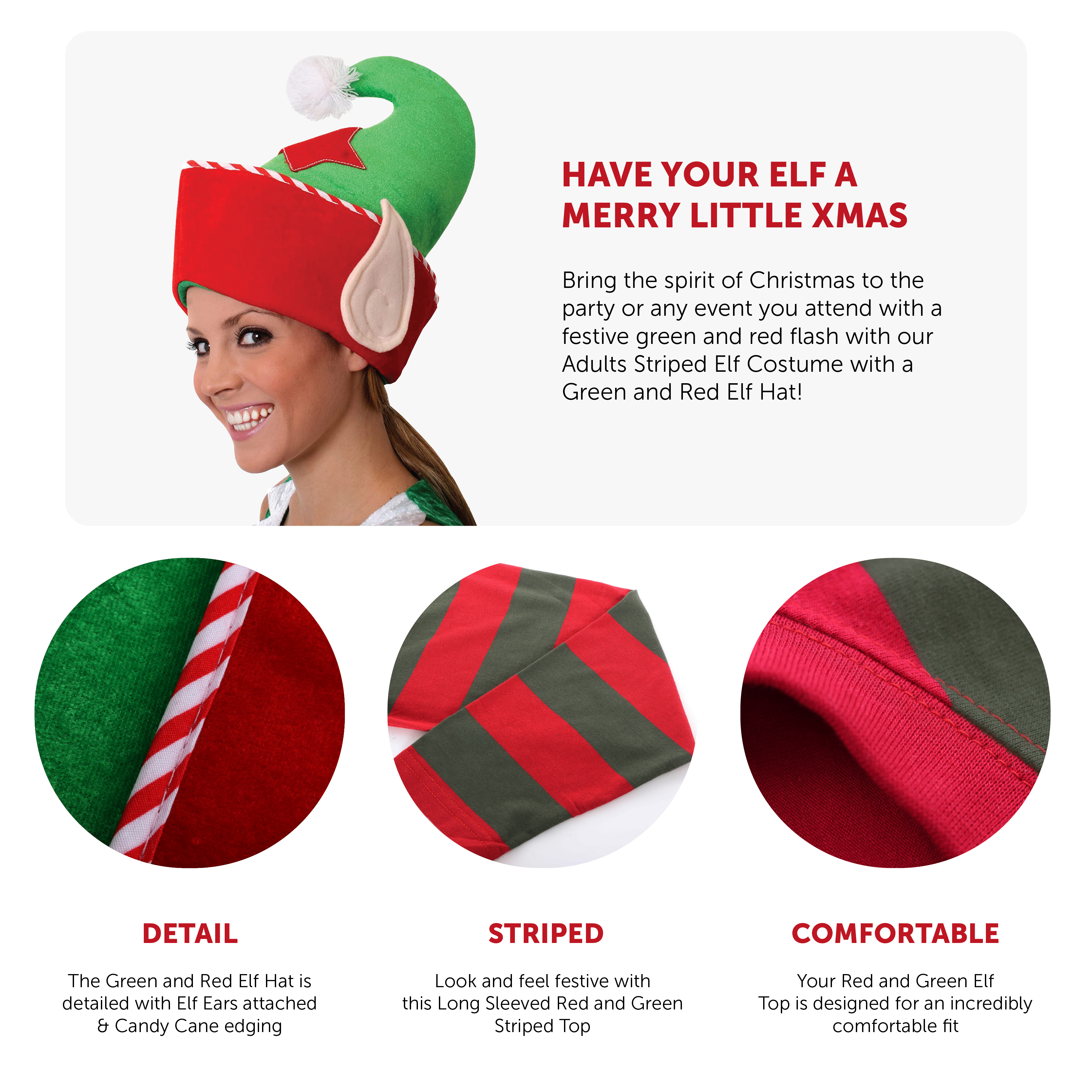 COSTUME DETAILS: Your Adults Elf Costume includes a long sleeved Top with Red and Green Stripes all over, and a tall Green Elf Hat with a Red Star on the front, Red and White Candy Cane styled edging, a White Pom-Pom and attached Elf Ears on either side!