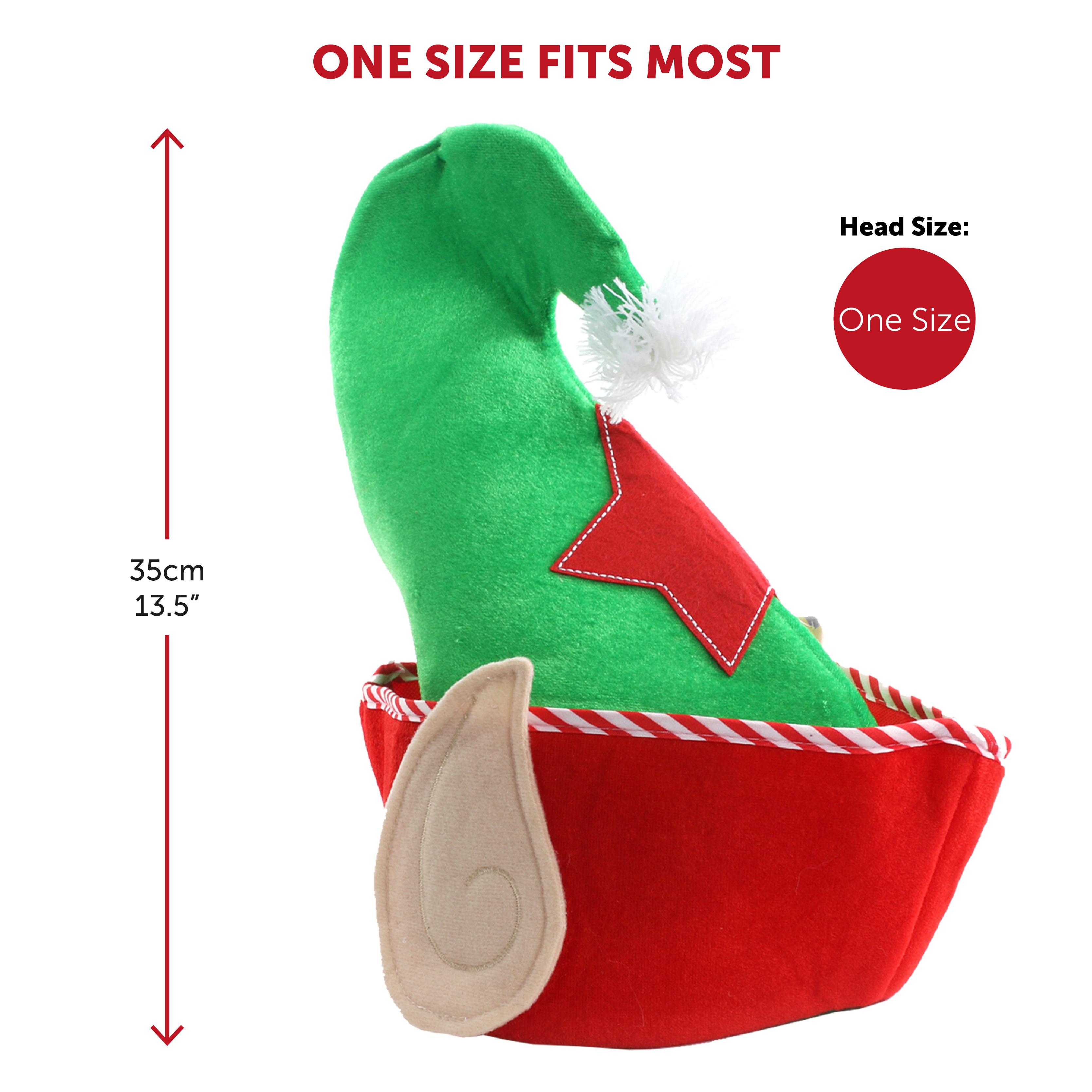 ONE SIZE HAT: The Elf Hat is a comfortable one size, designed to suitably fit most Adults, standing tall at a height measuring 35cm (13.5"), the perfect finishing touch you need for this festive look!