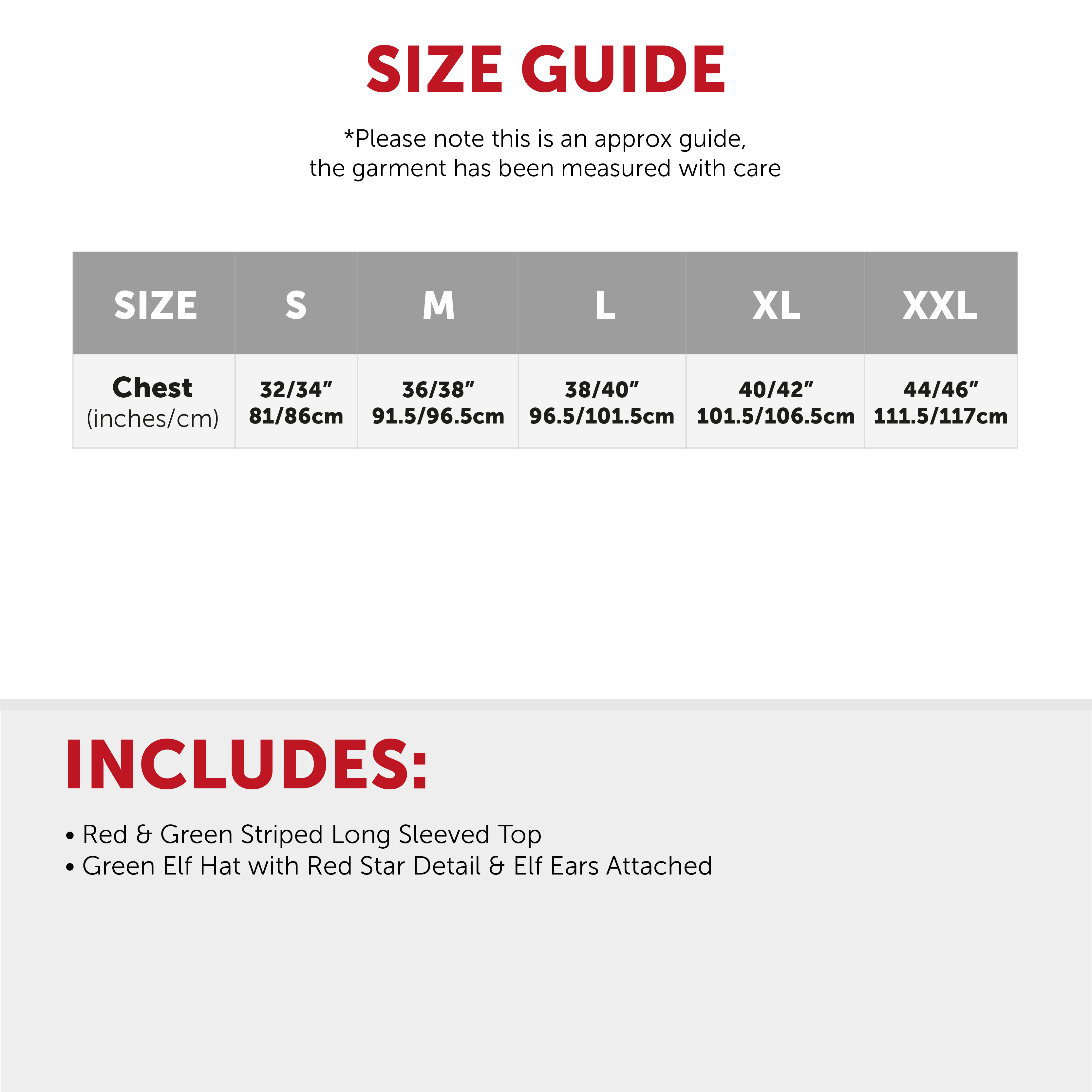 AVAILABLE IN MULTIPLE SIZES: Our Adults Red and Green Striped Top is available in multiple sizes, ranging from Small to XX-Large: Small - Chest: 32/34" (81/86cm) | Medium - Chest: 36/38" (91.5/96.5cm) | Large - Chest: 38/40" (96.5/101.5cm) | X-Large - Chest: 40/42" (101.5/106.5cm) | XX-Large - Chest: 44/46" (111.5/117cm)