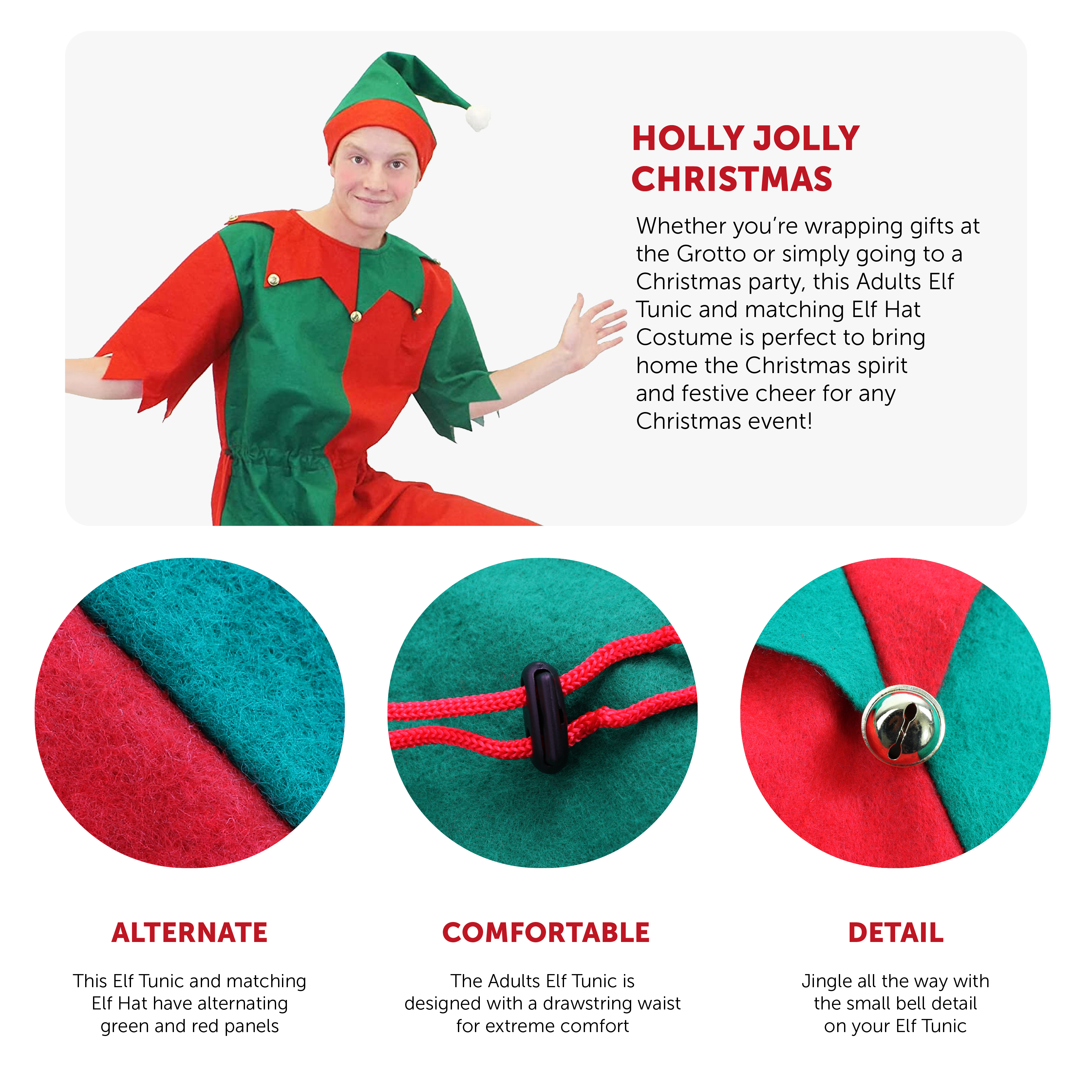 COSTUME INCLUDES: Your Adults Elf Tunic Unisex Costume will include a Green and Red Elf Tunic with an attached collar with gold buttons, and a matching Elf hat with a white bobble to complete the look!