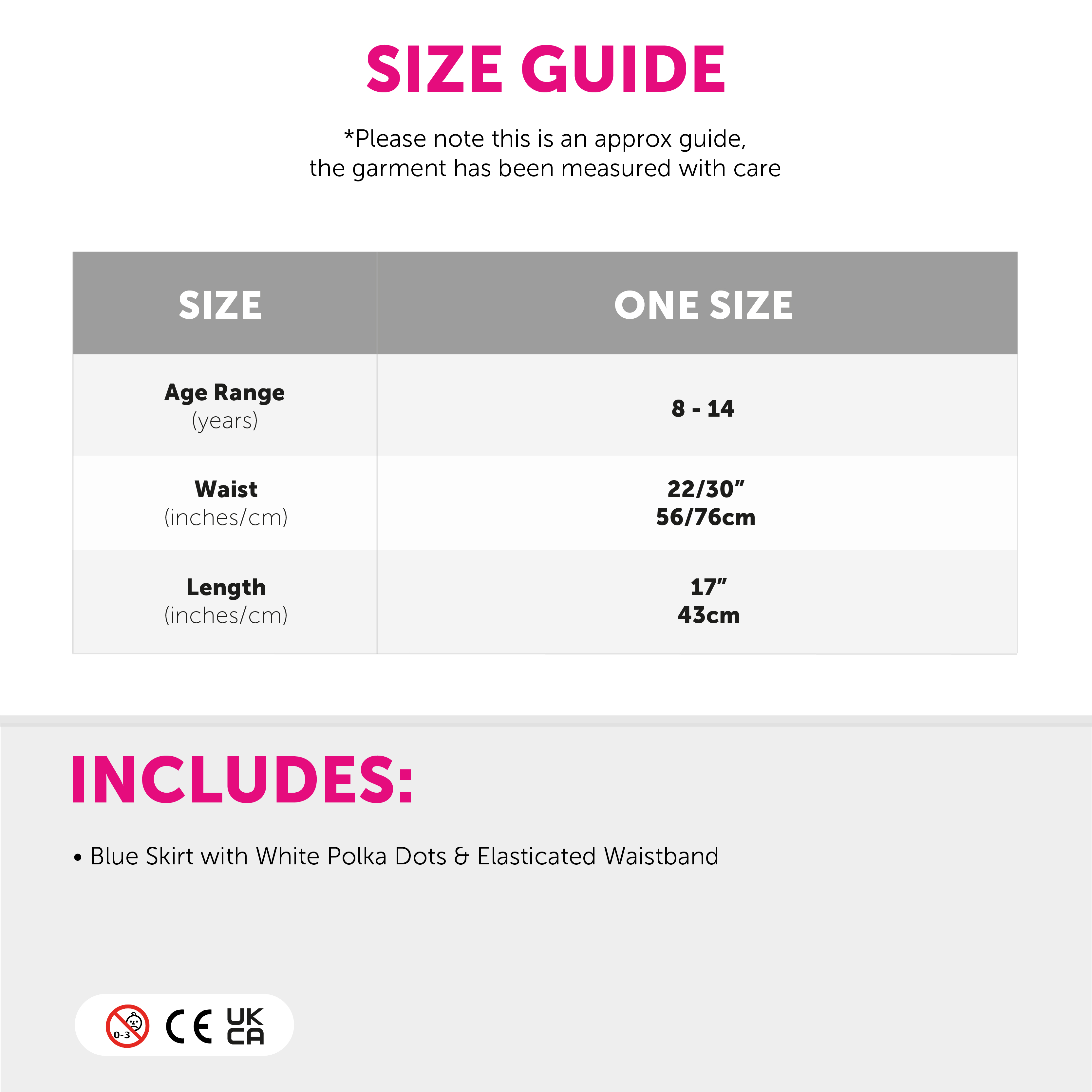 AVAILABLE IN ONE SIZE: Your Girls Blue Polka Dot Skirt is available in one size only; Age Range 8 - 14 years, Waist 22/30" (56/76cm), Length 17" (43cm)