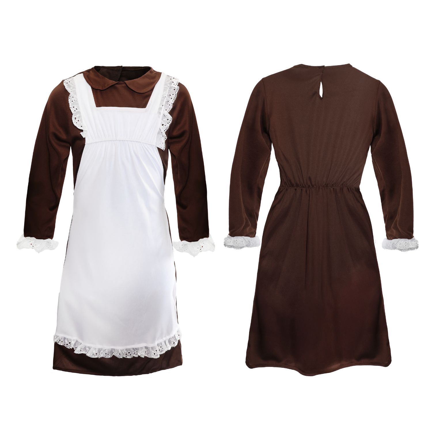 The traditional brown dress features long sleeves and delicate white frilly edging, with a long white apron attached for an authentic orphan-era, countryside look inspired by Anne of Green Gables.