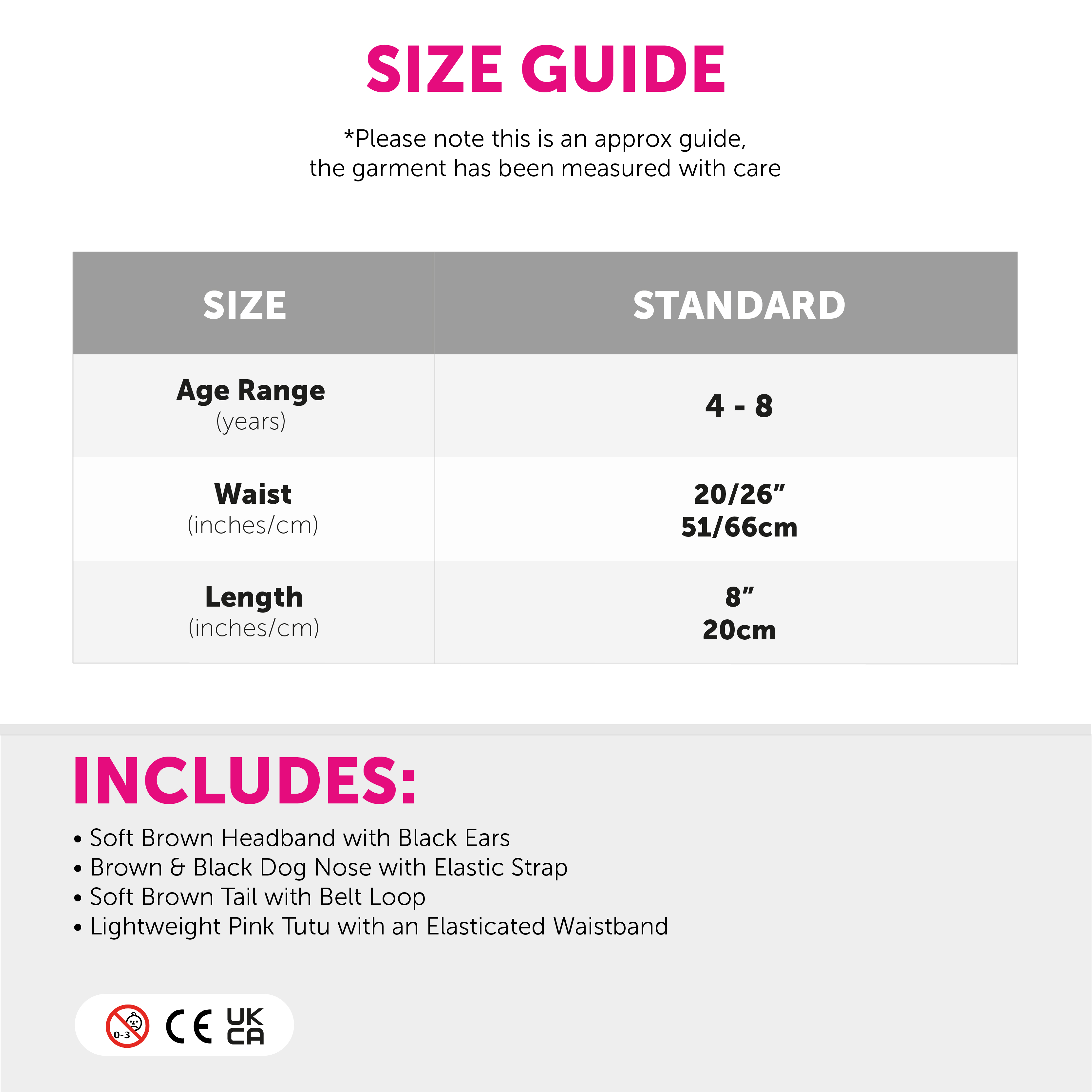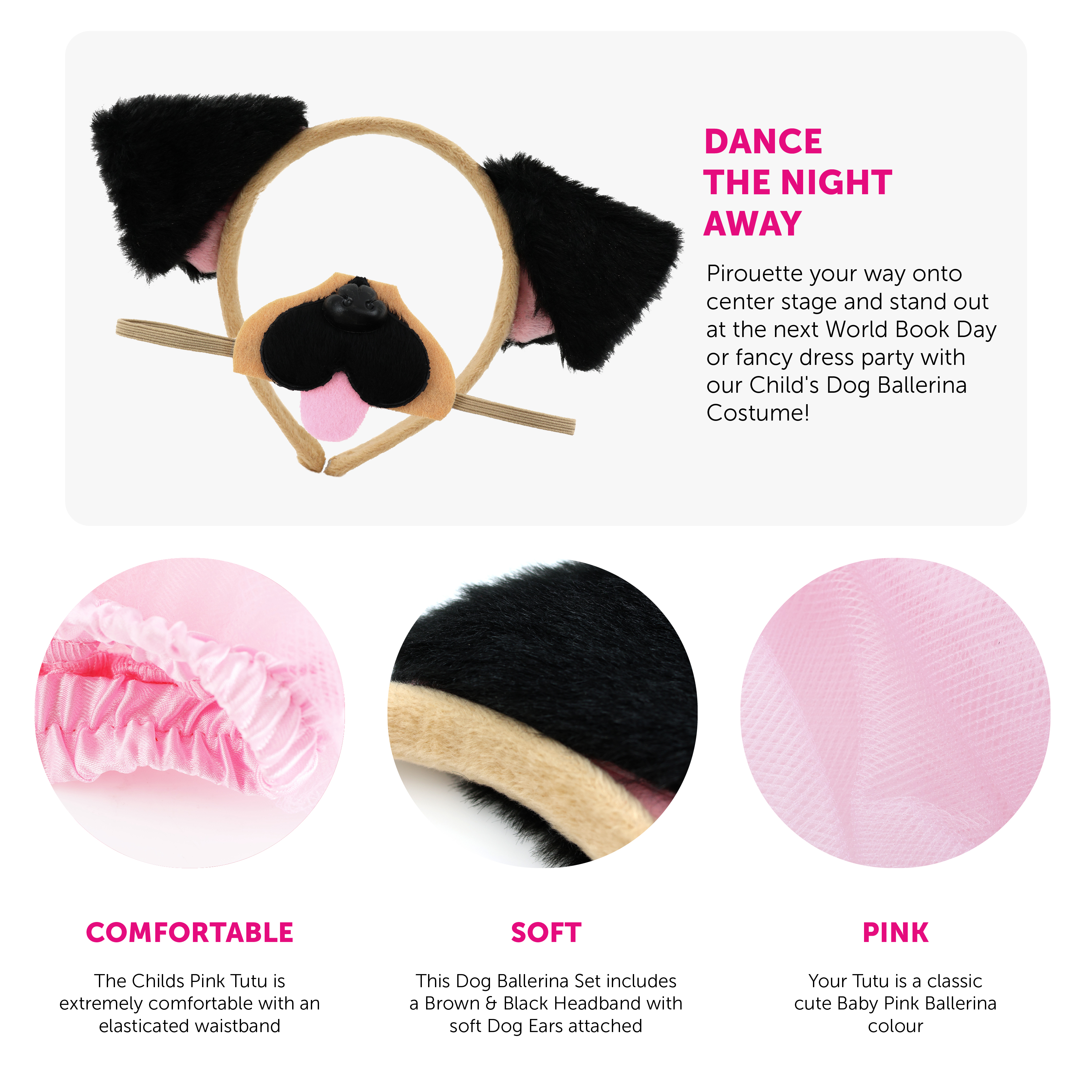 COSTUME INCLUDES: The Child's Dog Ballerina Costume includes a soft Brown and Black Ear Headband, a matching Dog Nose on an elastic strap, a soft Brown Tail, and a vibrant Pink Tutu with netted Pink layers and an elasticated waistband, the perfect look for you this World Book Day!