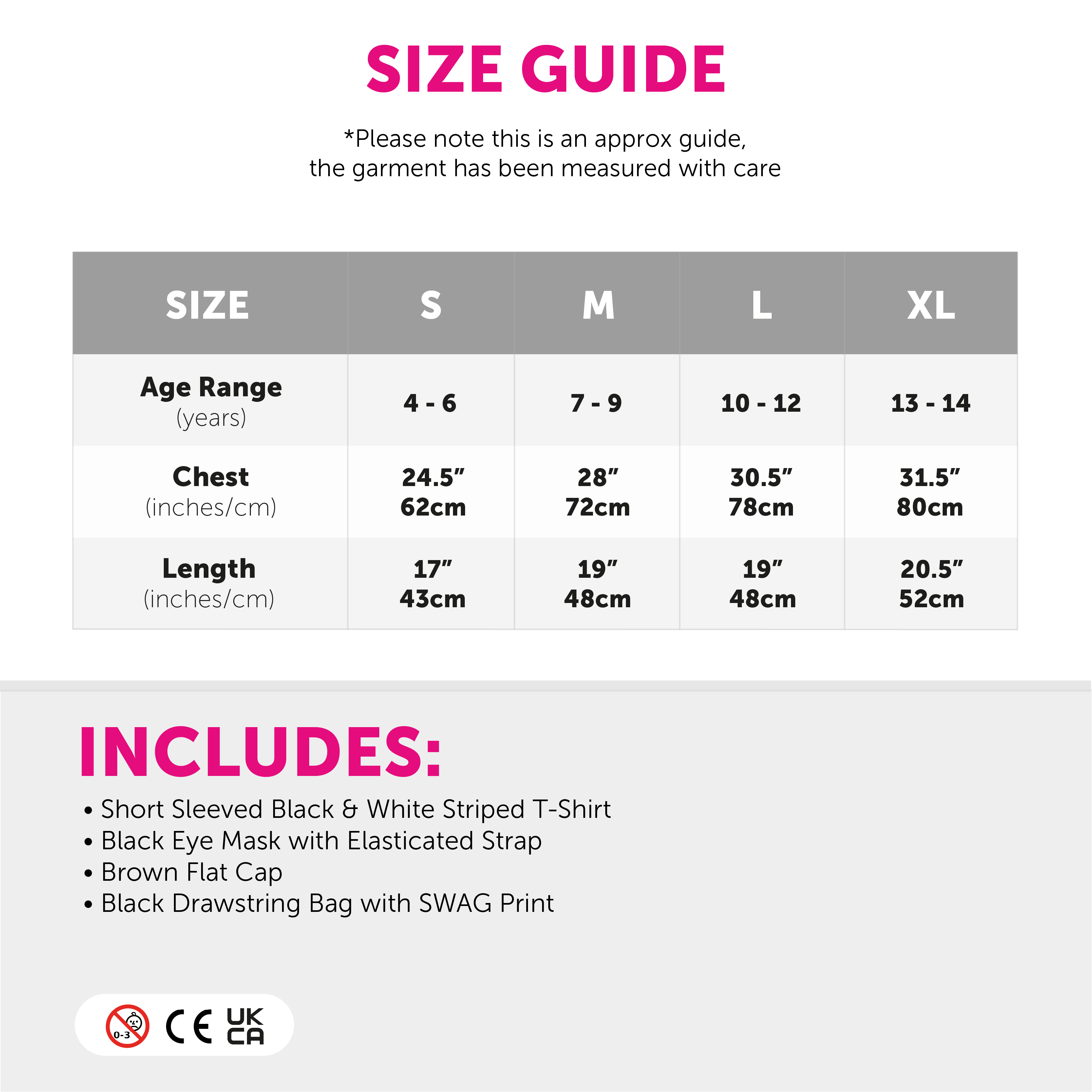 COSTUME SET INCLUDES: This Child's Storybook Burglar Costume includes a Short sleeved, Black and White Top, a Black Eye Mask on a comfortable elasticated strap, a Brown Flat Cap, and a Black Drawstring Bag with SWAG in White Print across the front, the perfect look for you this World Book Day!