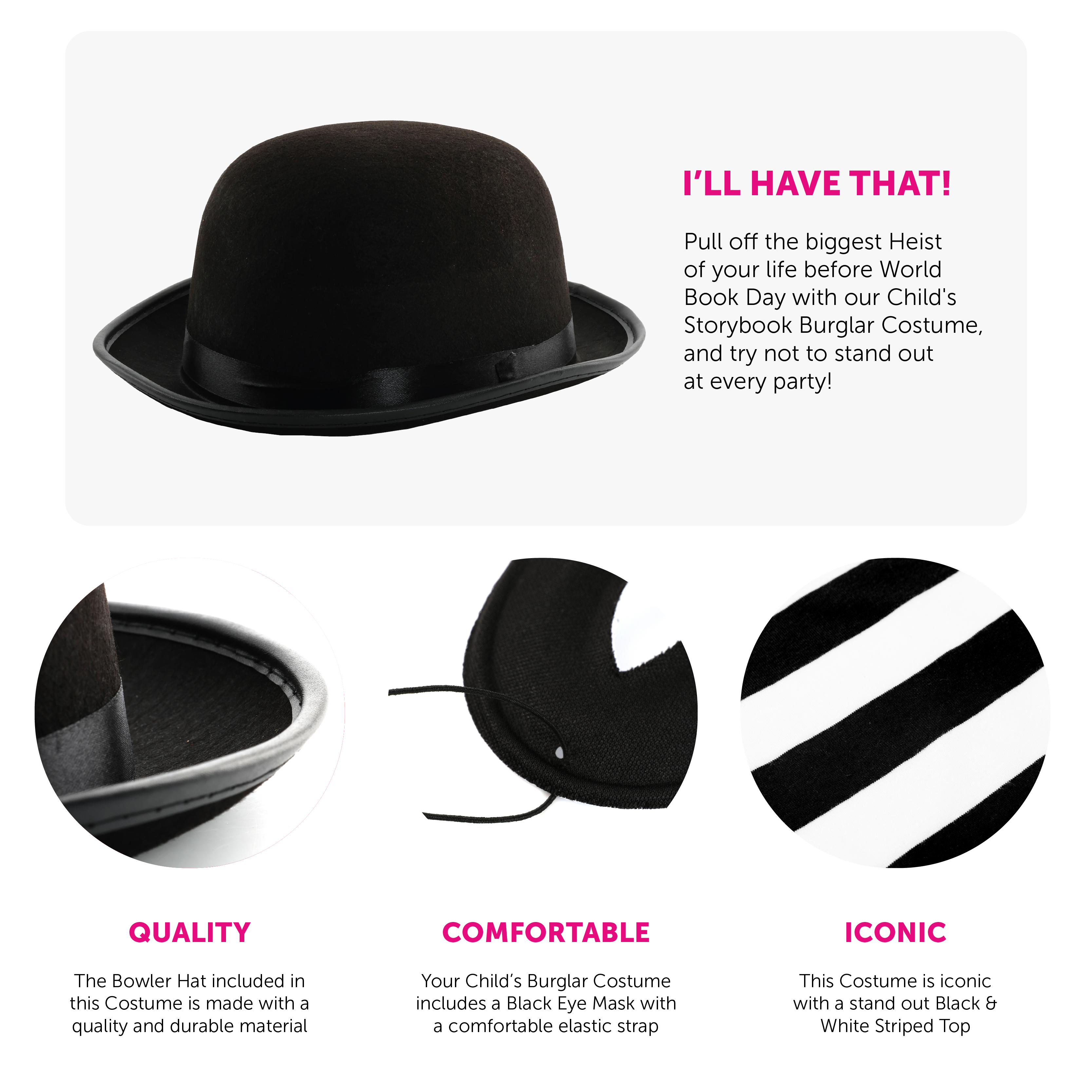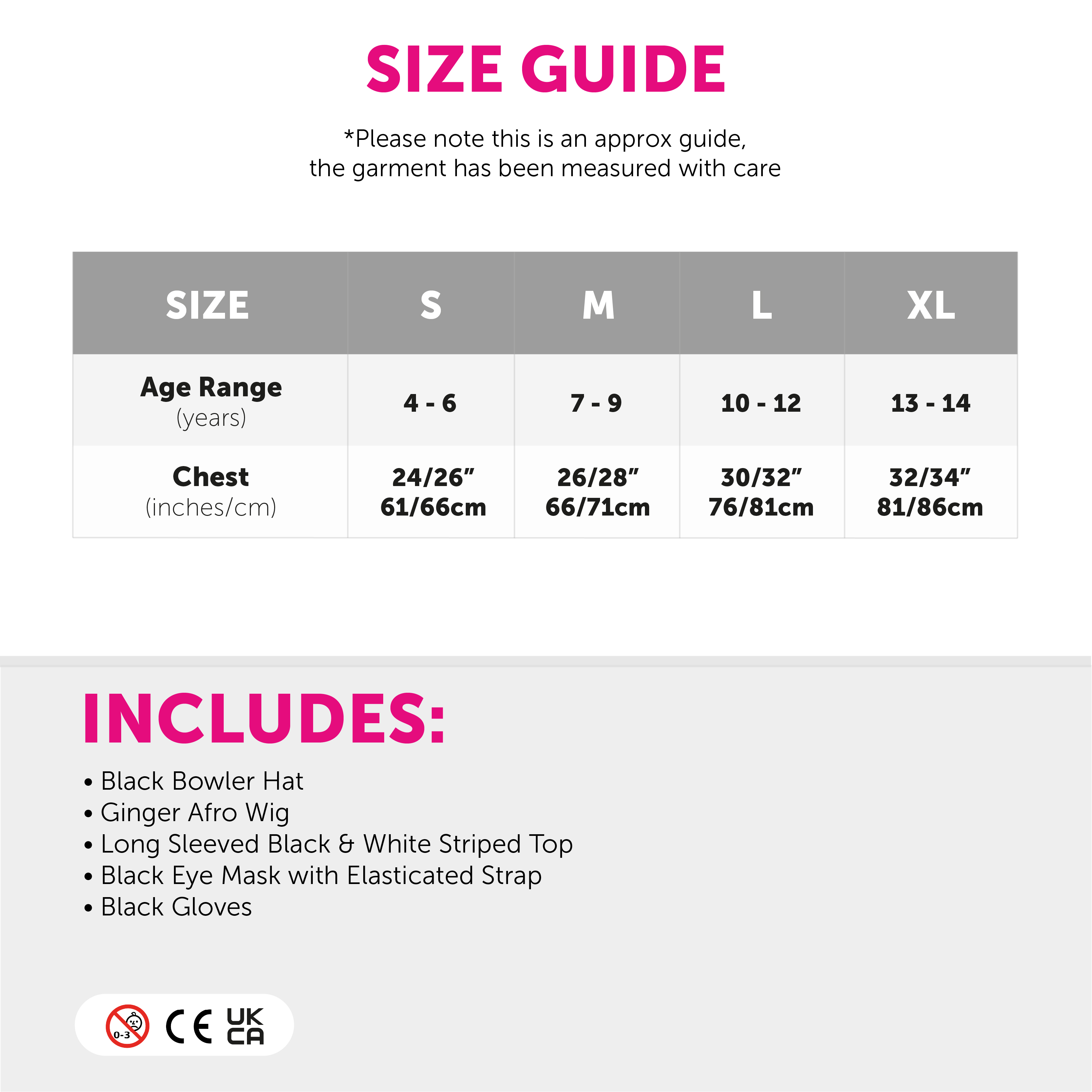 COSTUME SET INCLUDES: This Child's Storybook Burglar Costume includes a Black Bowler Hat, Long Sleeved Black and White Striped Top, a Black Eye Mask on a comfortable elasticated strap, an Ginger Afro Wig, and Black Gloves, the perfect look for you this World Book Day!
