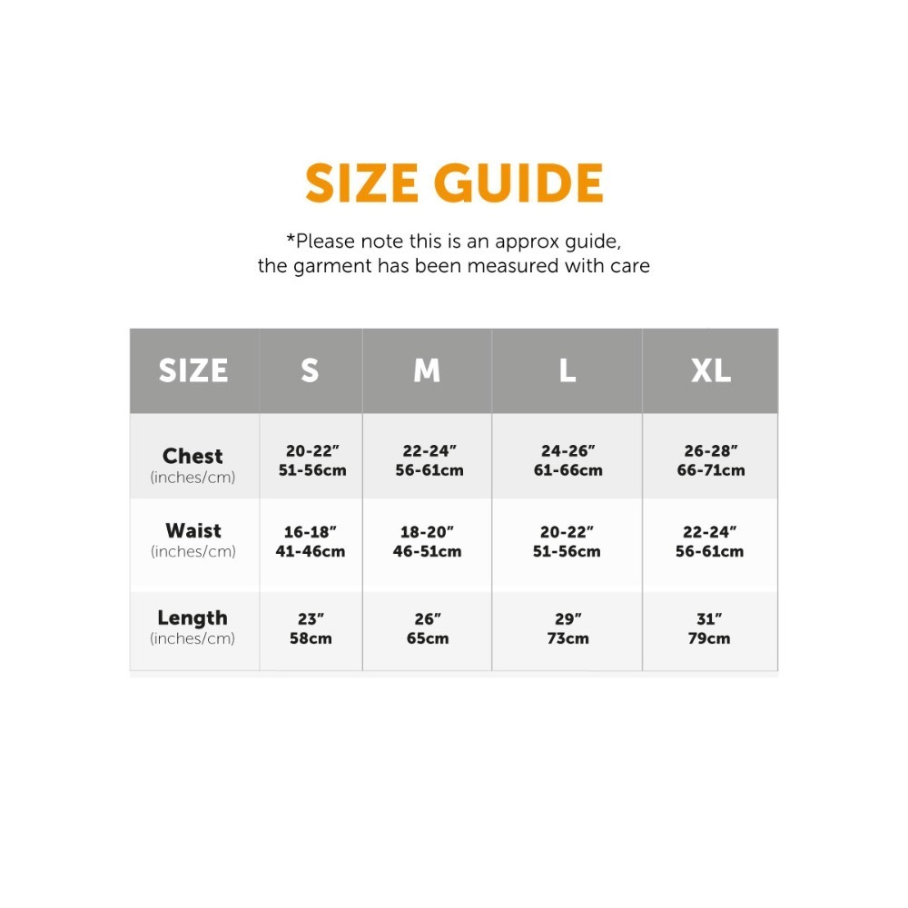 - X-Large: Chest 26–28" (66–71cm), Waist 22–24" (56–61cm), Length 31" (79cm)