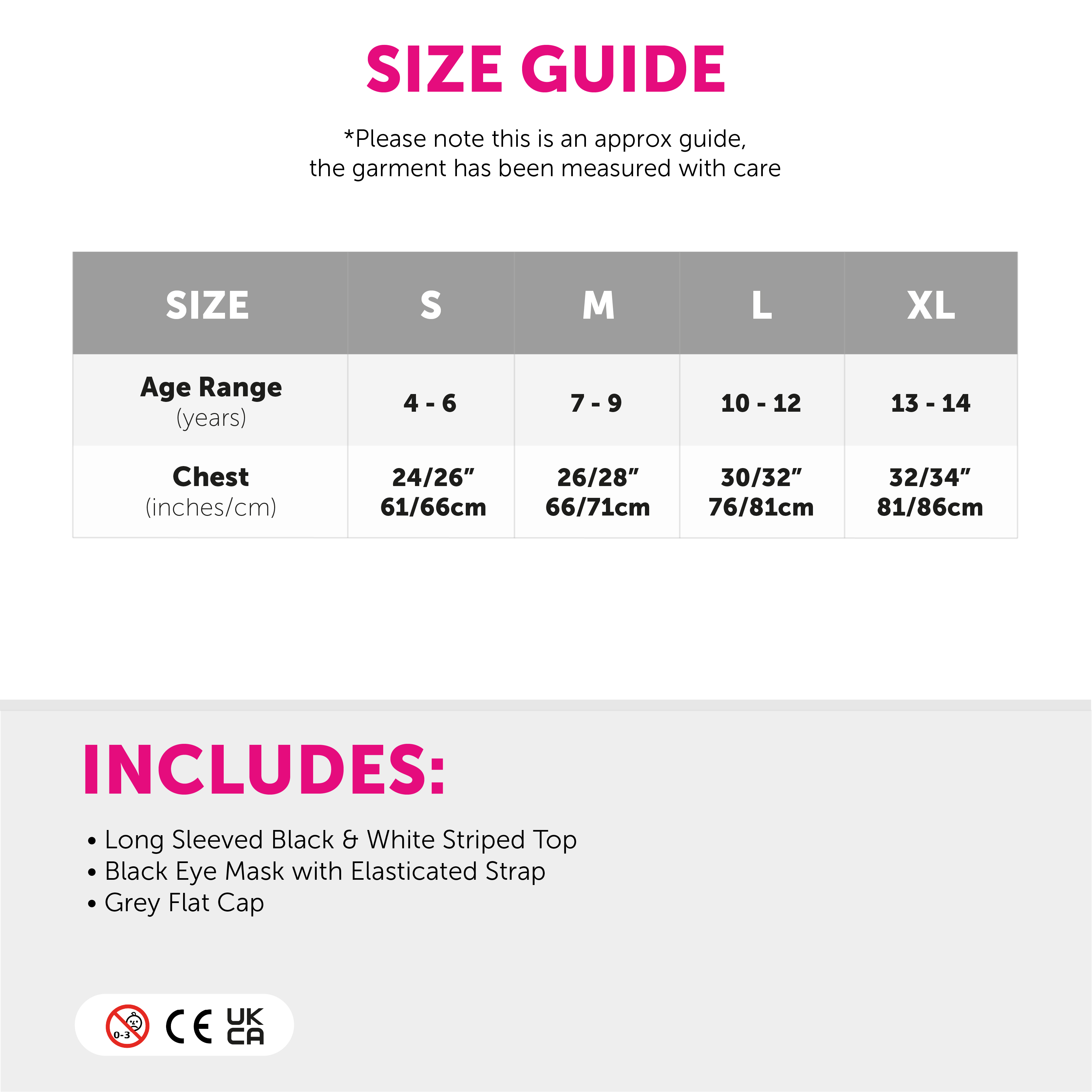 COSTUME SET INCLUDES: This Child's Storybook Burglar Costume includes a long sleeved, Black and White Top, a Black Eye Mask on a comfortable elasticated strap, and a Grey Flat Cap, the perfect look for you this World Book Day!