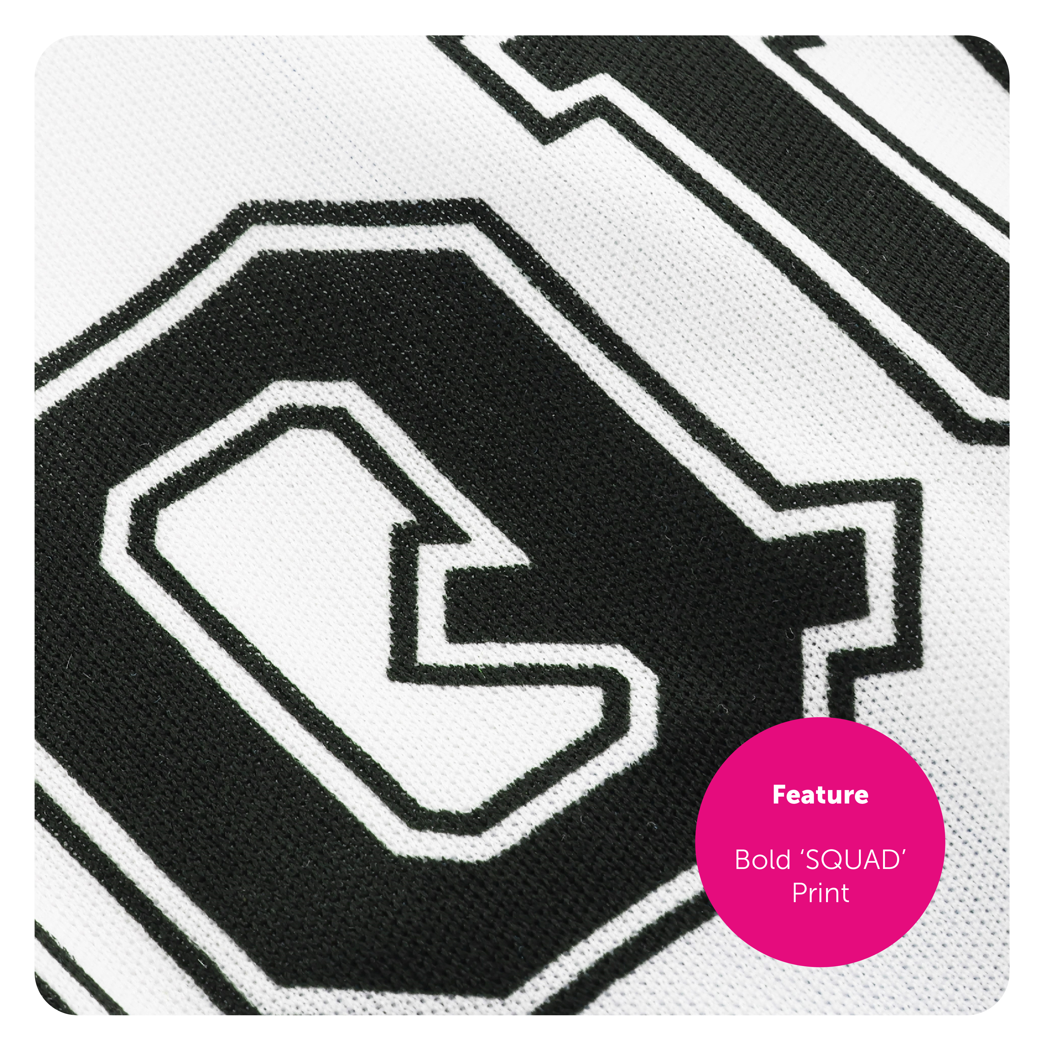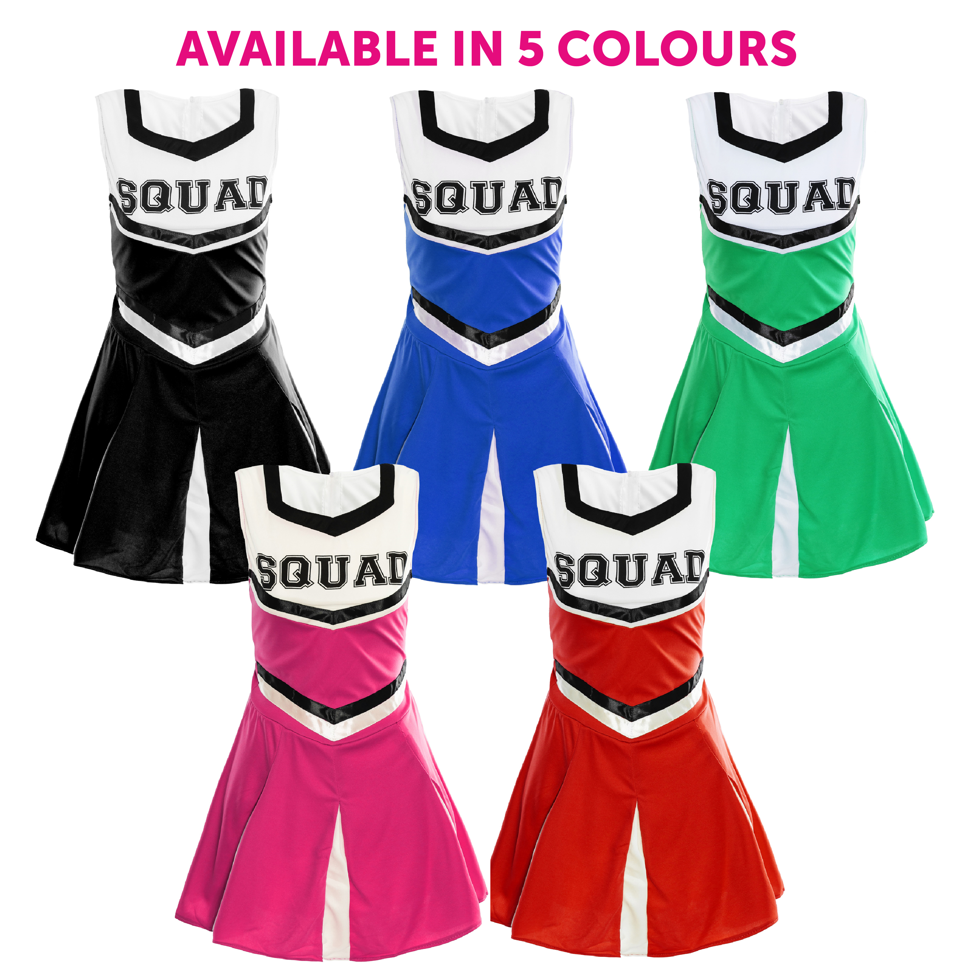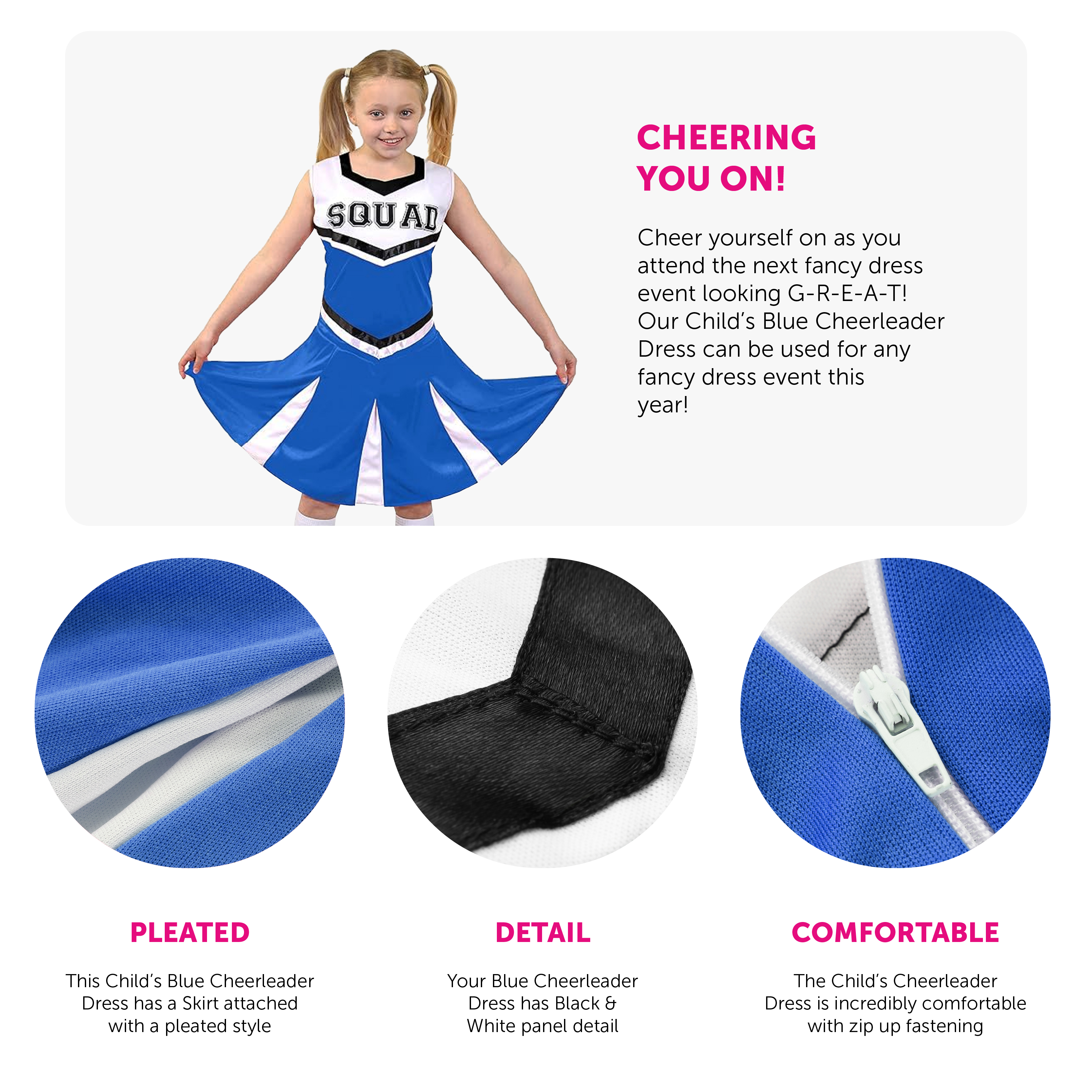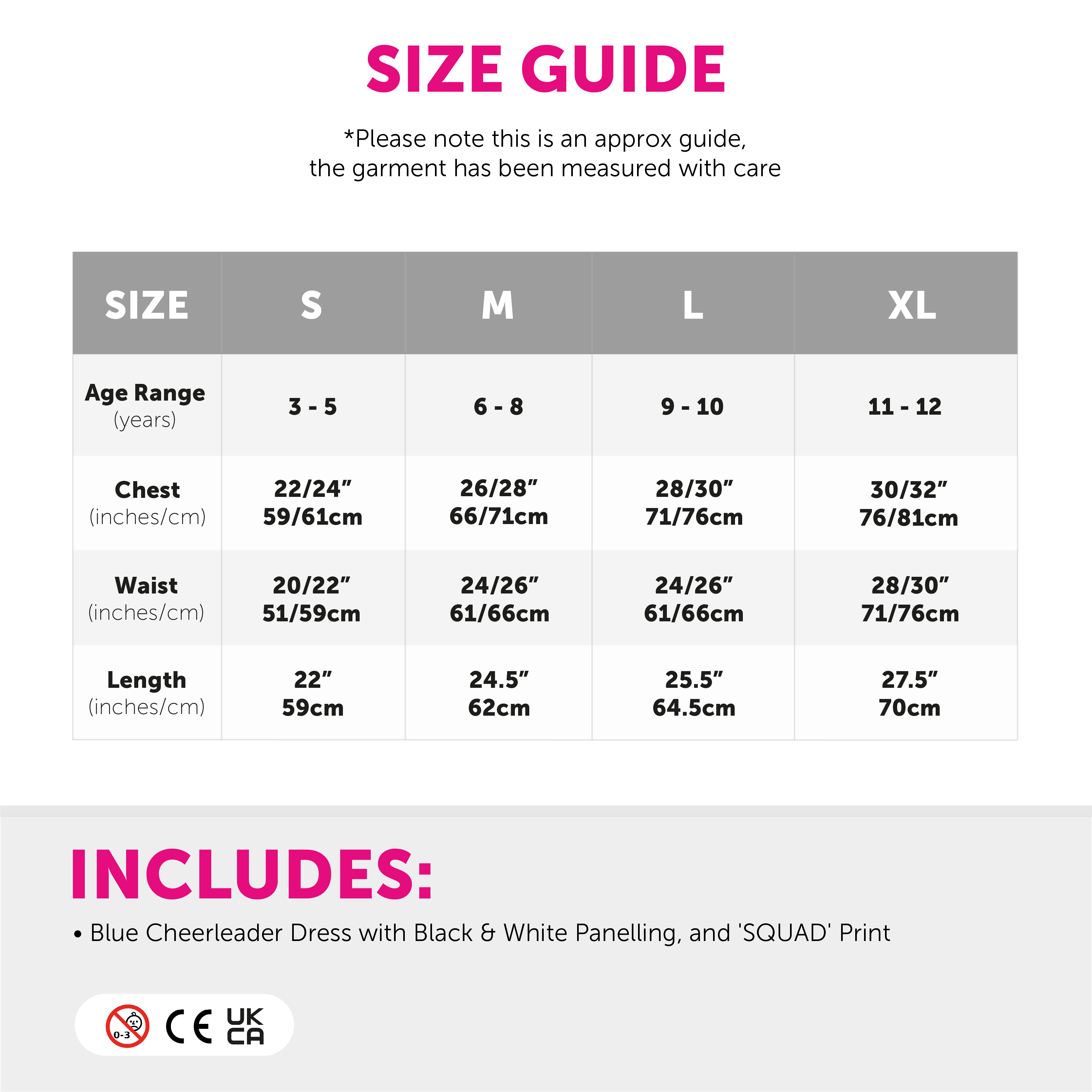 COSTUME INCLUDES: Your Child's Cheerleader Costume is a bright Blue Short Dress with a Pleated Skirt, Black and White panelling, and 'SQUAD' Printed on the front in a Large Black Font, the perfect Costume for any fancy dress event!