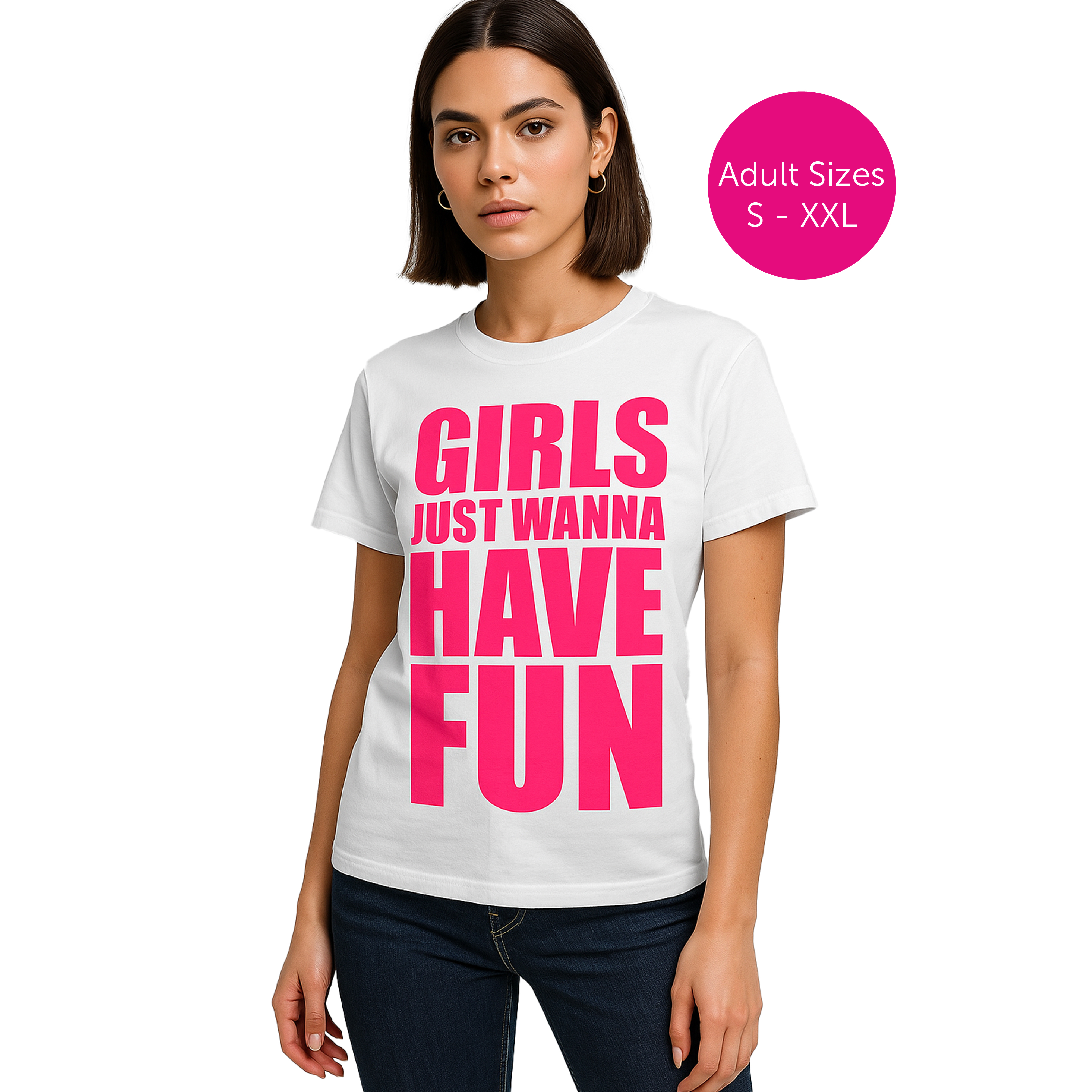ADULTS GIRLS JUST WANNA HAVE FUN T-SHIRT: Channel your inner 80's icon with our bold and stylish Adults 'Girls Just Wanna Have Fun' T-Shirt, this top is perfect for music lovers, themed parties, or simply showing off your fun fashion sense!