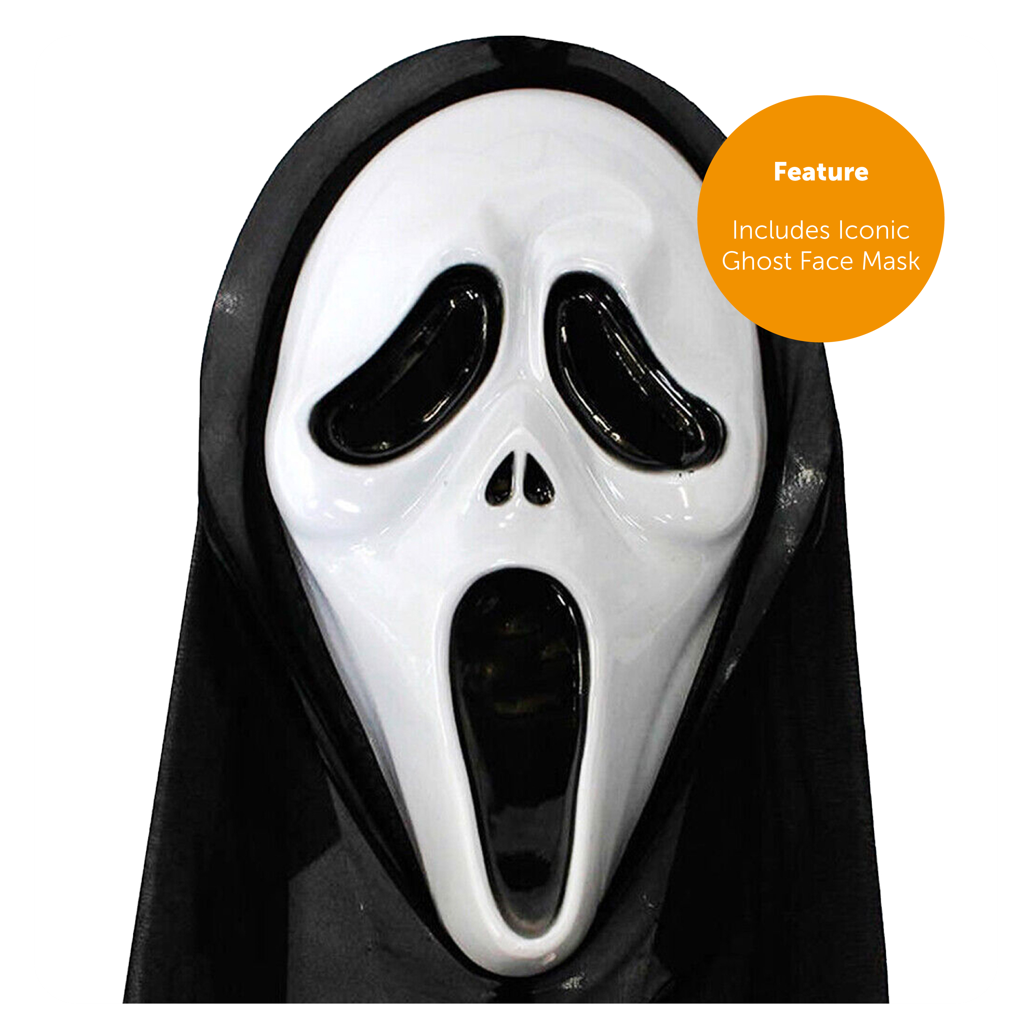 SET INCLUDES: This accessory set includes a Hooded Ghost Face Screamer Mask, a Plastic Knife Prop with Blood Splatters on the silver blade, a Blonde Bob Wig, a large Black Inflatable Phone, Red Blood Necklace and matching Blood Bracelet, a palette of Grey, White, Red and Black Funki Face Paint with a tube of Fake Blood and Funki Red Lipstick!