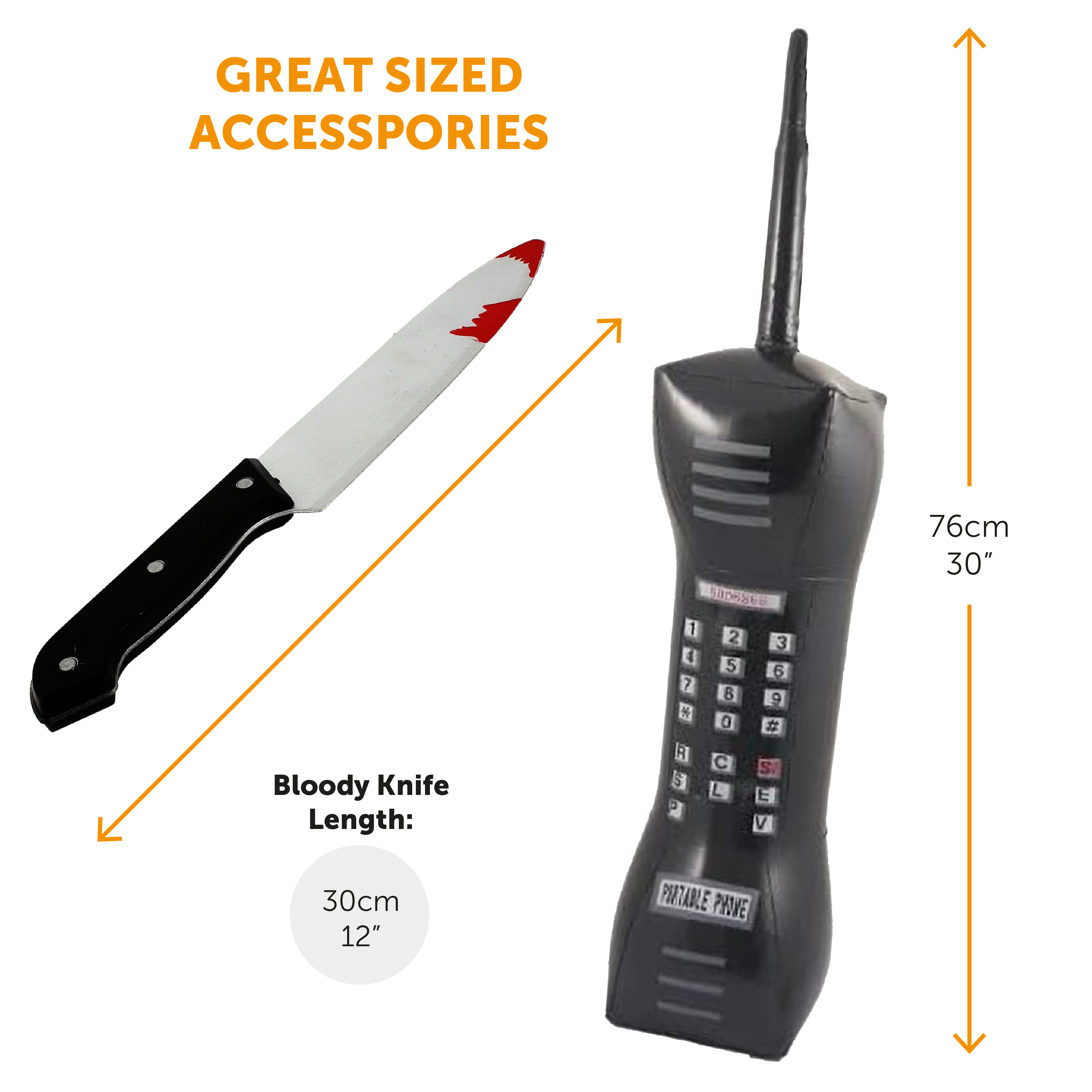 GREAT SIZED PROPS: The Serial Killer and Casey Duo Accessory Set includes two great sized props that will help you stand out at any fancy dress event! The Plastic Bloody Knife measures a length of 30cm (12") and the Inflatable Phone measures a length of 76cm (30")