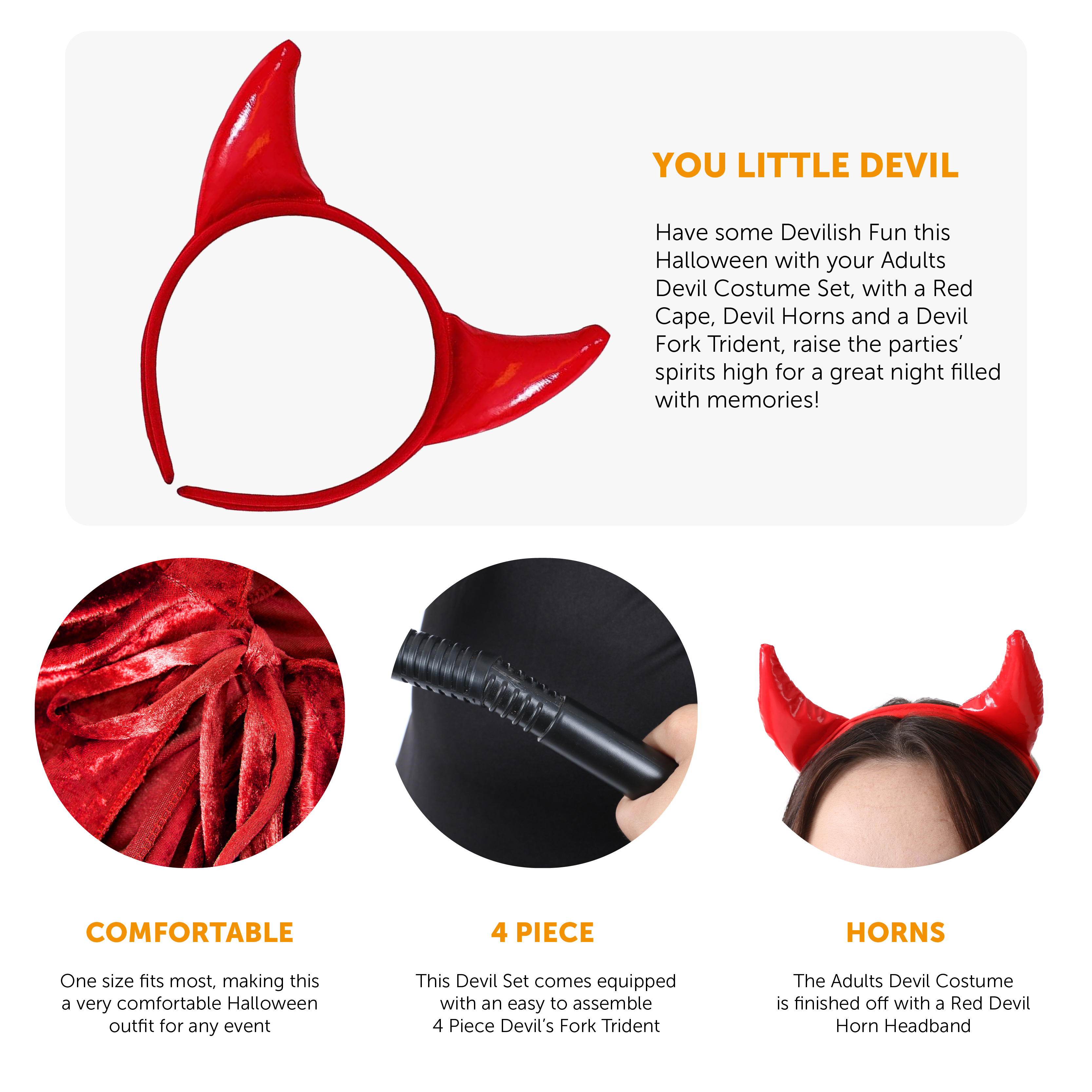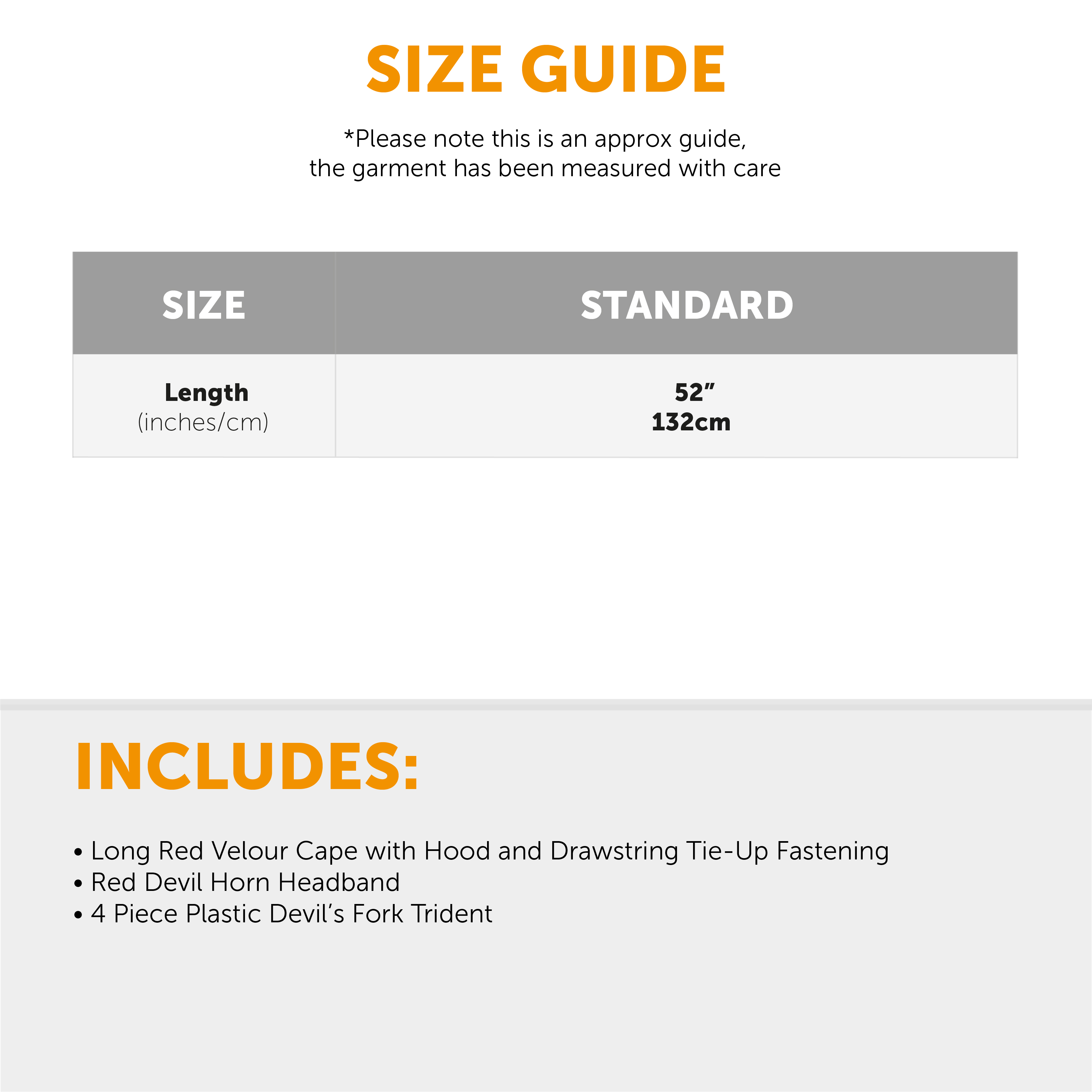 SET INCLUDES: This Adults Devil Costume Set includes a soft Red Velour, calf-length Cape with an attached hood and drawstring fastening, a Red Devil Horn Headband and an easy to assemble 4 Piece Plastic Devil Fork Trident, the perfect Costume to act Devilish all night long!