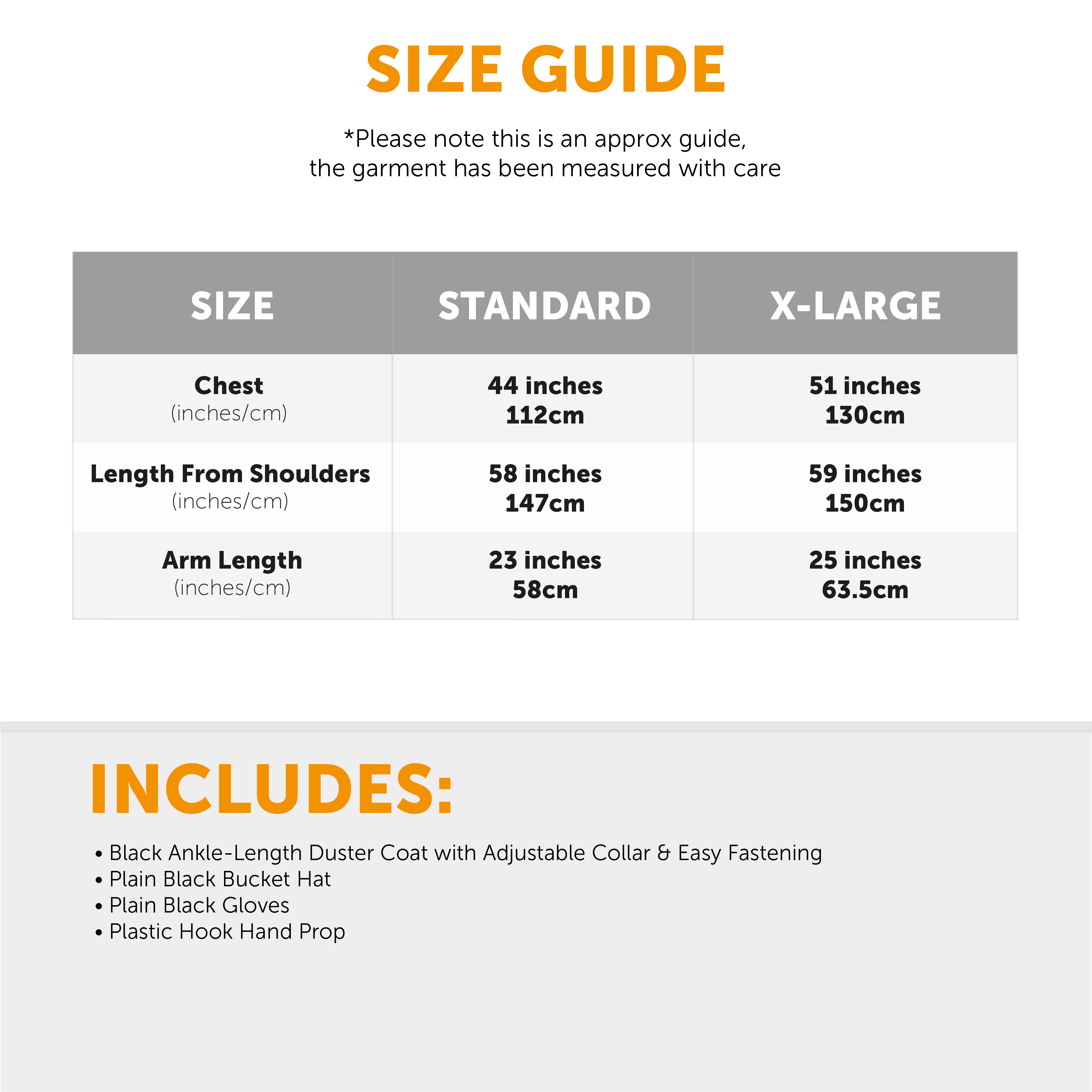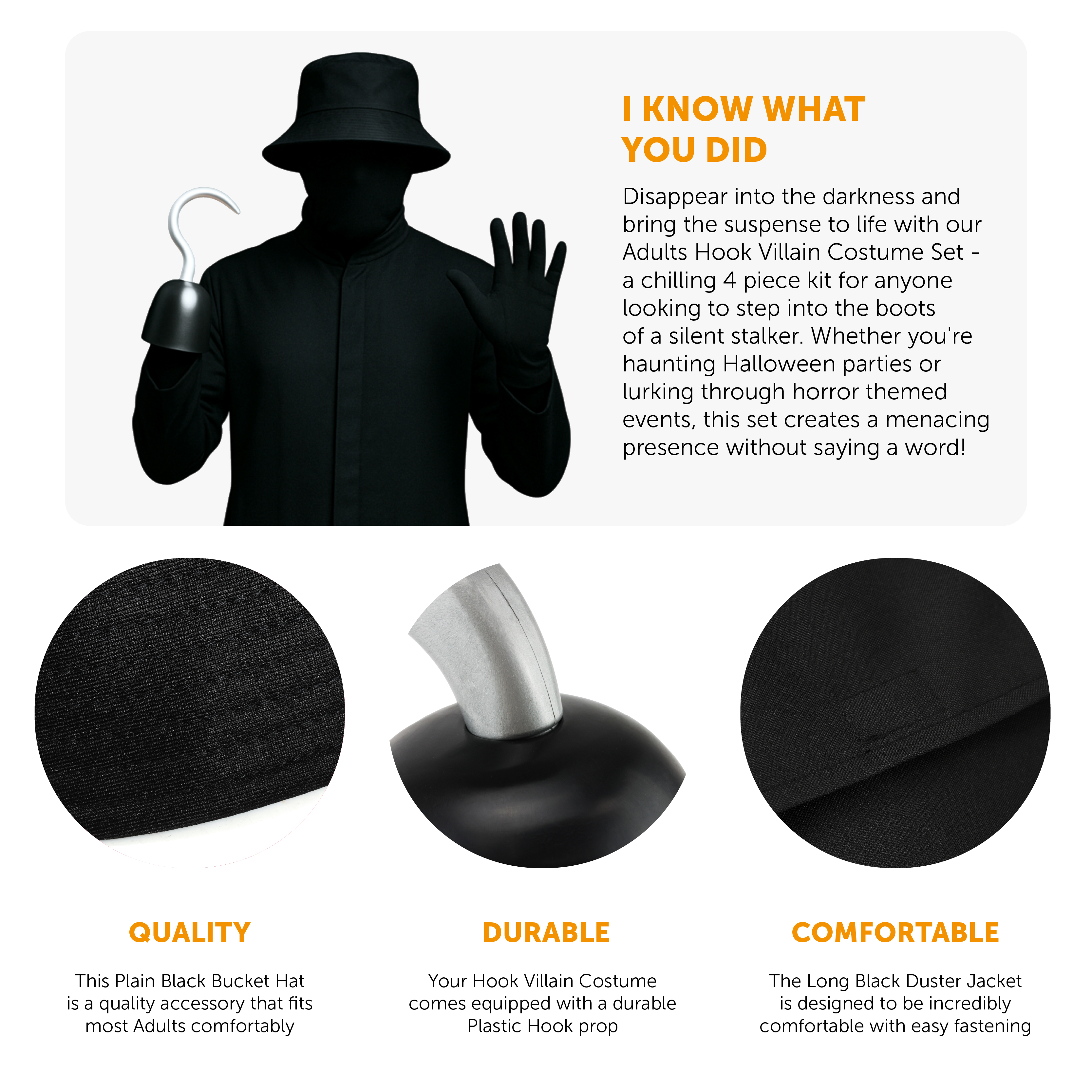 COSTUME INCLUDES: This Adults Hook Villain Costume Set includes a Plain Black Bucket Hat, Plain Black Gloves, a Long Black Duster Coat, and a Plastic Hook Hand prop, the perfect look for any Halloween fancy dress event!