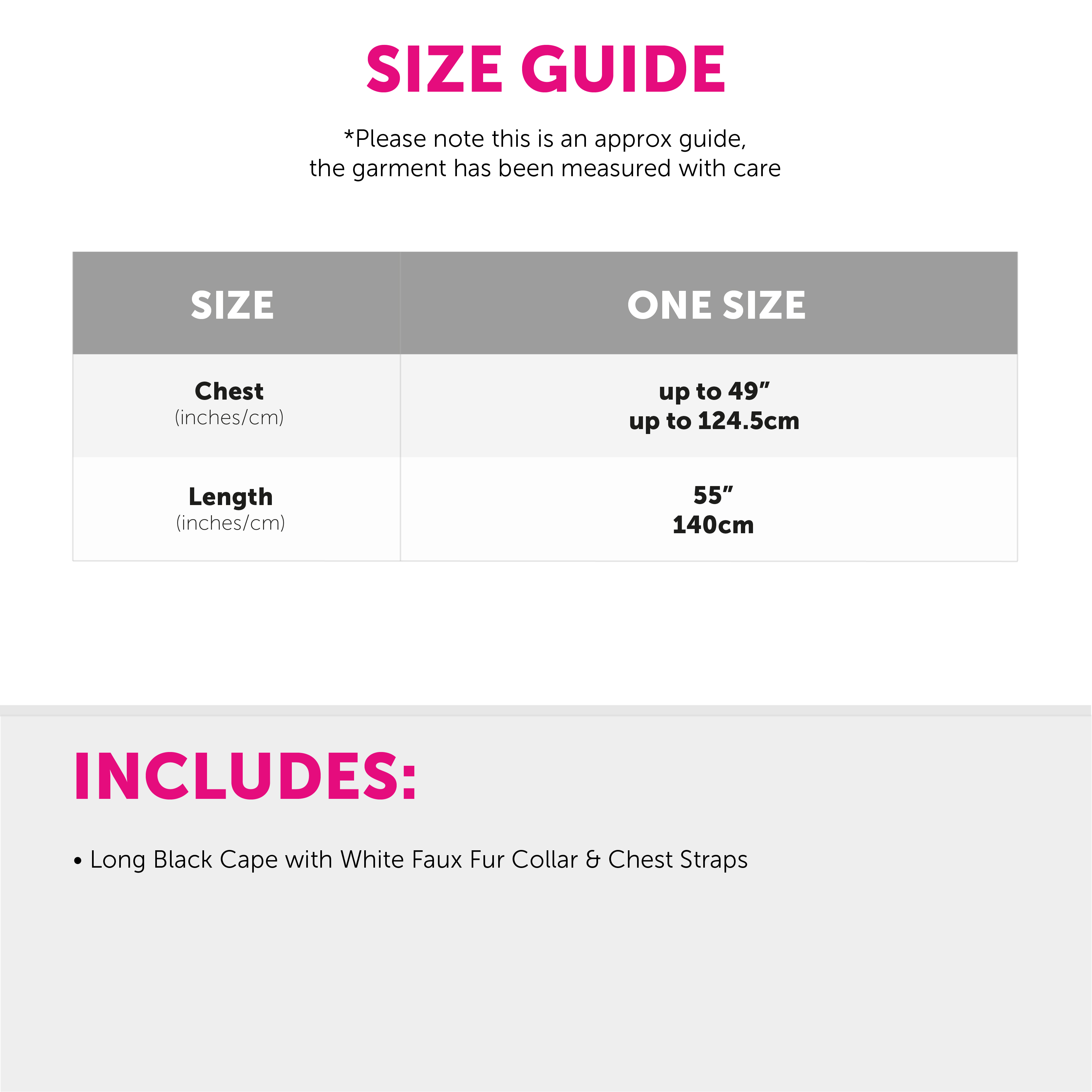 CLOAK DETAILS: Your Adults Black Cloak is a long Cloak with a White Faux Fur Collar and Black Faux Leather Straps across the torso, the perfect addition to your Costume for any fancy dress event!