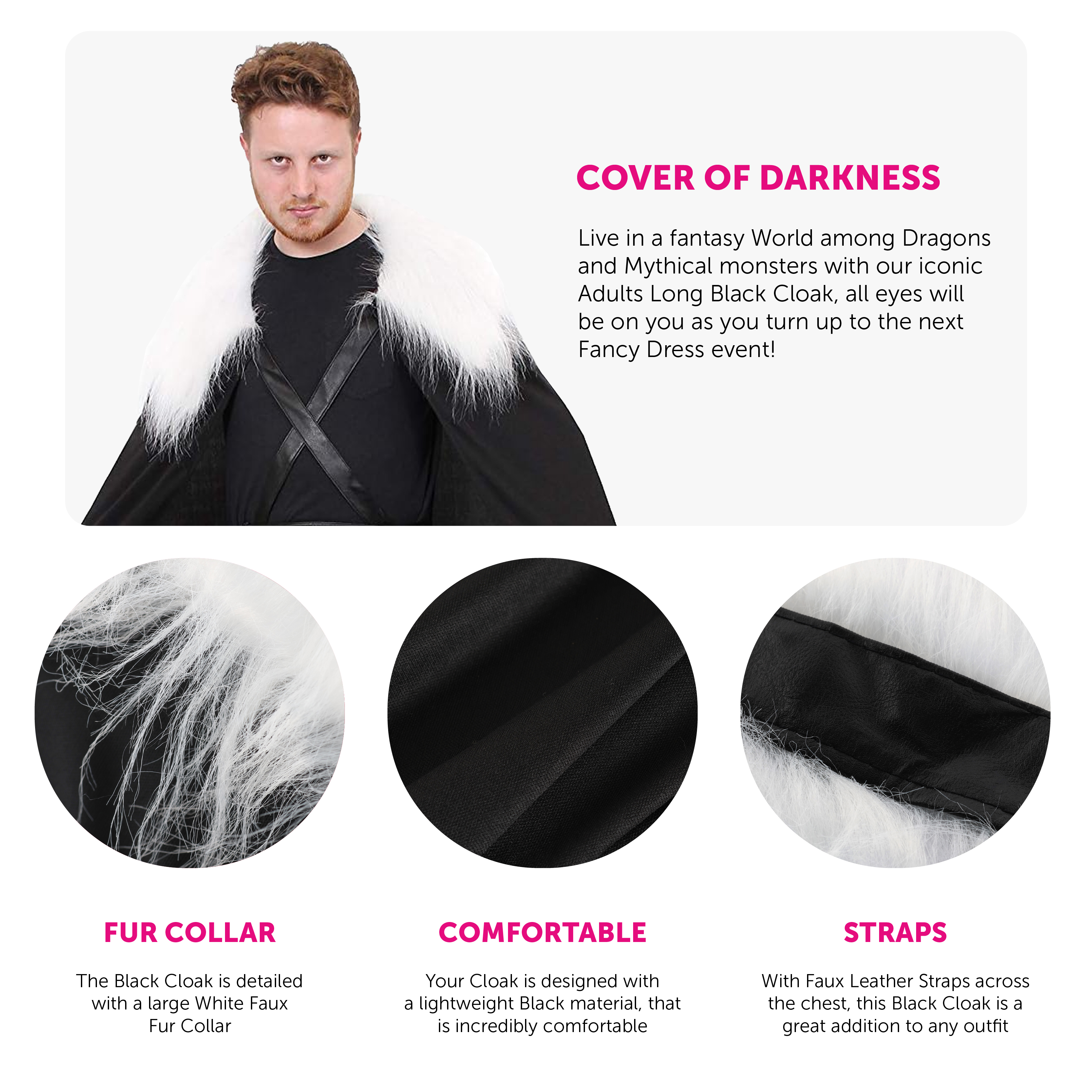 QUALITY DESIGN: The Adults Cloak is designed to be the perfect addition to finish off your costume; with a White Faux Fur Trim Collar and Faux Leather Chest Straps, this Black Cloak is a quality costume piece!