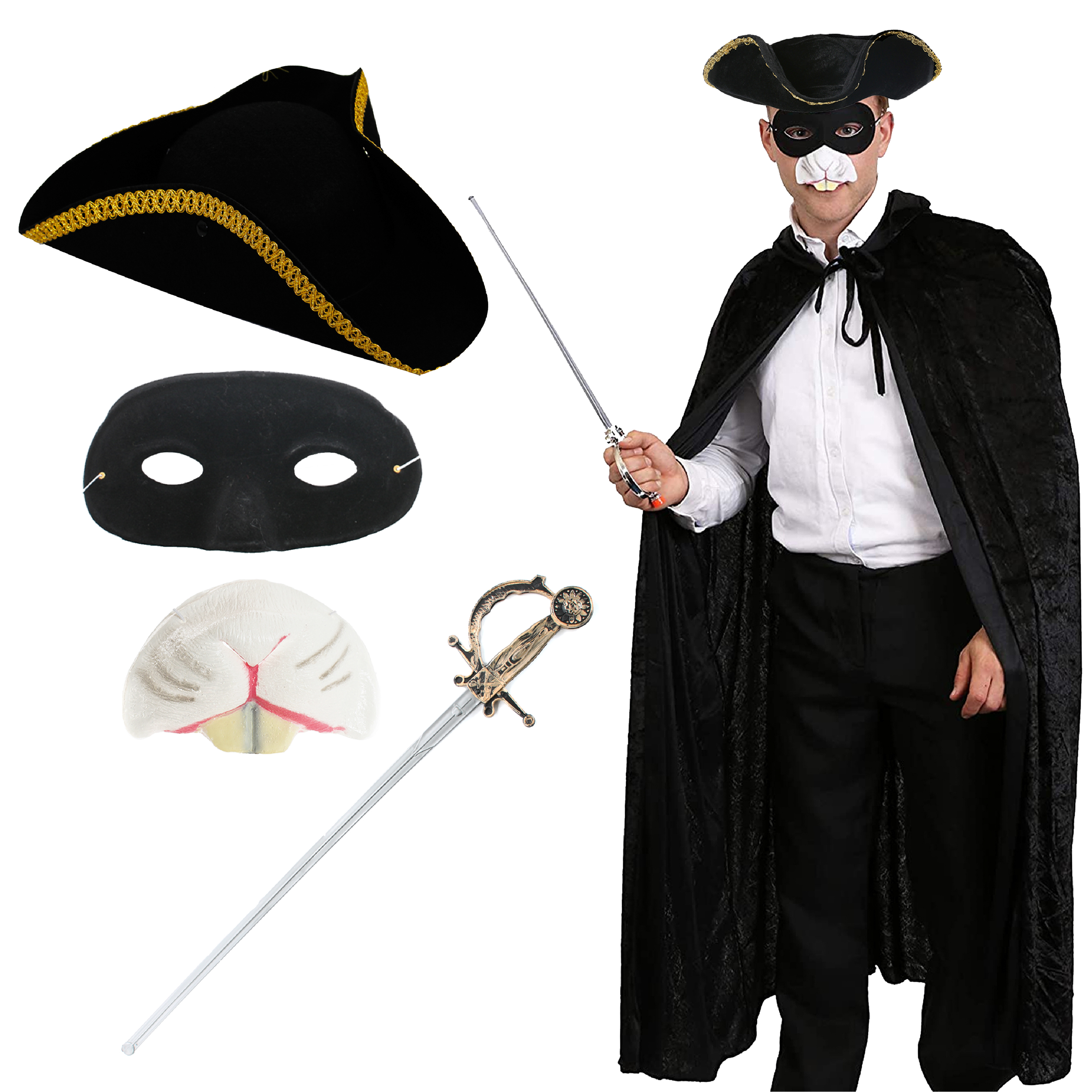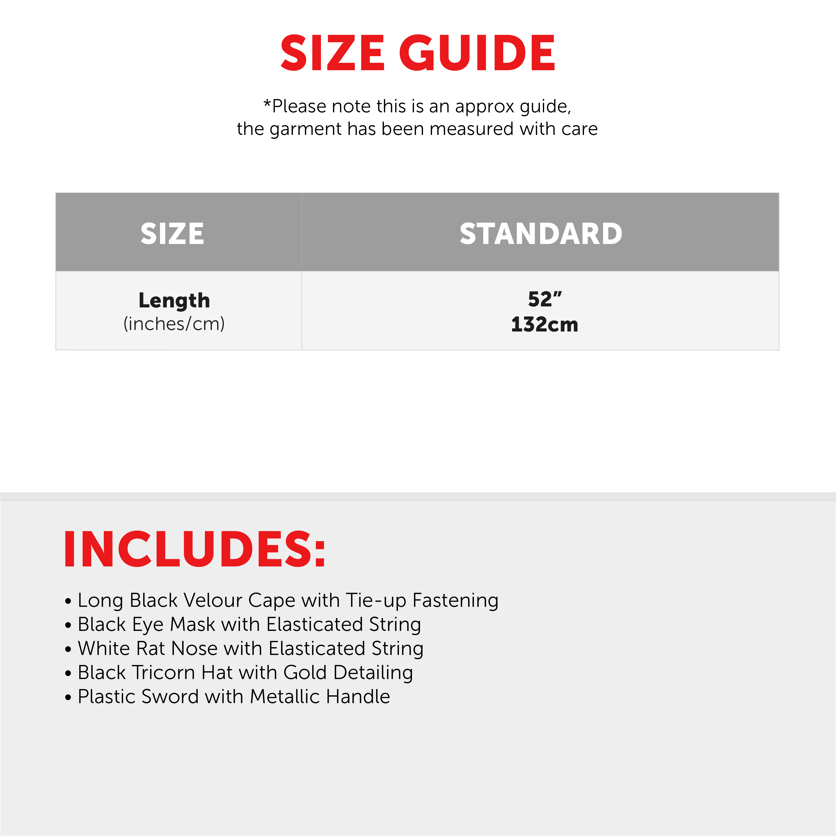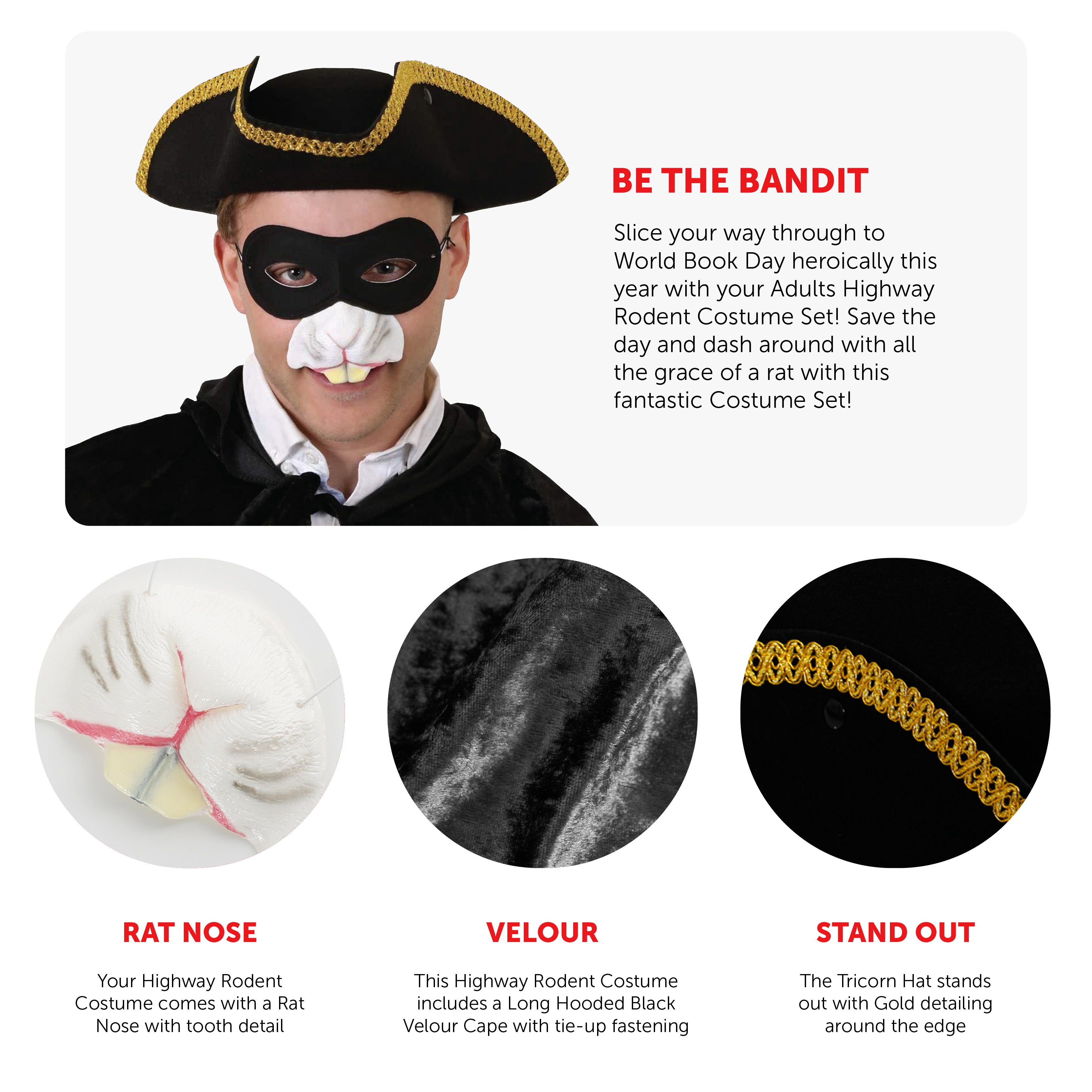 COSTUME SET INCLUDES: Your Adults Highway Rodent Costume Set includes a Long Black Hooded Velour Cape, a Black Tricorn Hat with Gold detailing, a Black Eye Mask, a Sword, and a Rat Nose with an elasticated strap!