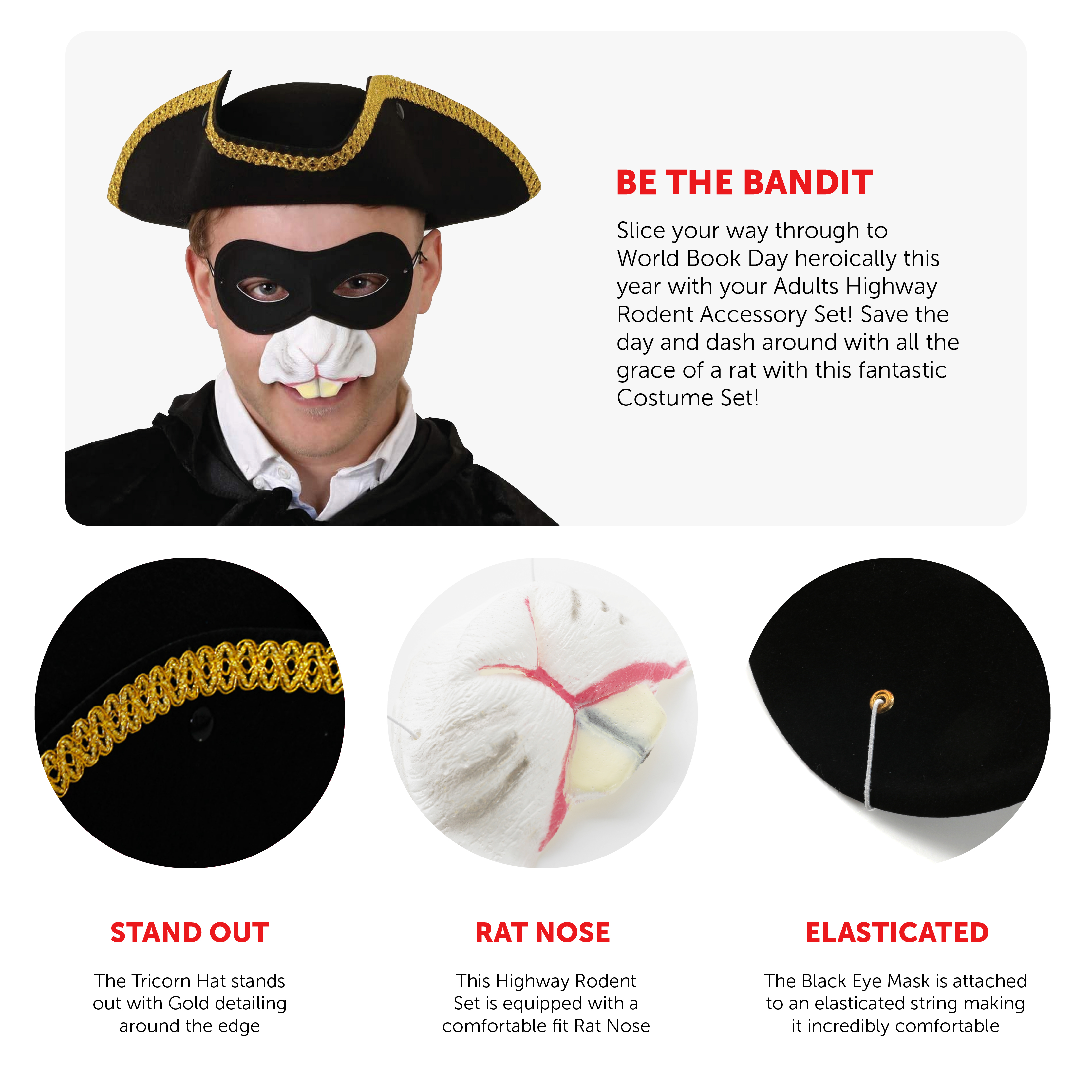 SET INCLUDES: Your Adults Highway Rodent Accessory Set includes a Black Tricorn Hat with Gold detailing, a Black Eye Mask, a Sword, and a Rat Nose on an elastic strap!