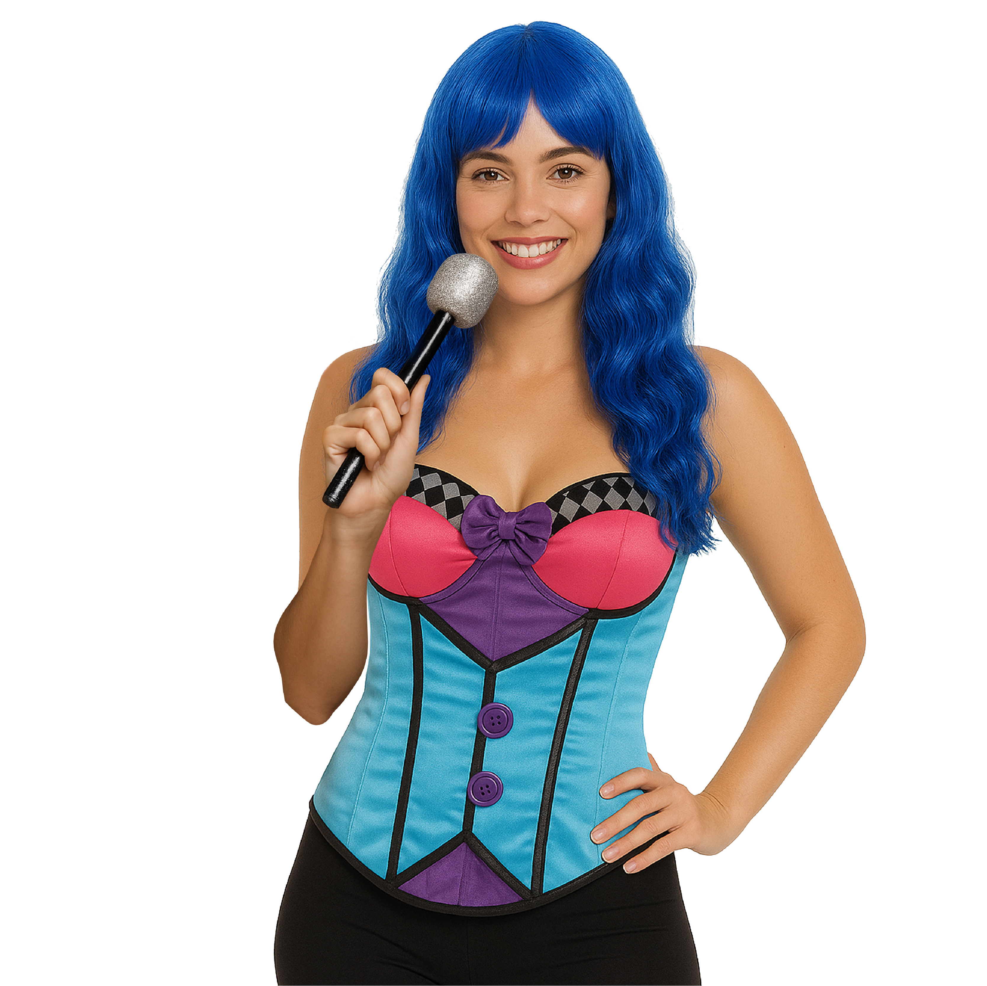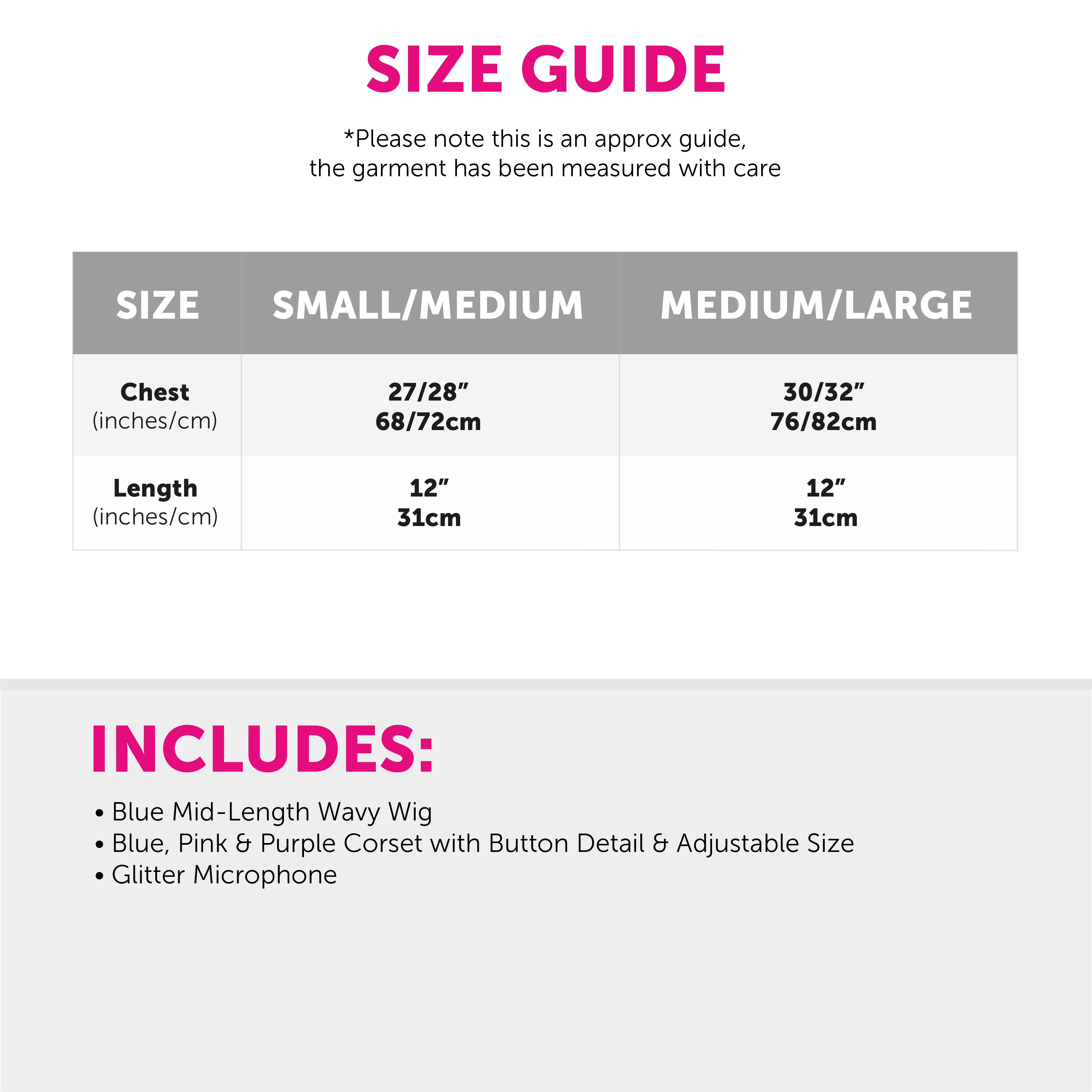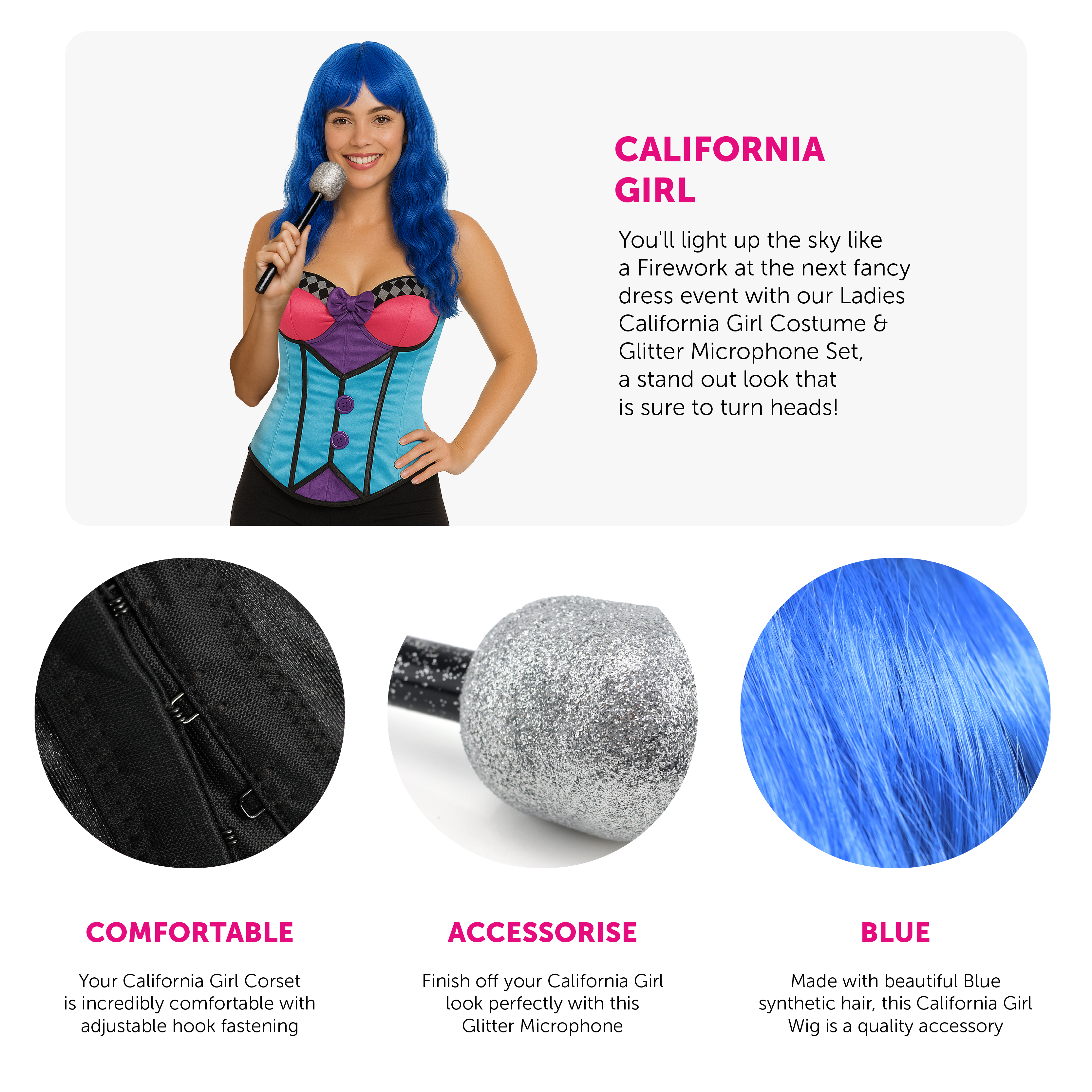 SET INCLUDES: This California Girl Costume Set includes a Mid-length Wavy Blue Wig, a bold, colourful Blue, Pink and Purple Corset with hook fastening on the back, and a Glitter Microphone, the perfect Costume piece for music themed fancy dress events!