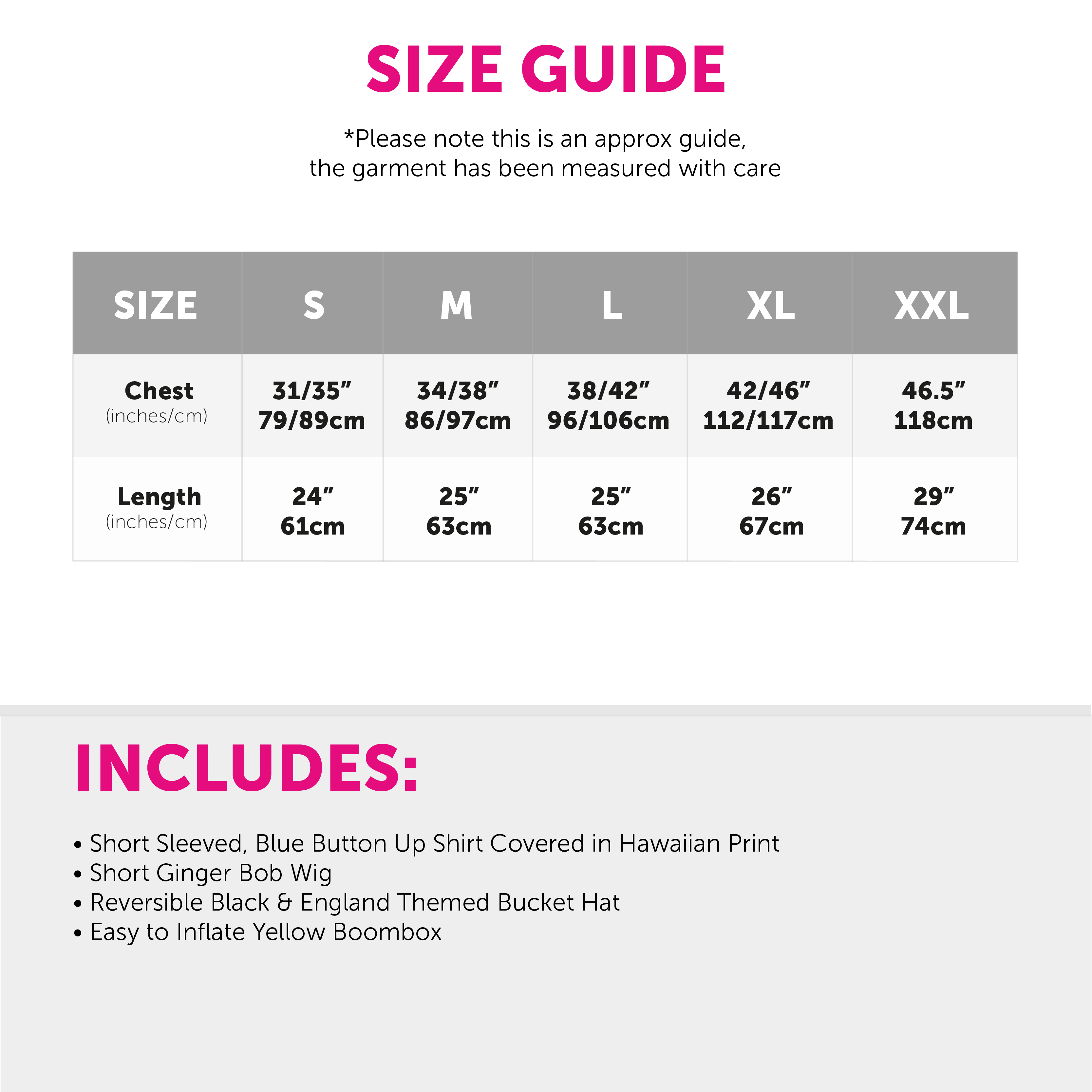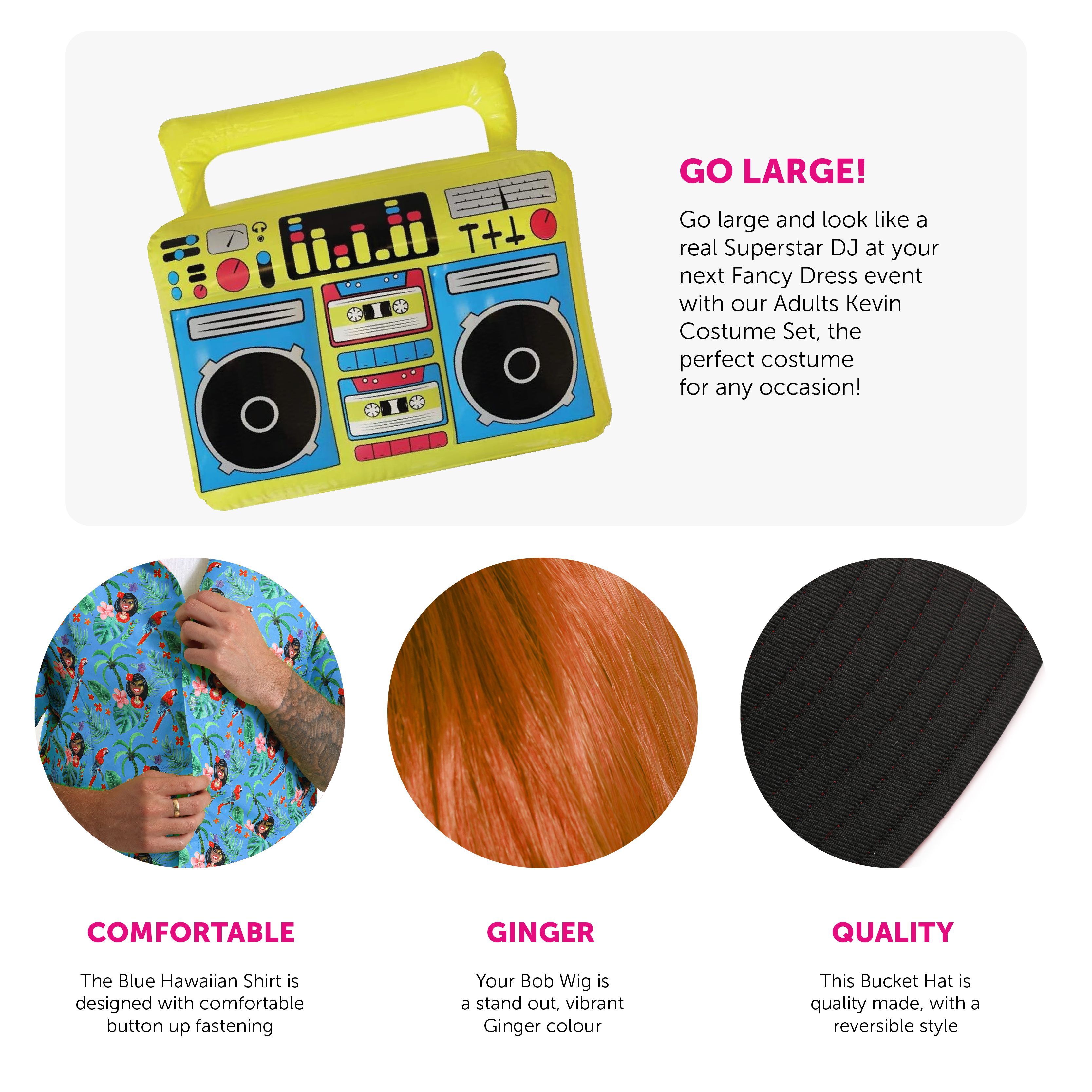 KEVIN COSTUME INCLUDES: This Adults Kevin Costume includes a short sleeved Blue Hawaiian Shirt, a Ginger Bob Wig, Reversible 'England' and Black Bucket Hat and an Inflatable BoomBox, the perfect outfit for any fancy dress event!