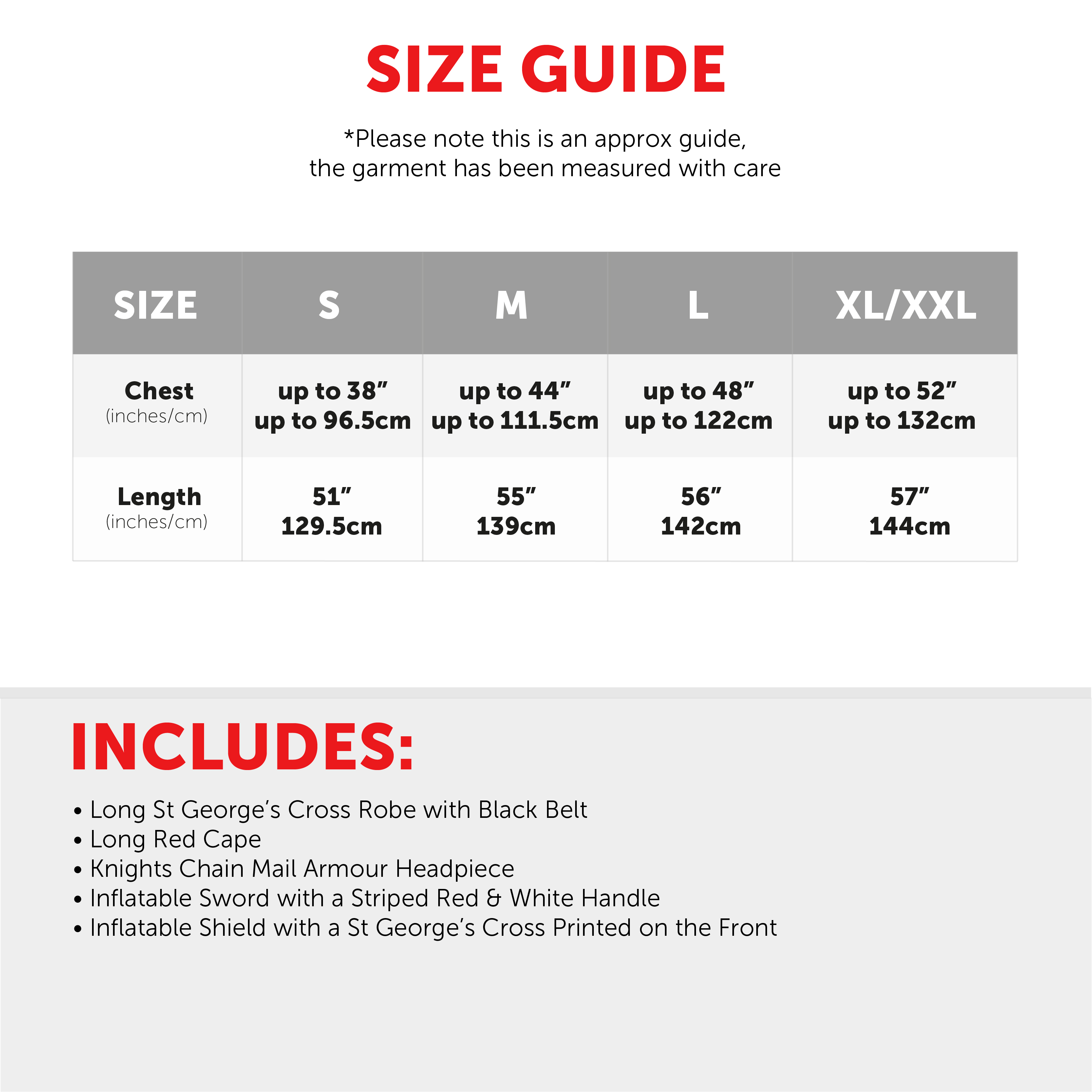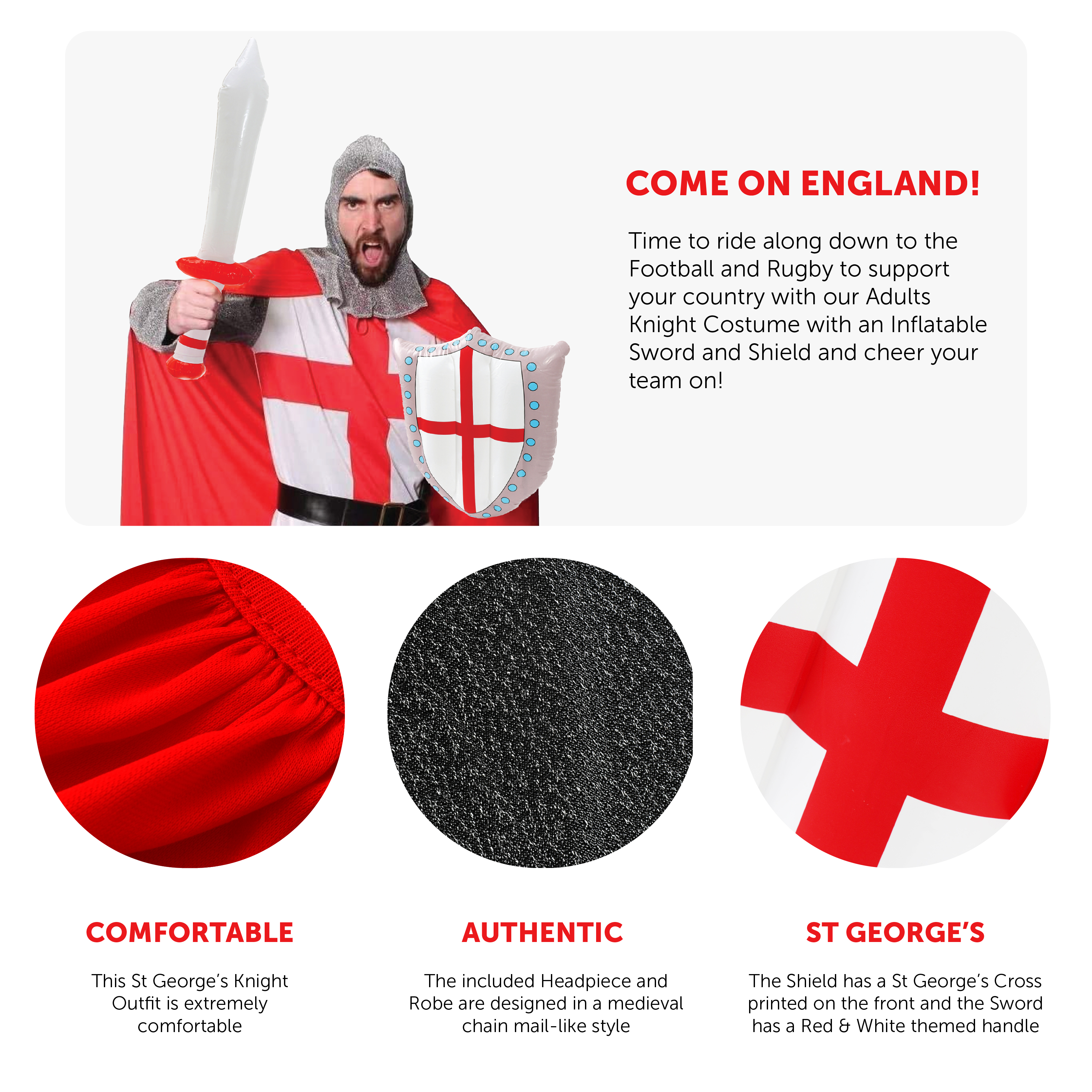 COSTUME INCLUDES: Your Adults Knight Costume includes an English Flag Tunic with a Black Belt, a Red Cape, Knight Chain Mail Armour Headpiece, and an easy to inflate Sword and Shield Set with the St George's Cross printed on the front and a Red and White theme, all prepped up for every England Game!