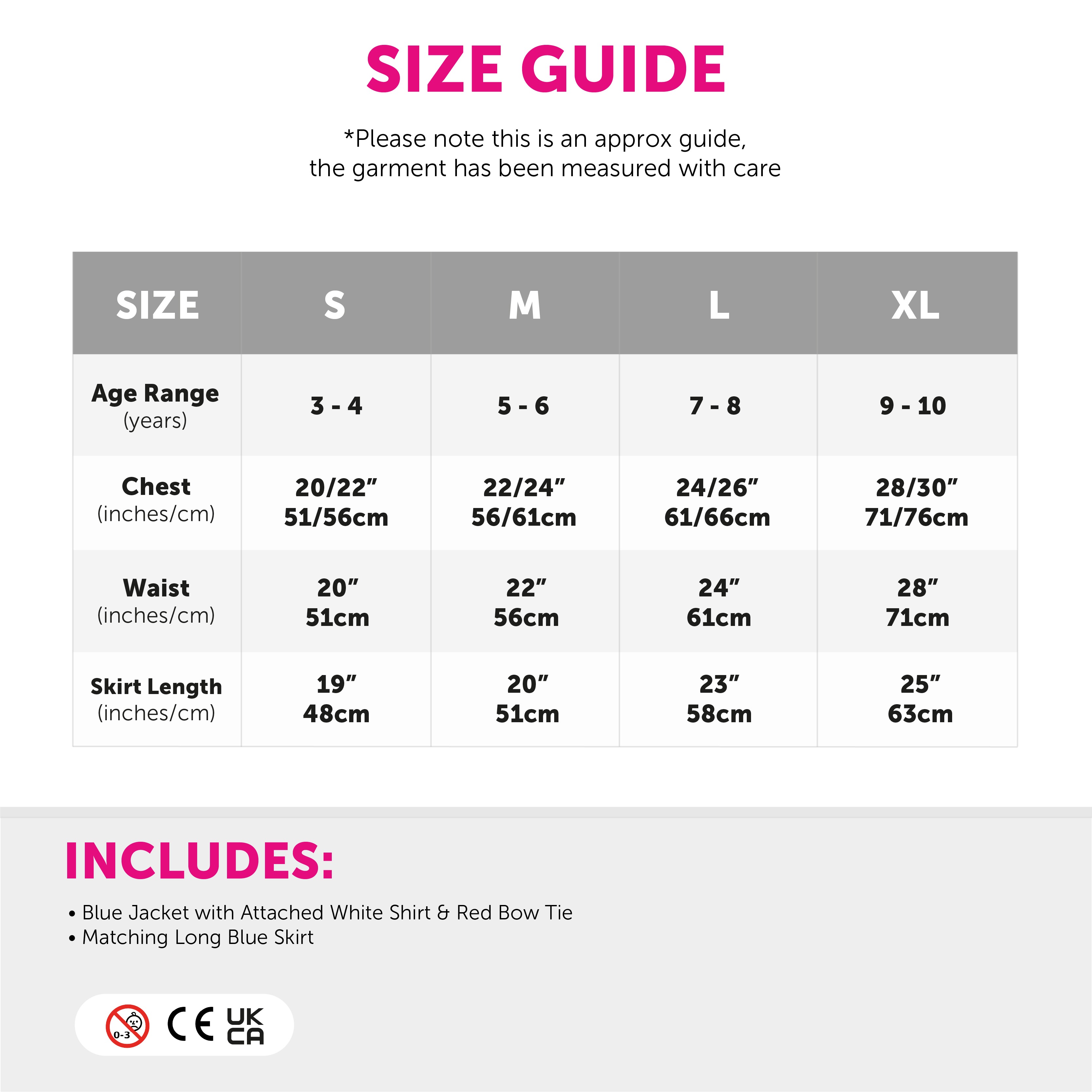- Large (7–8 Years): Chest 24–26" (61–66cm), Waist 24" (61cm), Skirt Length 23" (58cm)