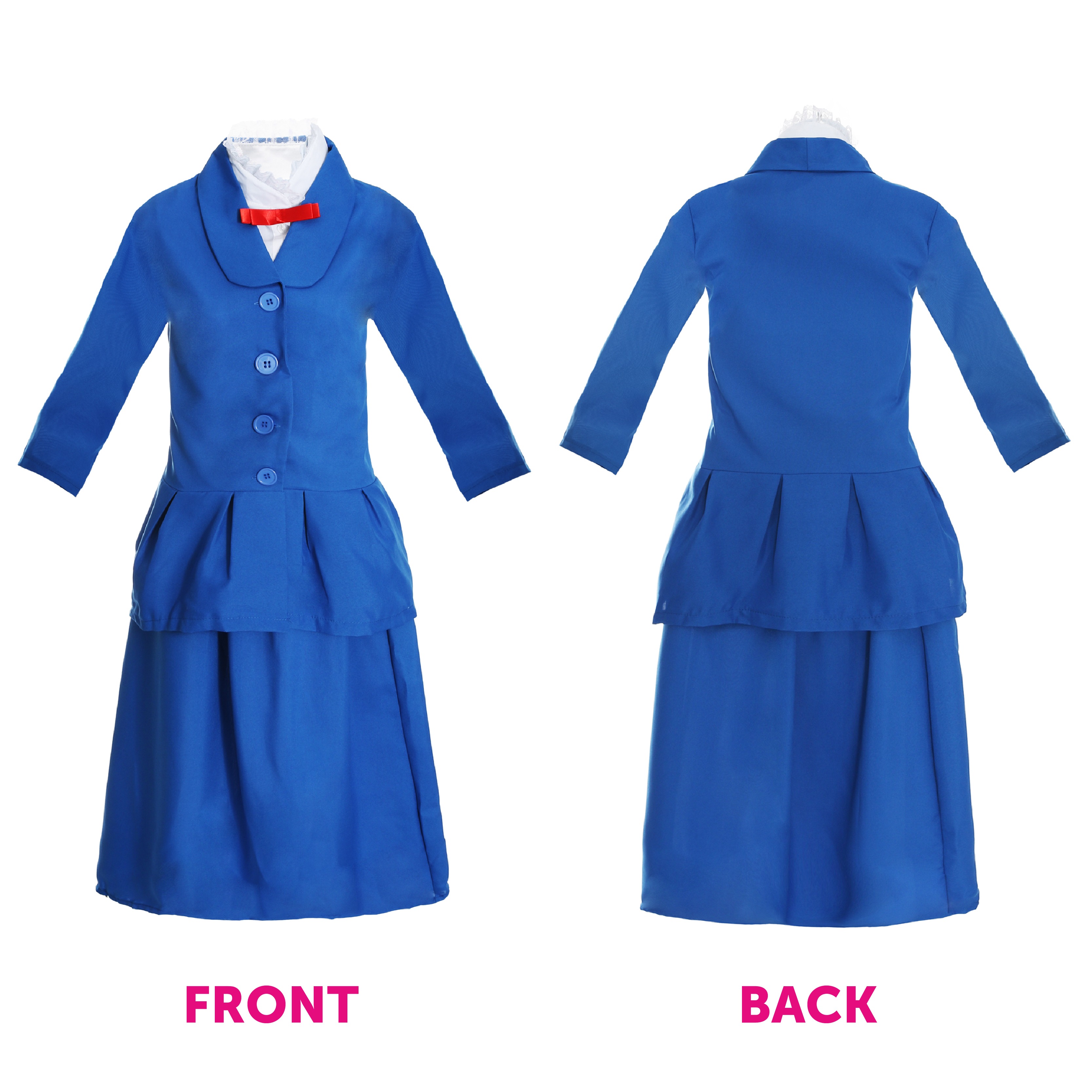 Royal Blue Jacket & Skirt – Button-up jacket with attached white blouse and red bow tie, paired with a matching long blue skirt for an authentic storybook look.
