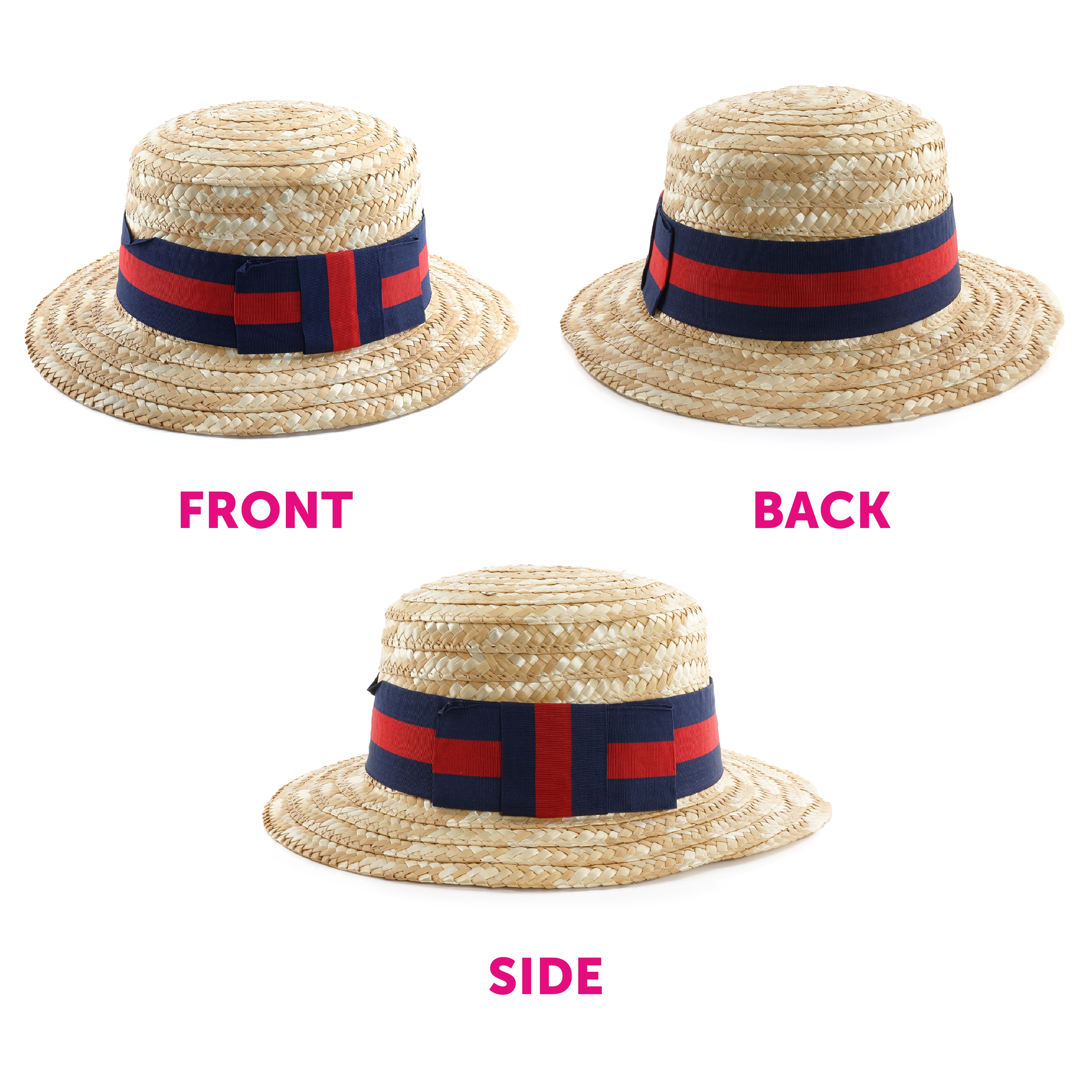 Straw Boater Hat – Lightweight woven straw hat with a navy blue and red striped band. One size fits most (up to 56cm / 22") with an inner brim for a secure fit.