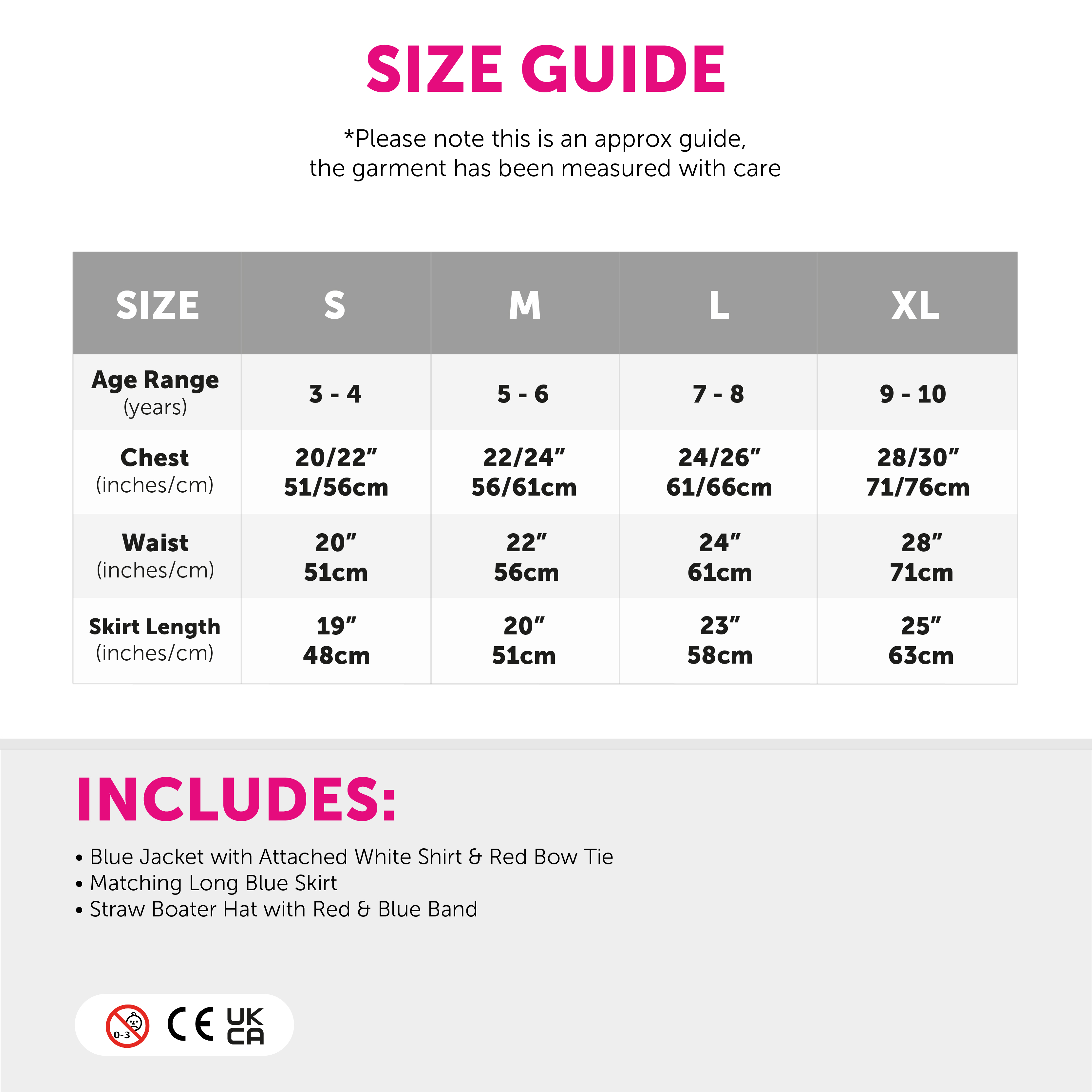 AVAILABLE IN MULTIPLE SIZES: Our Child's Magical Nanny Costume is available in sizes Small – X-Large: Small (3 - 4 years) Chest 20/22" (51/56cm), Waist 20" (51cm), Skirt Length 19" (48cm) | Medium (5 - 6 years) Chest 22/24" (56/61cm), Waist 22" (56cm), Skirt Length 20" (51cm) | Large (7 - 8 years) Chest 24/26" (61/66cm), Waist 24" (61cm), Length 23" (58cm) | X-Large (9 - 10 years) Chest 28/30" (71/76cm), Waist 28" (71cm), Length 25" (63cm)
