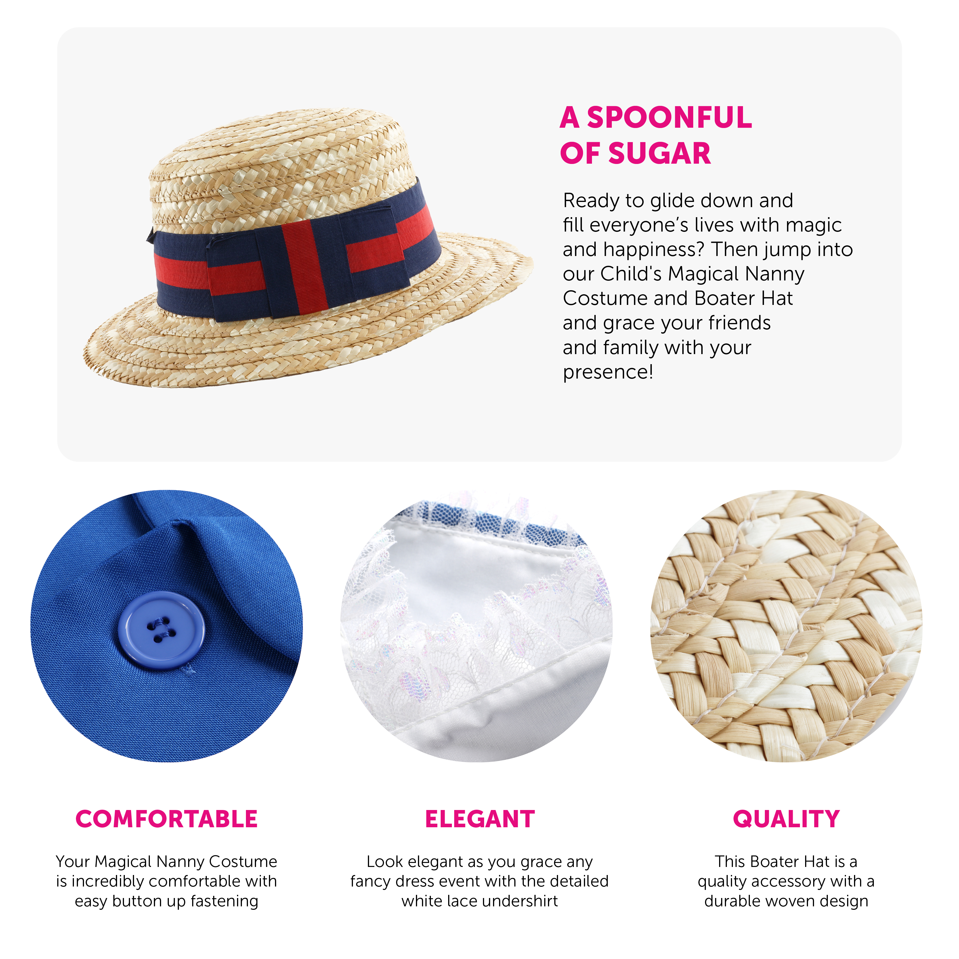 CHILDS MAGICAL NANNY COSTUME & BOATER HAT: Ready to glide down and fill everyone’s lives with magic and happiness? Then jump into our Child's Magical Nanny Costume and Boater Hat and grace your friends and family with your presence!