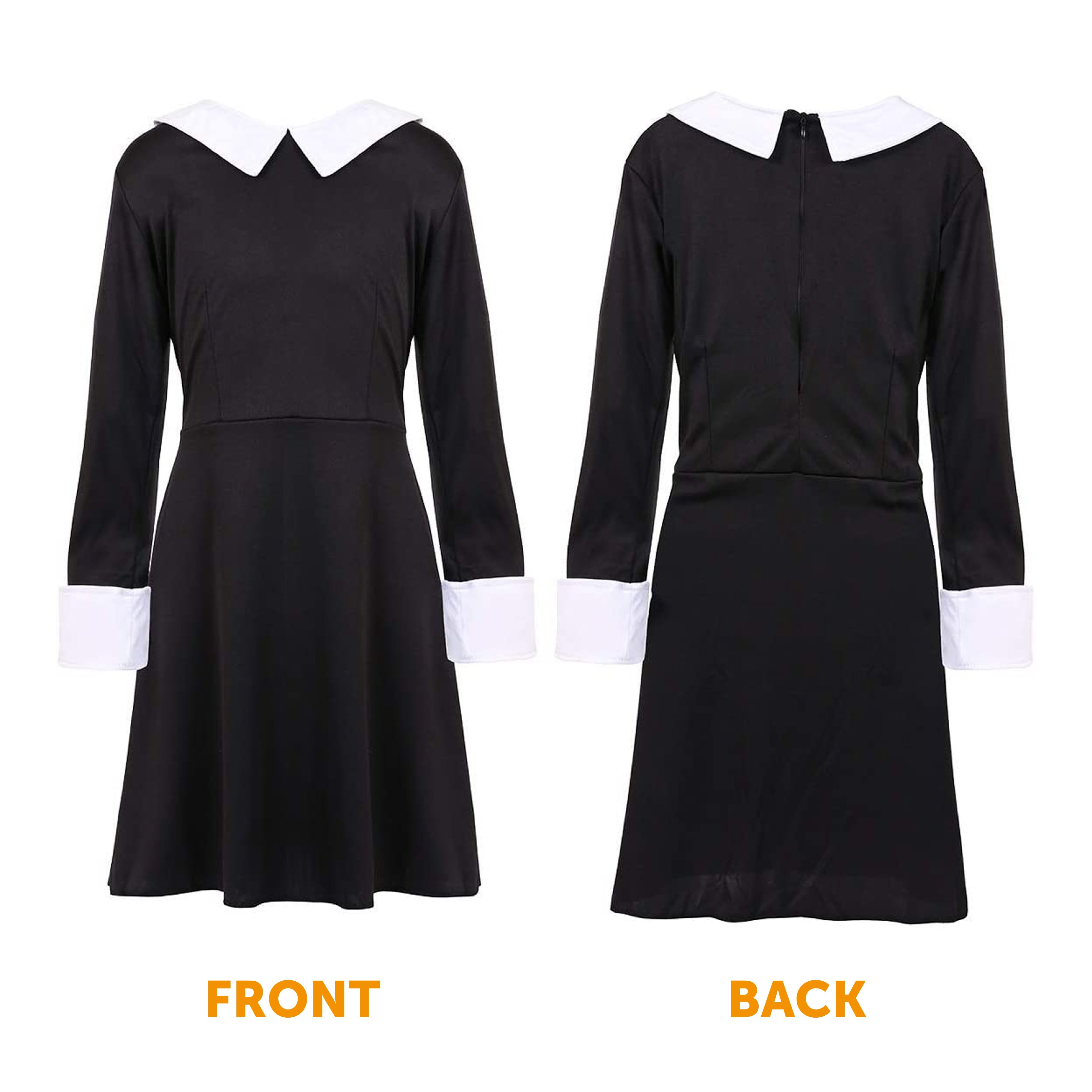 - Long sleeve black dress with white collar and white sleeve panels