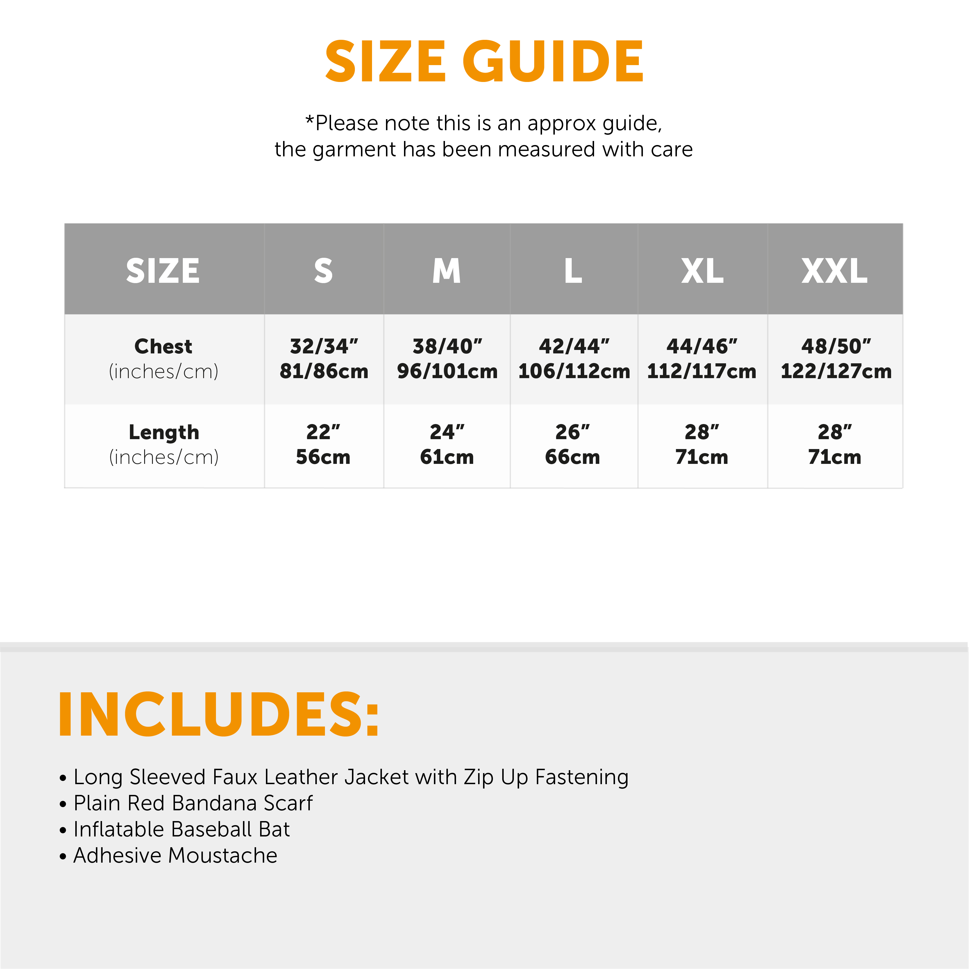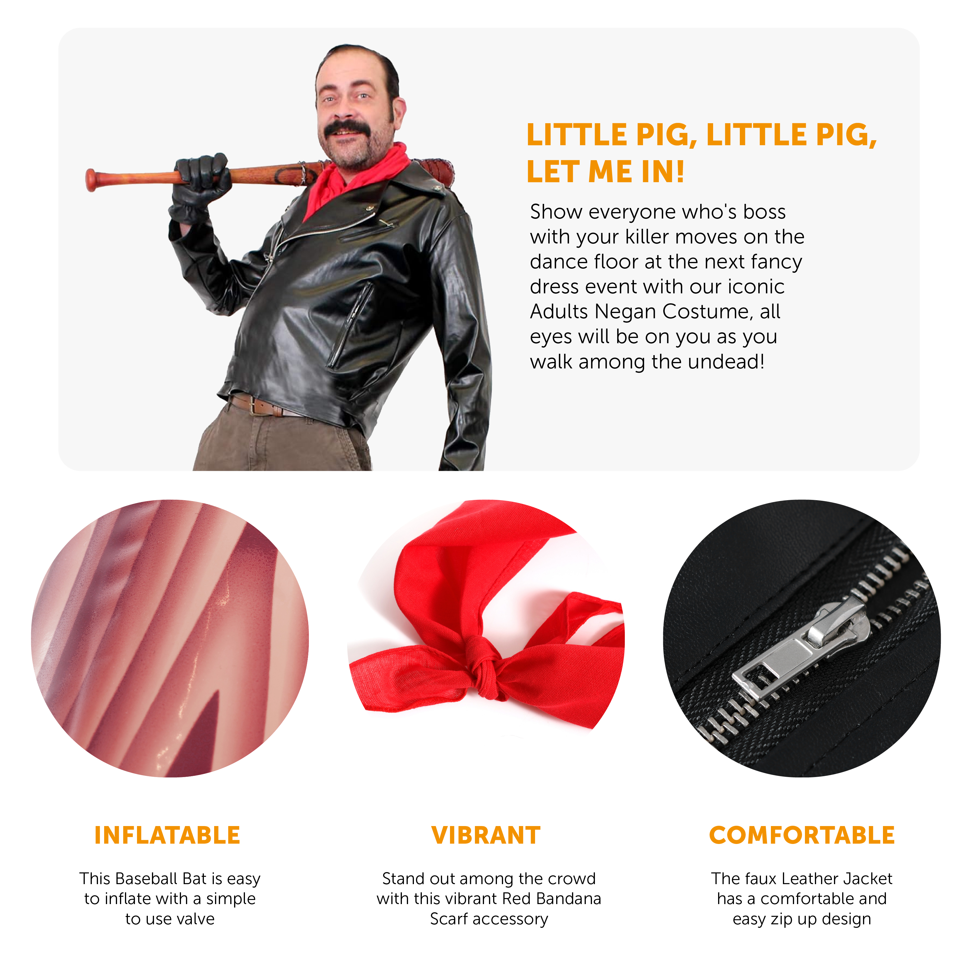 COSTUME INCLUDES: This Adults Negan Costume includes a black, long sleeved, Faux Leather Jacket with comfortable zip up fastening, a Plain Red Bandana Scarf, an easy to inflate Baseball Bat, and an adhesive Moustache, the perfect Costume for any fancy dress event!