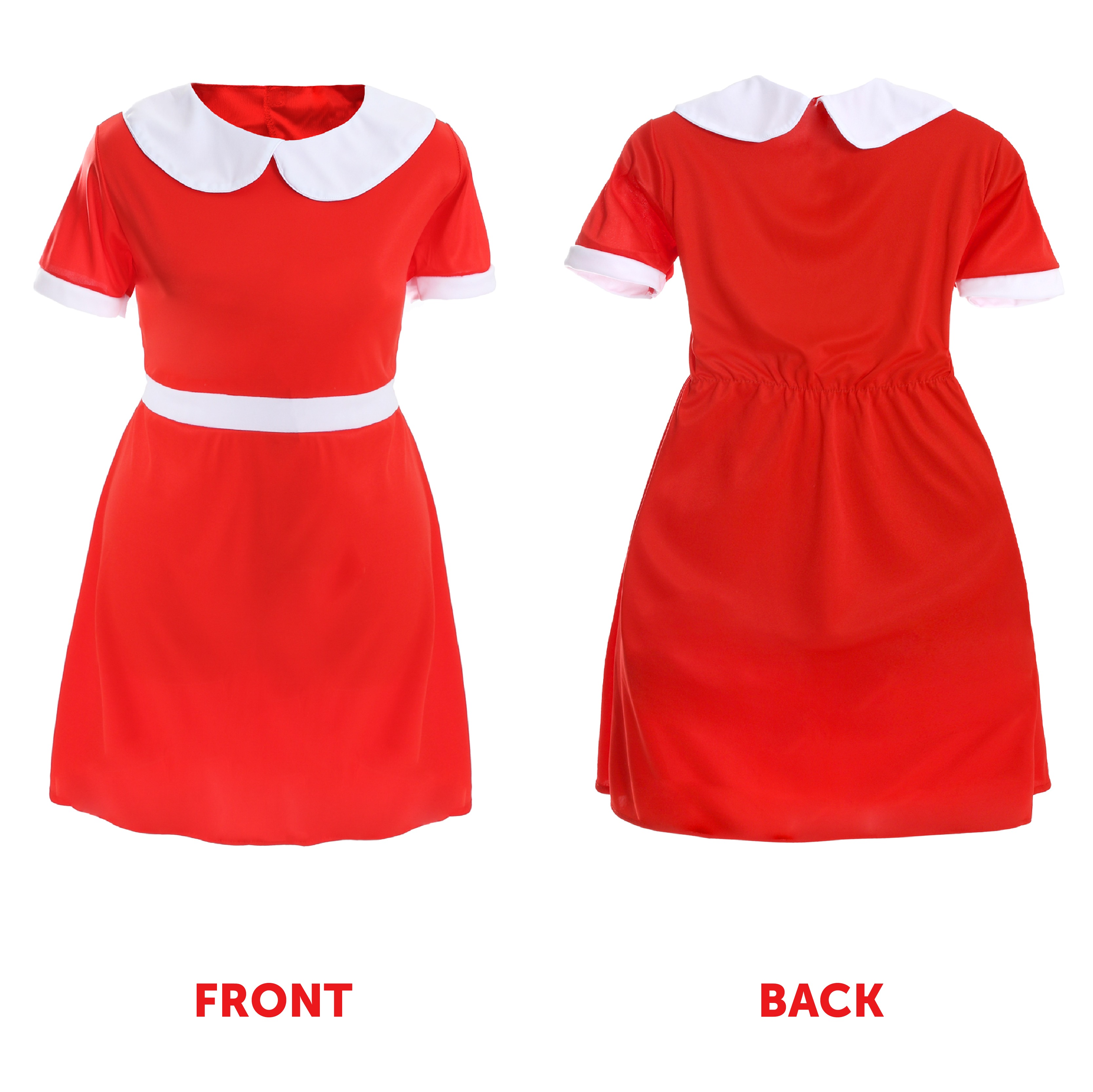 A vibrant red dress featuring classic white collar and cuff detailing for a sweet, storybook finish.