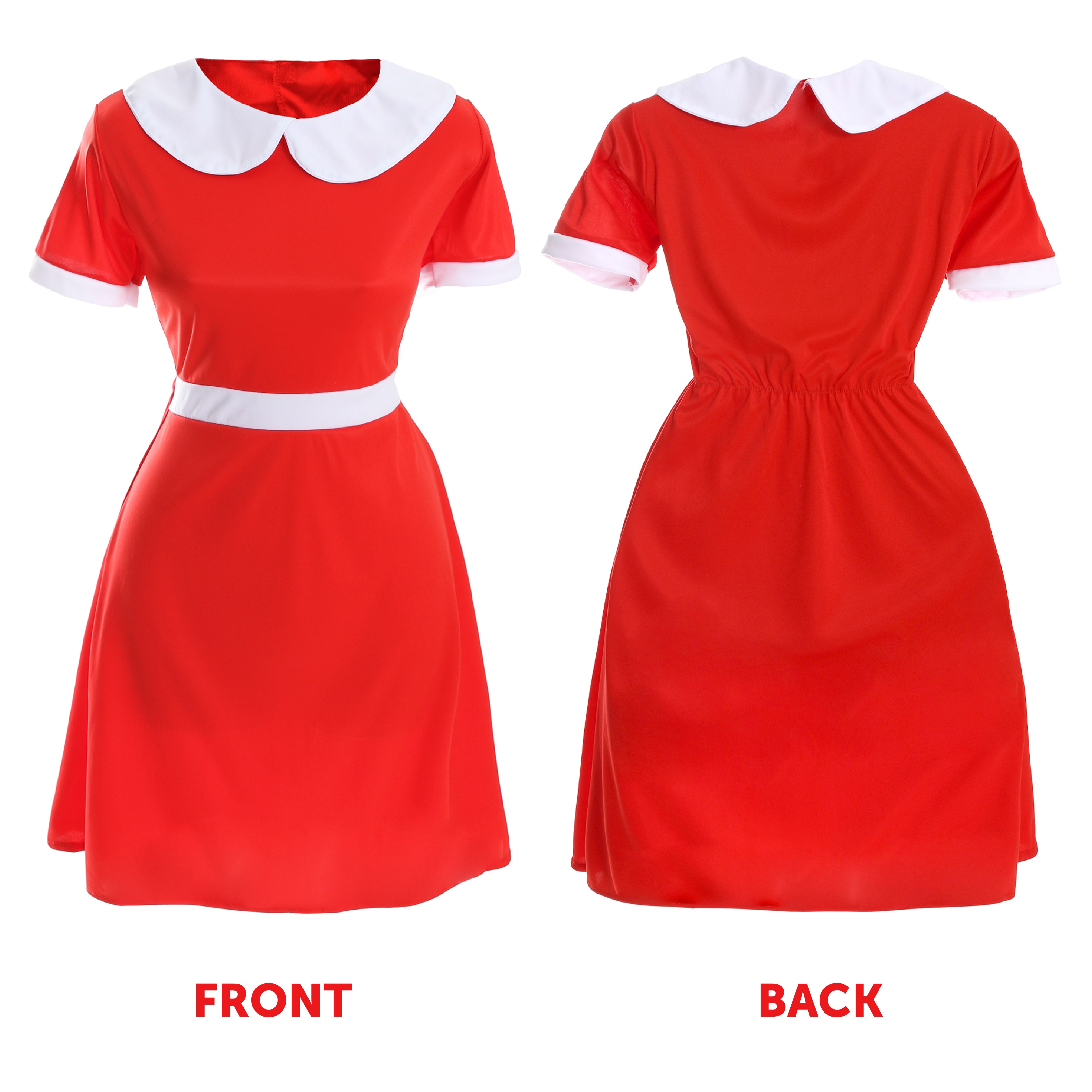 A bold red dress designed with classic white collar and cuff detailing for a sweet, storybook-style finish.