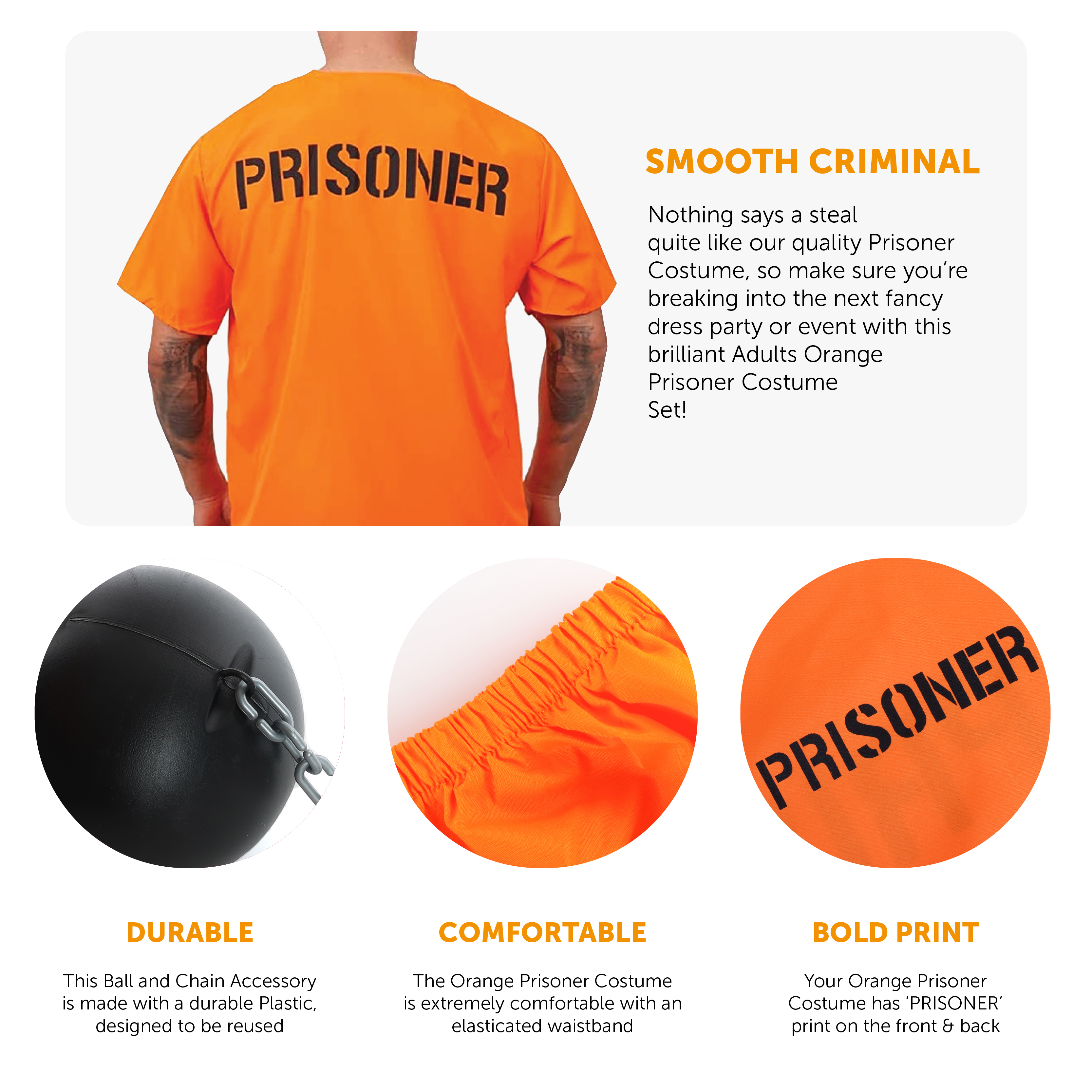 COSTUME INCLUDES: This Adults Prisoner Costume Set includes a vibrant Orange Top with ‘PRISONER’ printed on the front and back, matching Orange Trousers with an elasticated waistband, a Plastic Ball and Chain accessory, and a Plastic Neck Chain with Wrist Cuffs, the perfect Costume for any fancy dress party!