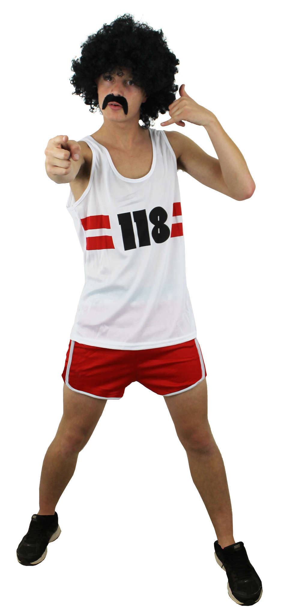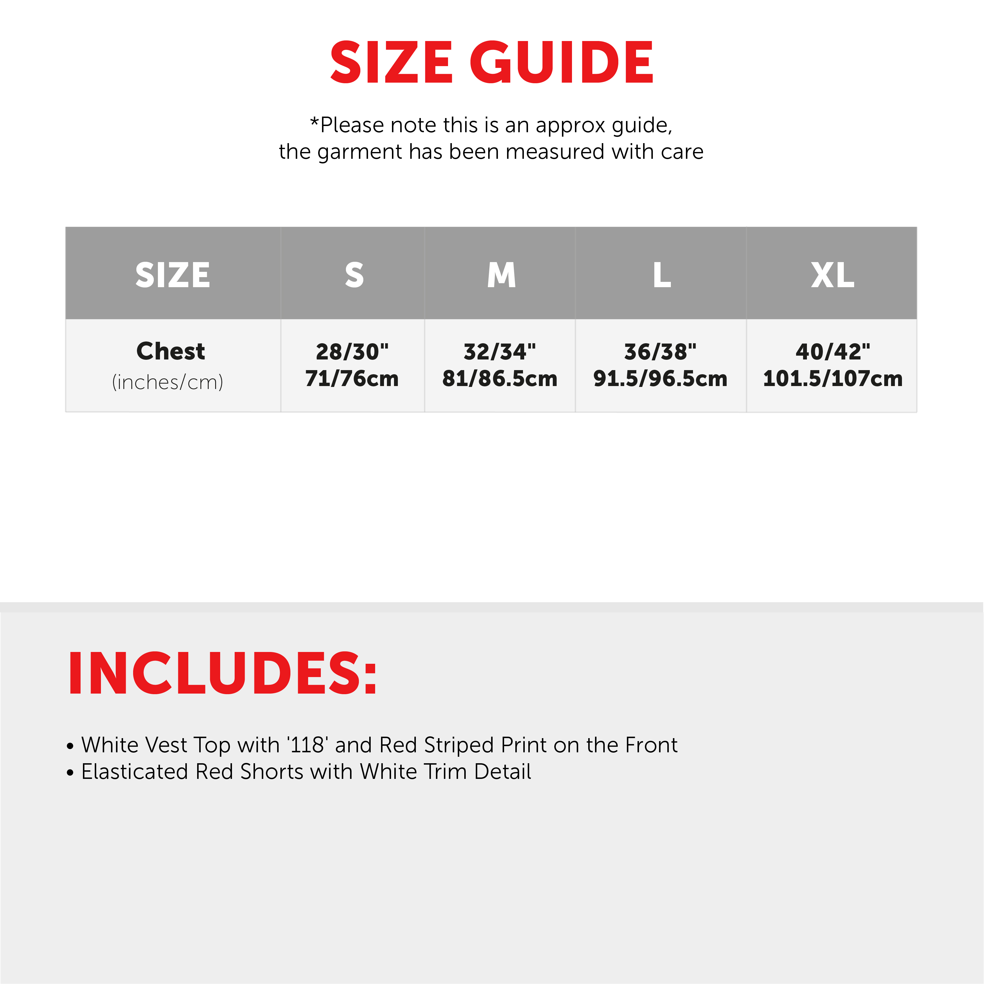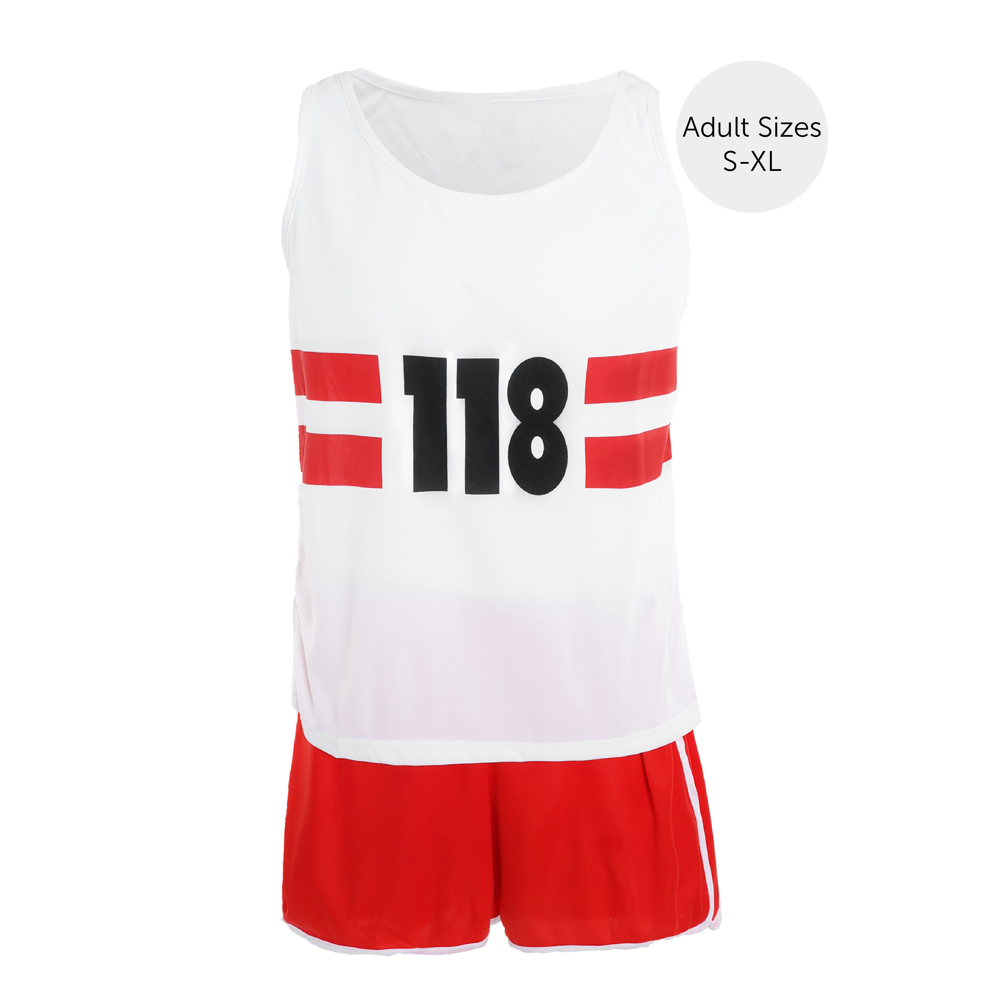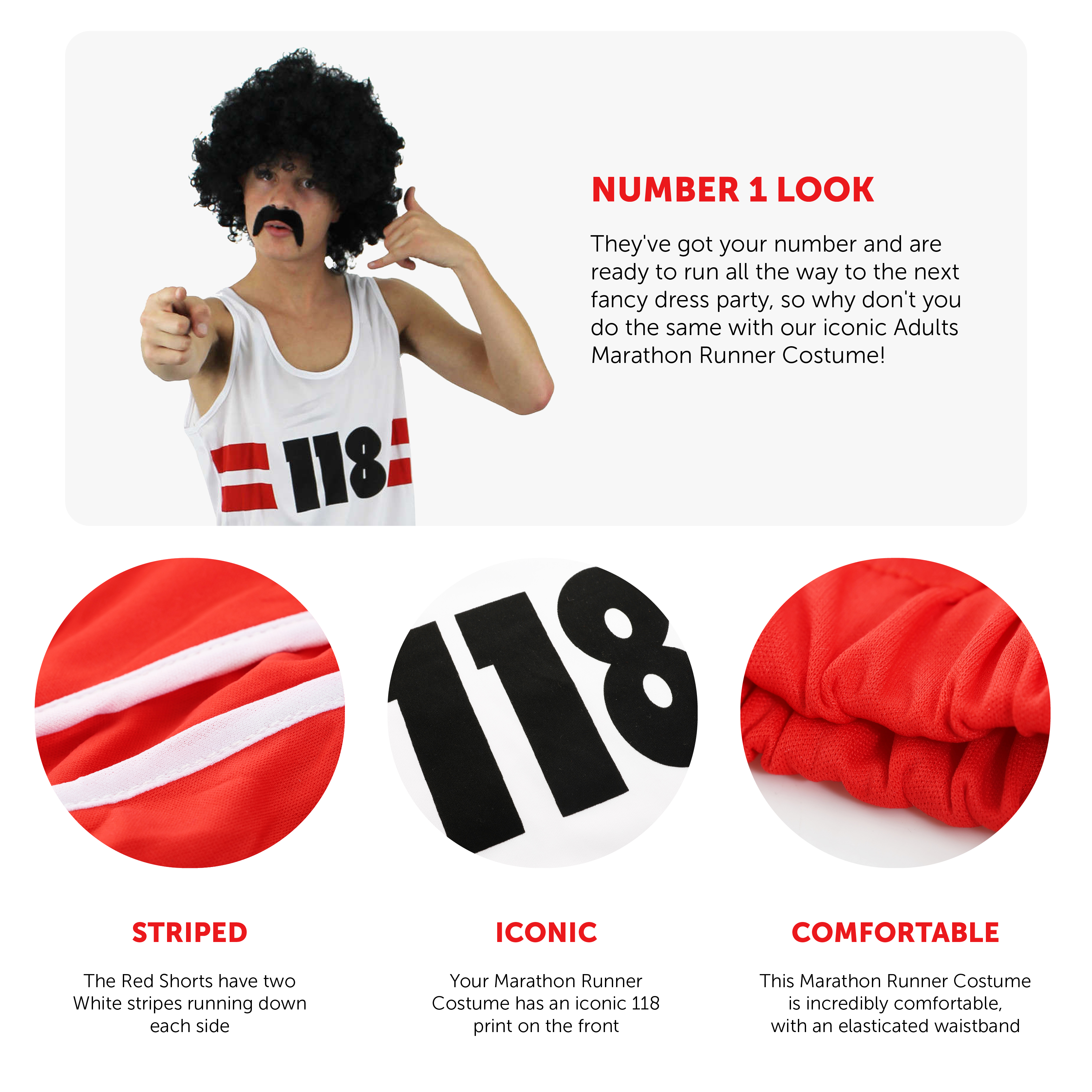 COSTUME DETAILS: Your Adults Marathon Runner Costume includes a White Vest Top with '118' Print on the front and Red Shorts with White Trim detail, the perfect Costume for any event!
