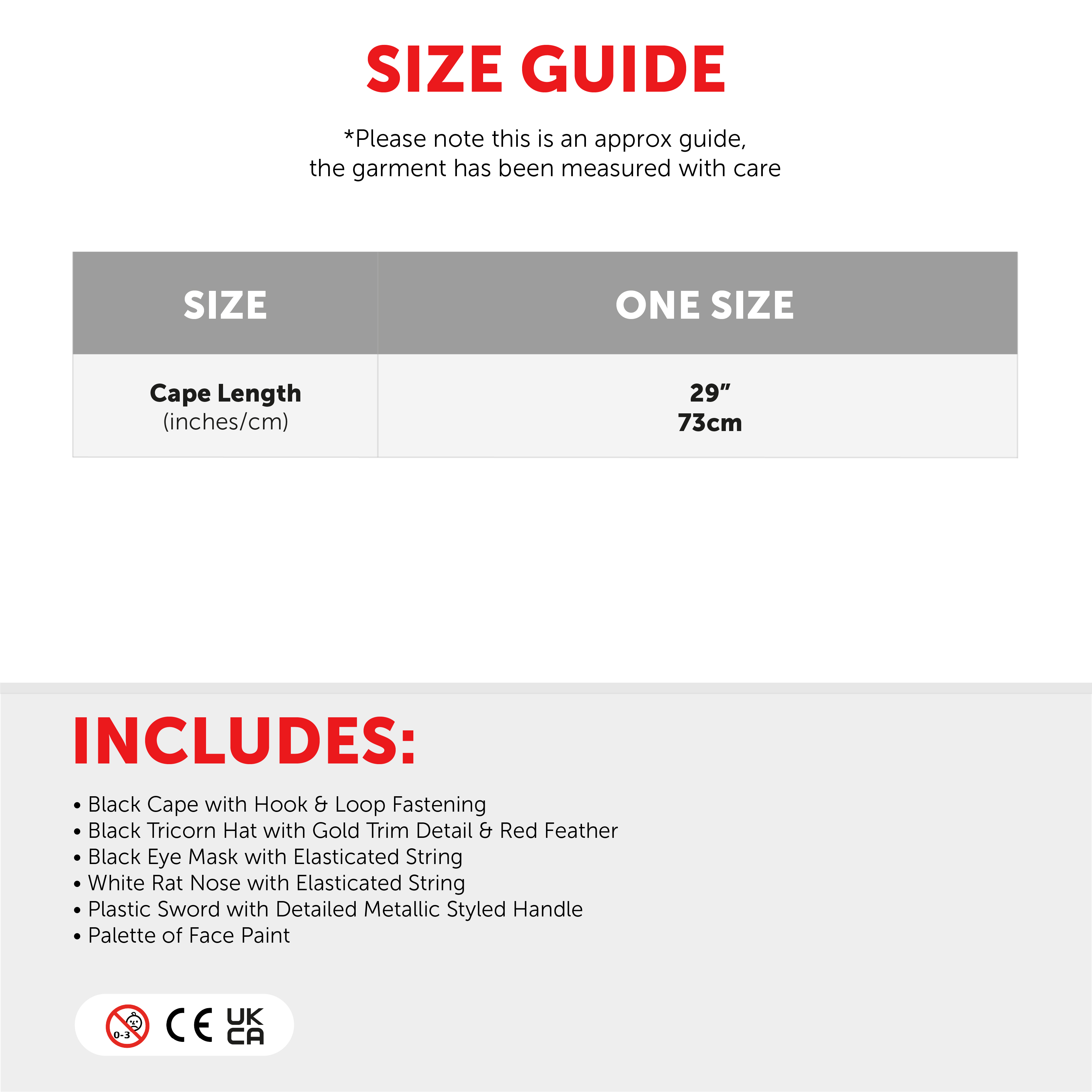COSTUME SET INCLUDES: Your Child's Highway Rodent Costume Set includes a Silver Sword, a Black Cape, a Tricorn Hat with Gold detailing and a Red Feather, Black Eye Mask, a Rat Nose on Elastic String, and a palette of Face Paint!