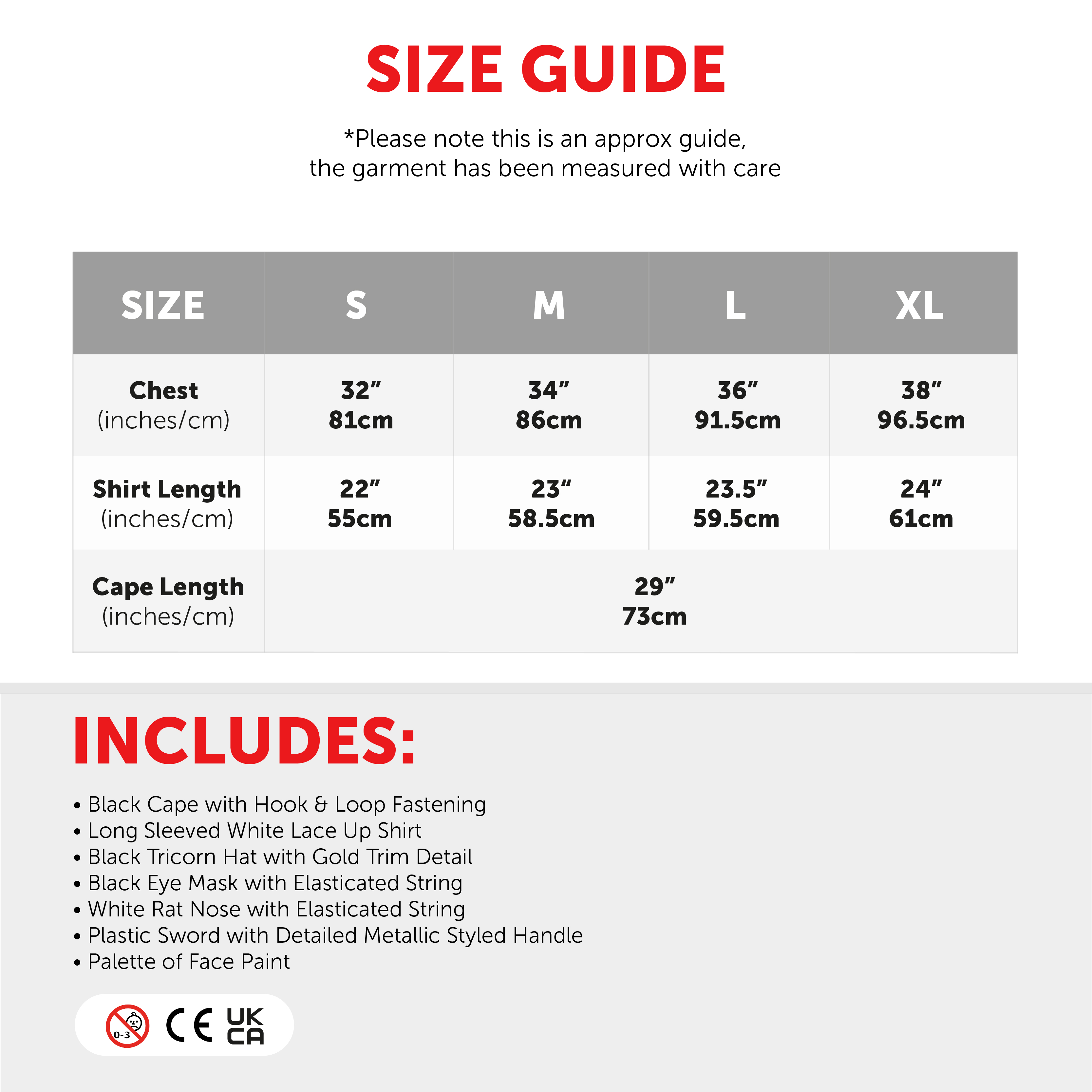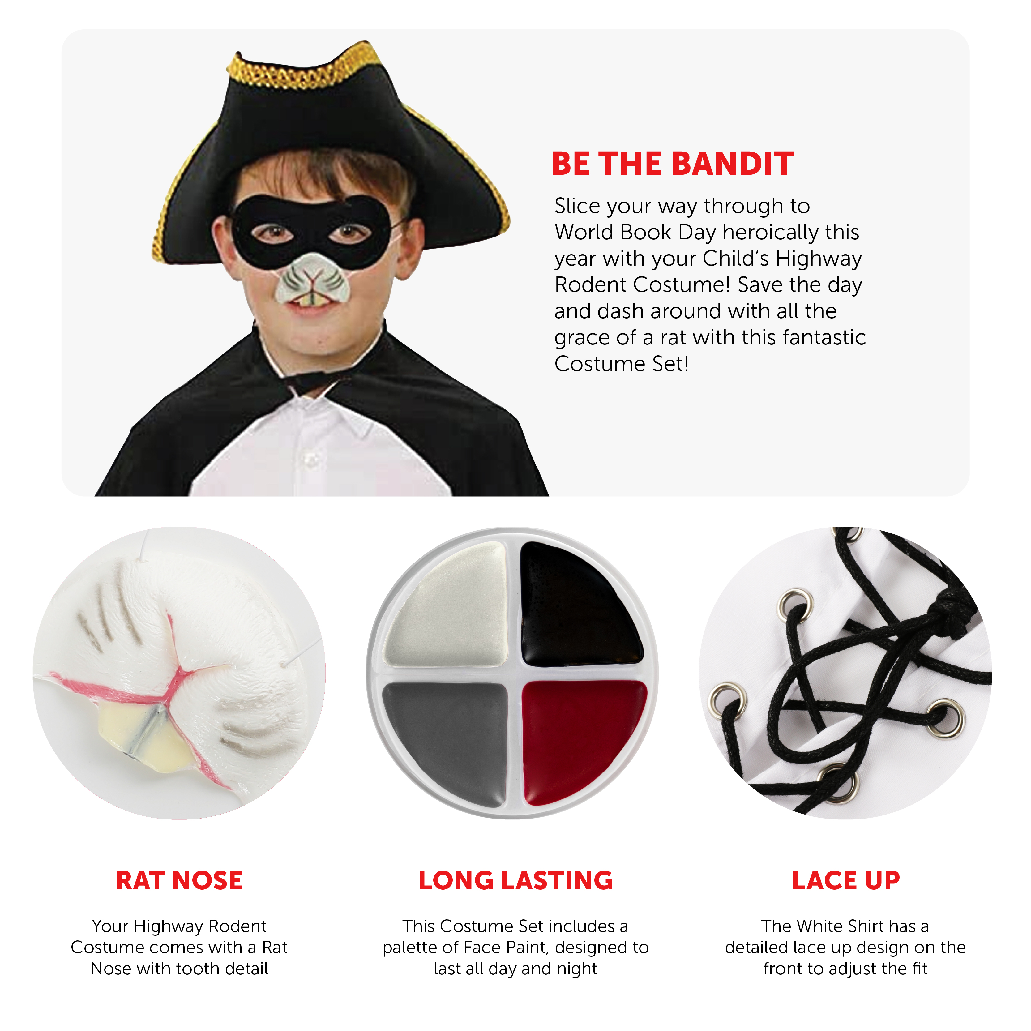 COSTUME SET INCLUDES: Your Child's Highway Rodent Costume Set includes a Silver Sword, a Black Cape, a Tricorn Hat with Gold detailing, Black Eye Mask, a Rat Nose on Elastic String, a White Lace Up Shirt, and a palette of Face Paint!