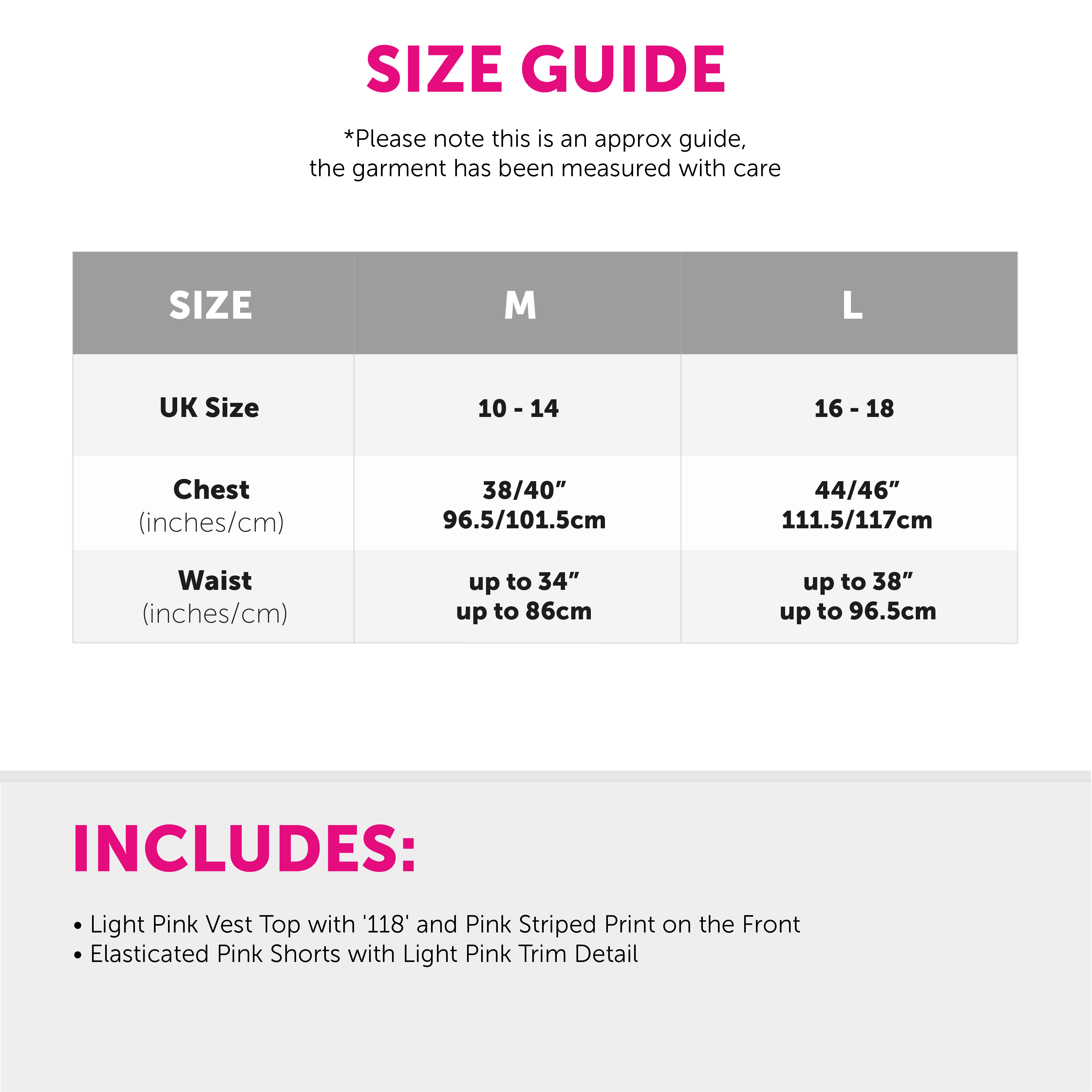AVAILABLE IN MULTIPLE SIZES: This Ladies Pink 118 Marathon Costume is available in two sizes, Medium and Large: Medium - (UK 10-14), Chest: 38/40" (96.5/101.5cm), Waist: up to 34" (86cm) | Large - (UK 16-18), Chest: 44/46" (111.5/117cm), Waist: up to 38" (96.5cm)