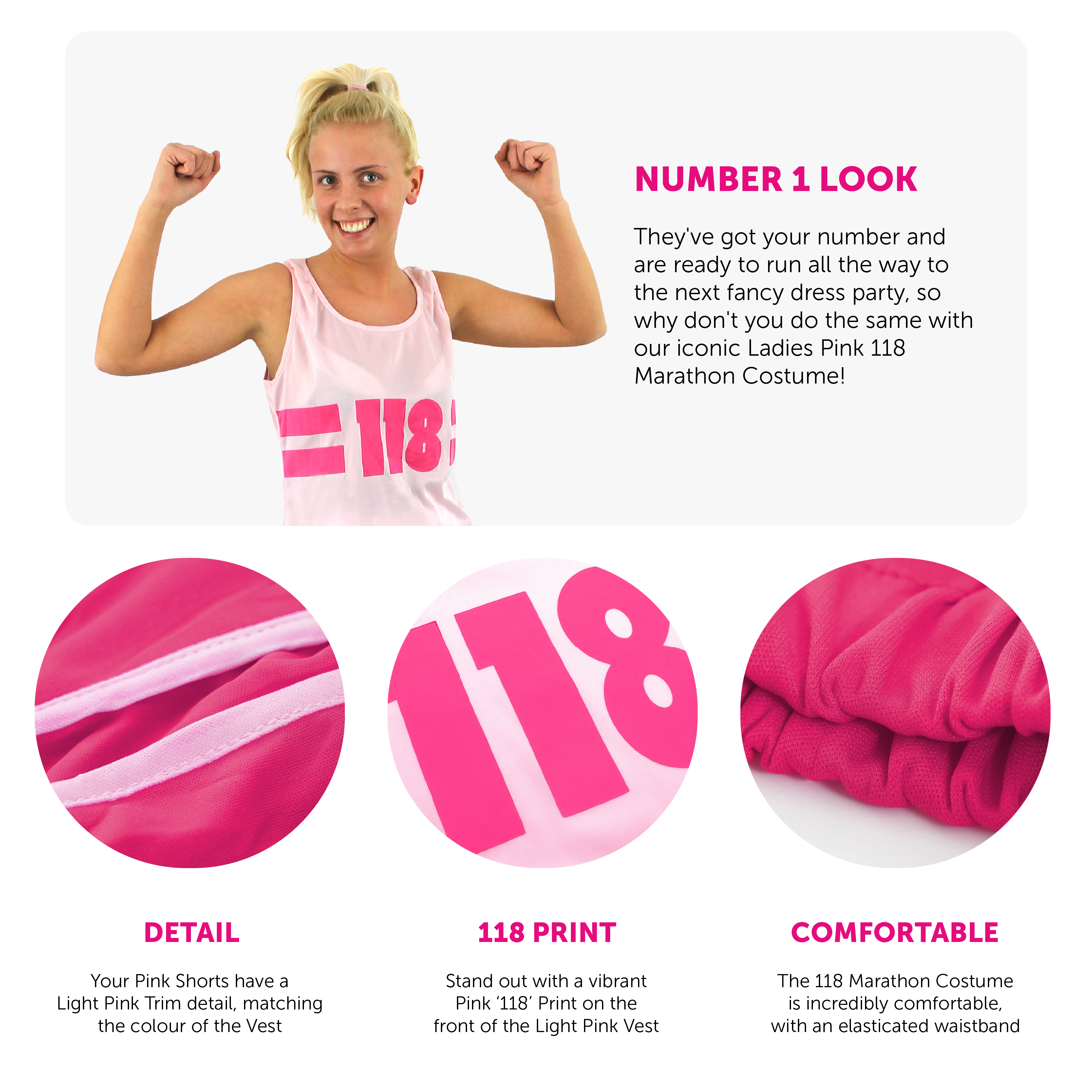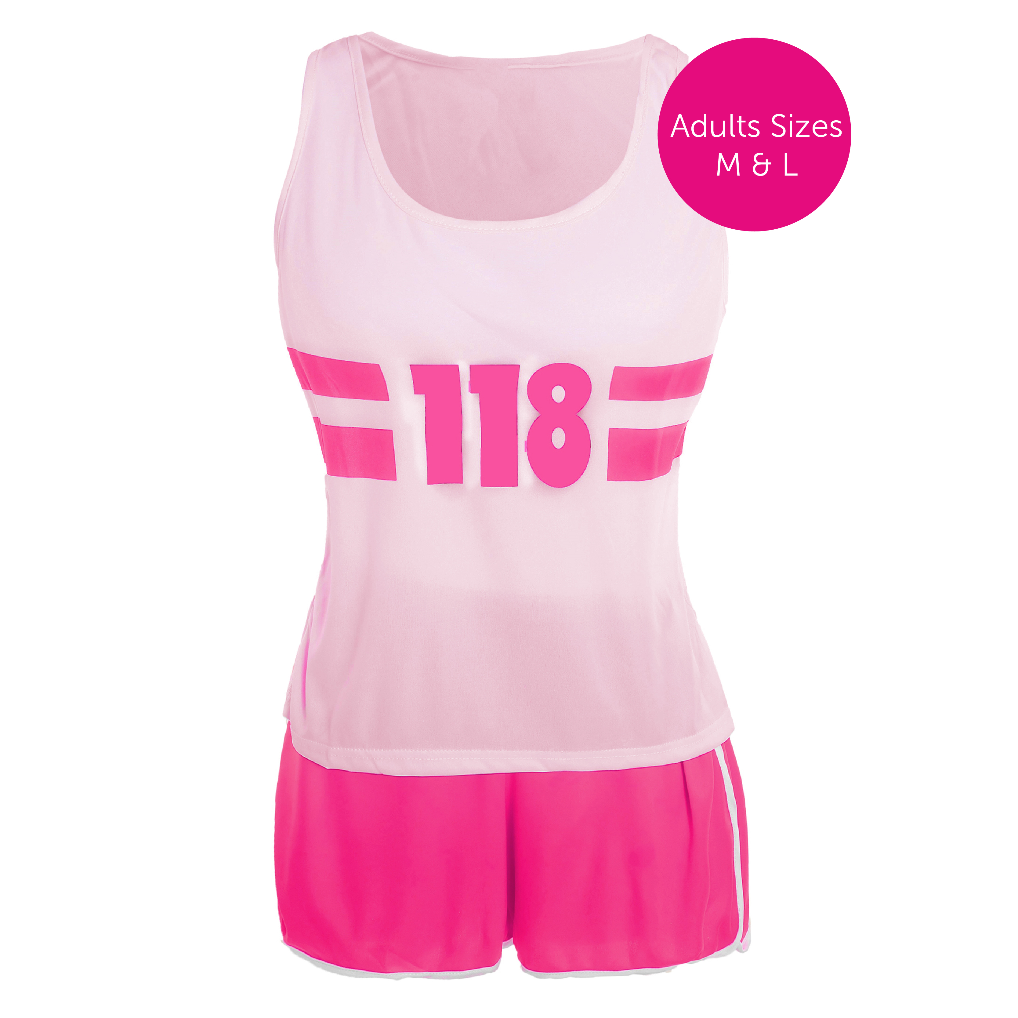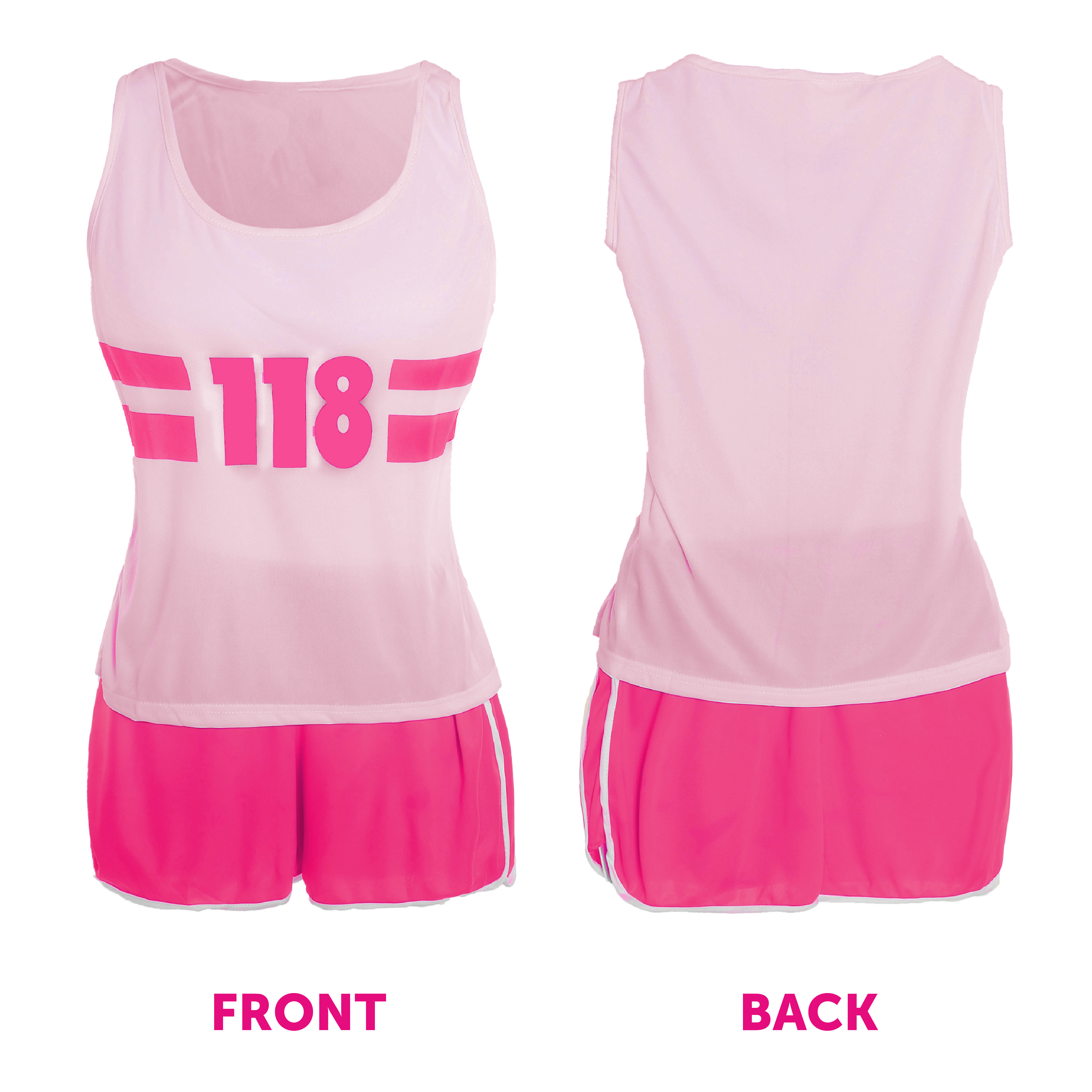 COSTUME DETAILS: Your Ladies 118 Marathon Costume includes a Light Pink Vest Top with a vibrant Pink '118' Print on the front and Pink Shorts with Light Pink Trim detail and an elasticated waistband, the perfect choice for any fancy dress event!