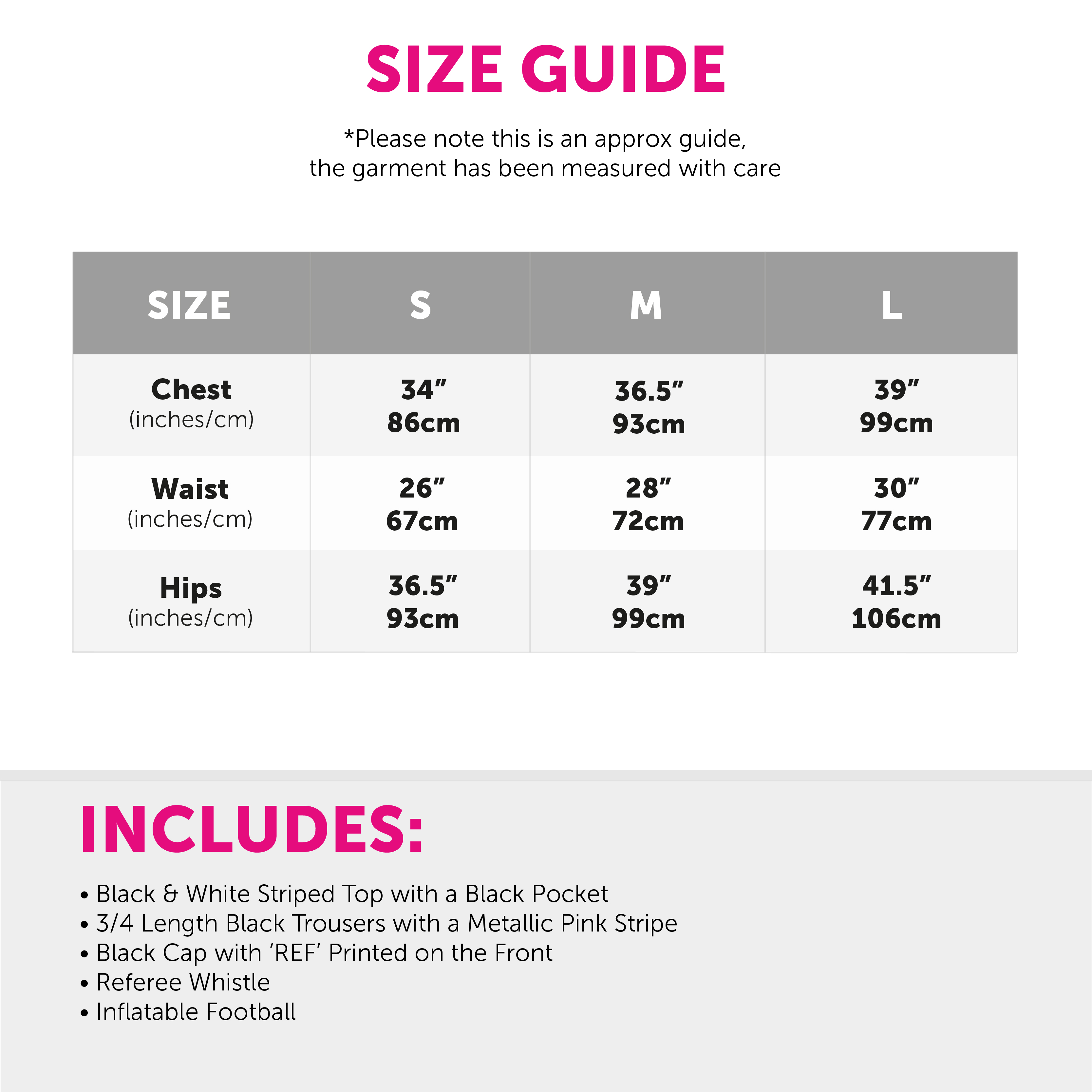 AVAILABLE IN MULTIPLE SIZES: This Stag Do Referee Costume is available in various sizes, from Small to Large: Small - Chest 34" (86cm), Waist 26" (67cm), Hips 36.5" (93cm) | Medium - Chest 36.5" (93cm), Waist 28" (72cm), Hips 39" (99cm) | Large - Chest 39" (99cm), Waist 30" (77cm), Hips 41.5" (106cm)