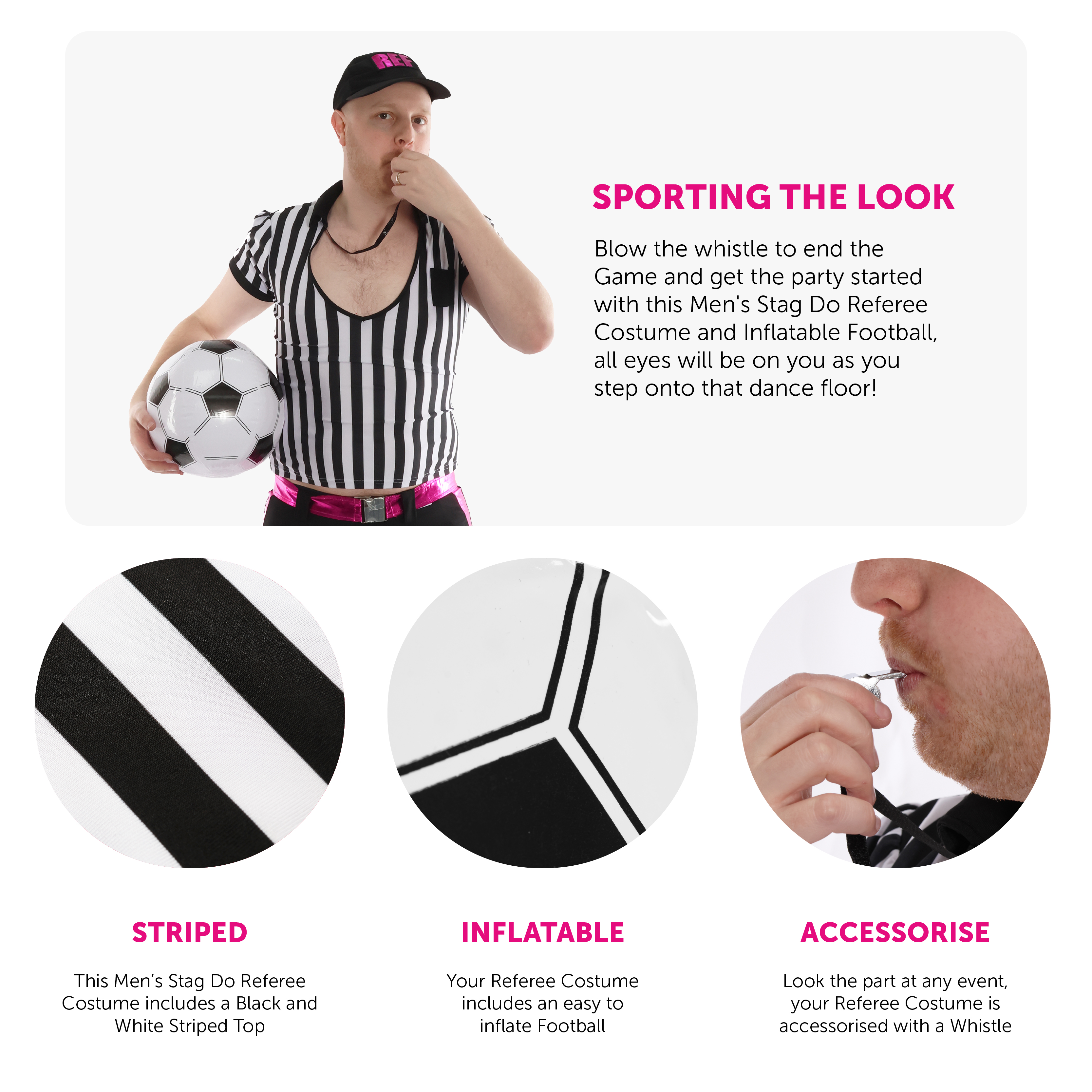COSTUME DETAILS: Your Men's Stag Do Referee Costume includes a Black and White Striped Short Sleeve T Shirt, Black 3/4 Length Trousers with a Hot Pink Line down the sides, a Black Referee Cap with 'REF' printed on the front, and an easy to inflate Football!