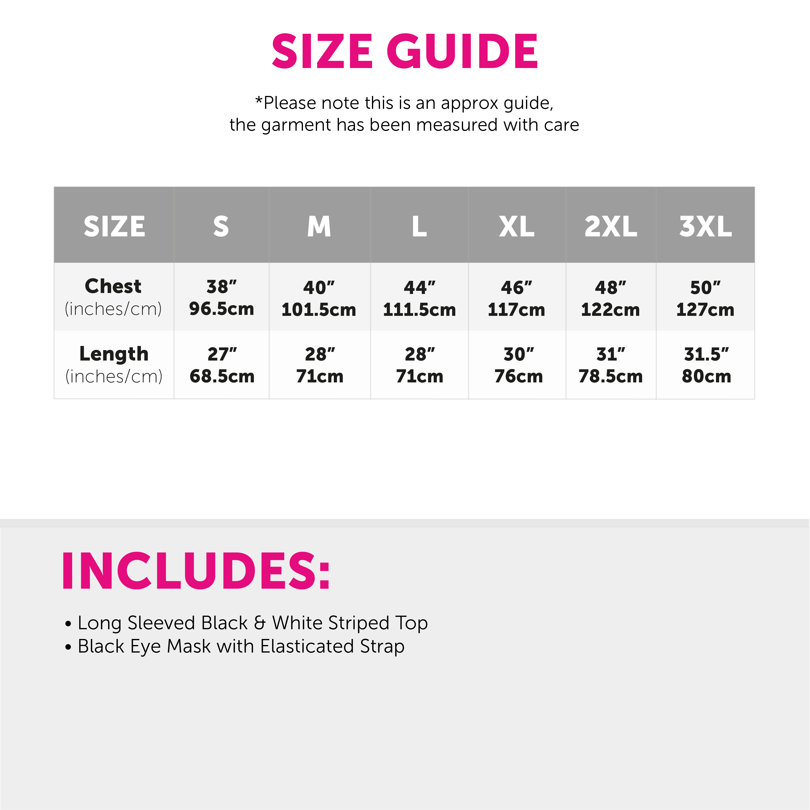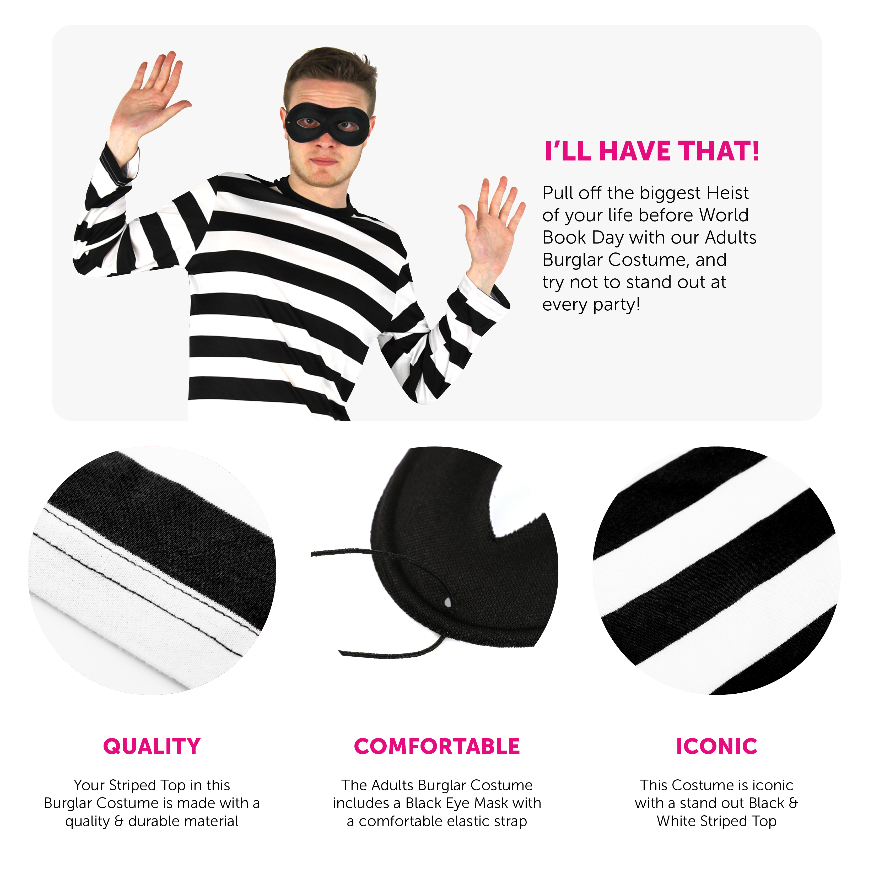 COSTUME SET INCLUDES: This Adults Burglar Costume includes a Long Sleeved Black and White Striped Top, and a Black Eye Mask on a comfortable elasticated strap, the perfect look for you this World Book Day!