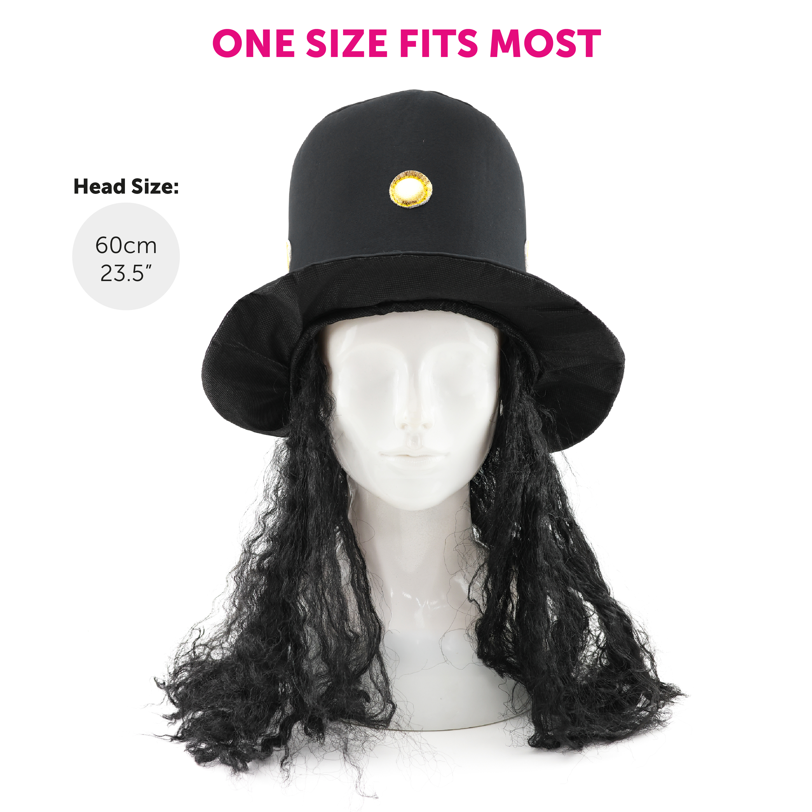 ACCESSORY SET INCLUDES: This Accessory Set includes a tall Black Top Hat with Gold detail and long hair attached, Gold Frame Sunglasses, and a Silver Cross Necklace!