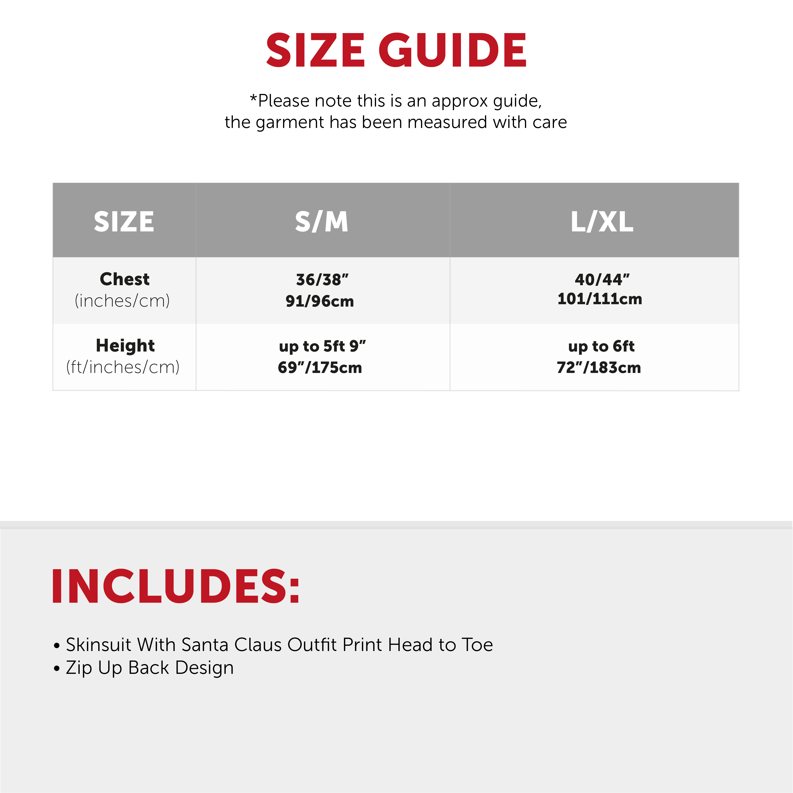 AVAILABLE IN MULTIPLE SIZES: Your Adults Santa Skinsuit costume is available in multiple sizes from Small/Medium to Large/X-Large: Small-Medium: Chest: 36-38”/91-96cm, Up To Height: 5ft9”/175cm | Large-X-Large: Chest: 40-44”/101-111cm, Up To Height: 6ft/183cm