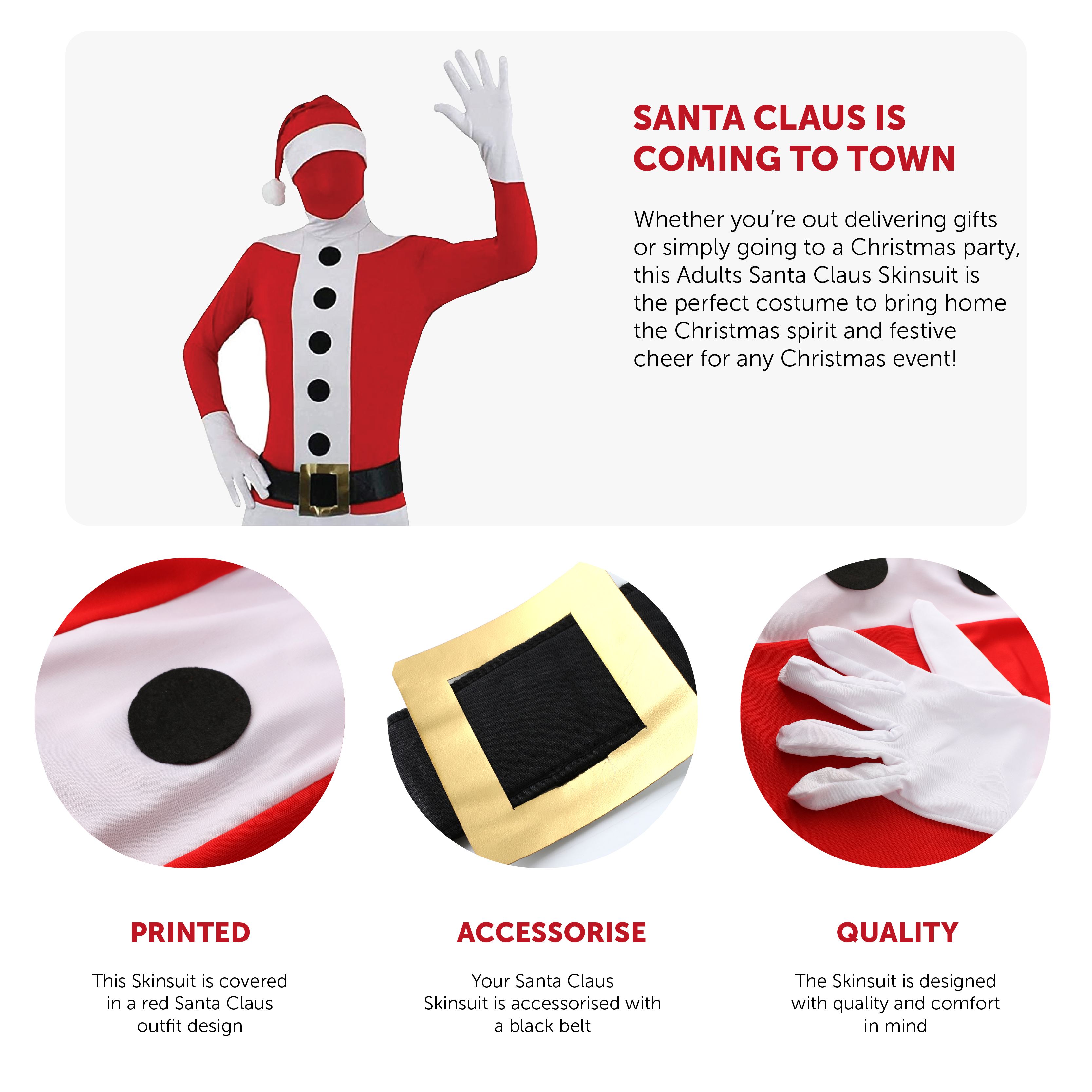 SIMPLE AND CLEAN CHRISTMAS COSTUME: If you’re looking to jump straight into a costume for your Christmas parties and occasions, then this Santa Skinsuit Costume is perfect for you!