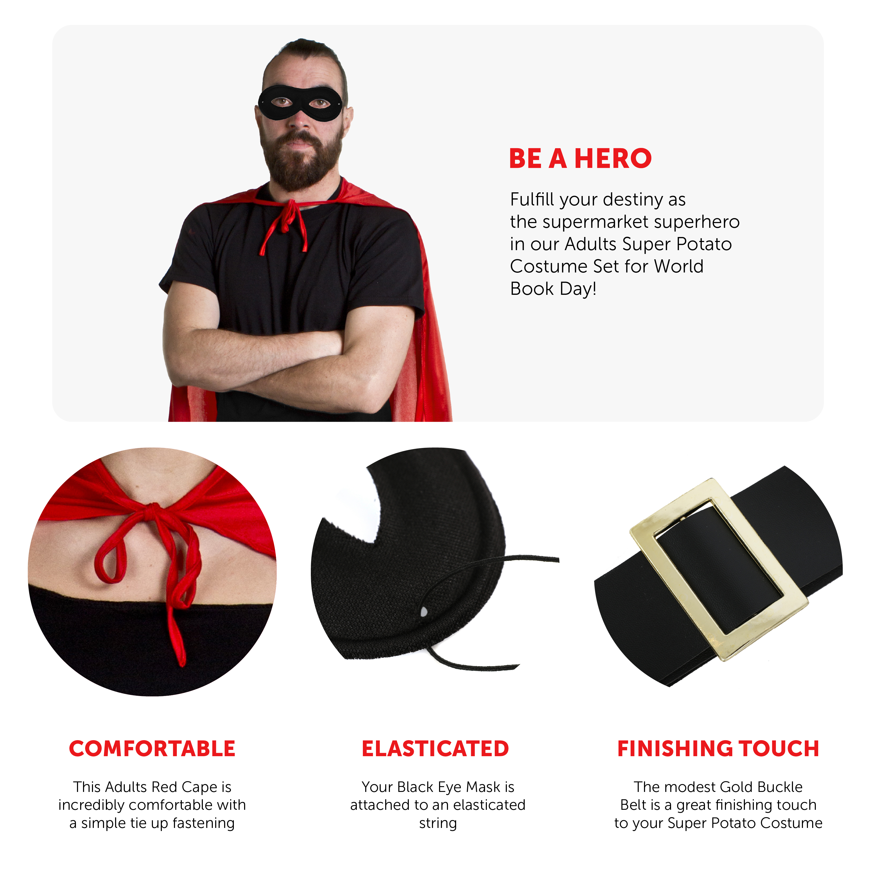 SET DETAILS: Your Adults Super Potato Set includes a Red Hero Cape with easy fastening, a Black Belt, Orange Gloves and a Black Superhero Mask with an elasticated strap to complete your hero look!