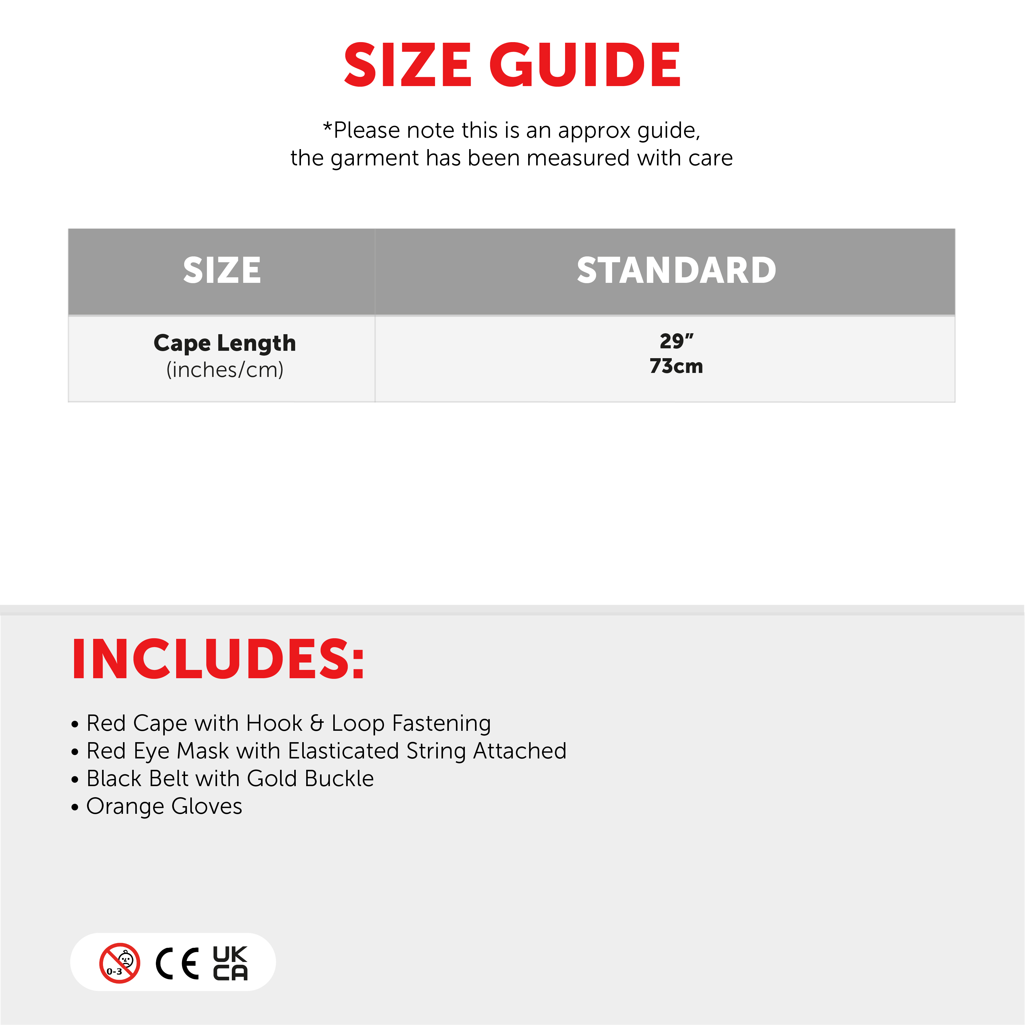 SET DETAILS: Your Child’s Super Potato Costume Hero Set includes a Child’s Red Hero Cape, a Red Eye Mask, Child’s Black Belt with Gold Buckle, and Orange Gloves to complete your hero’s look!